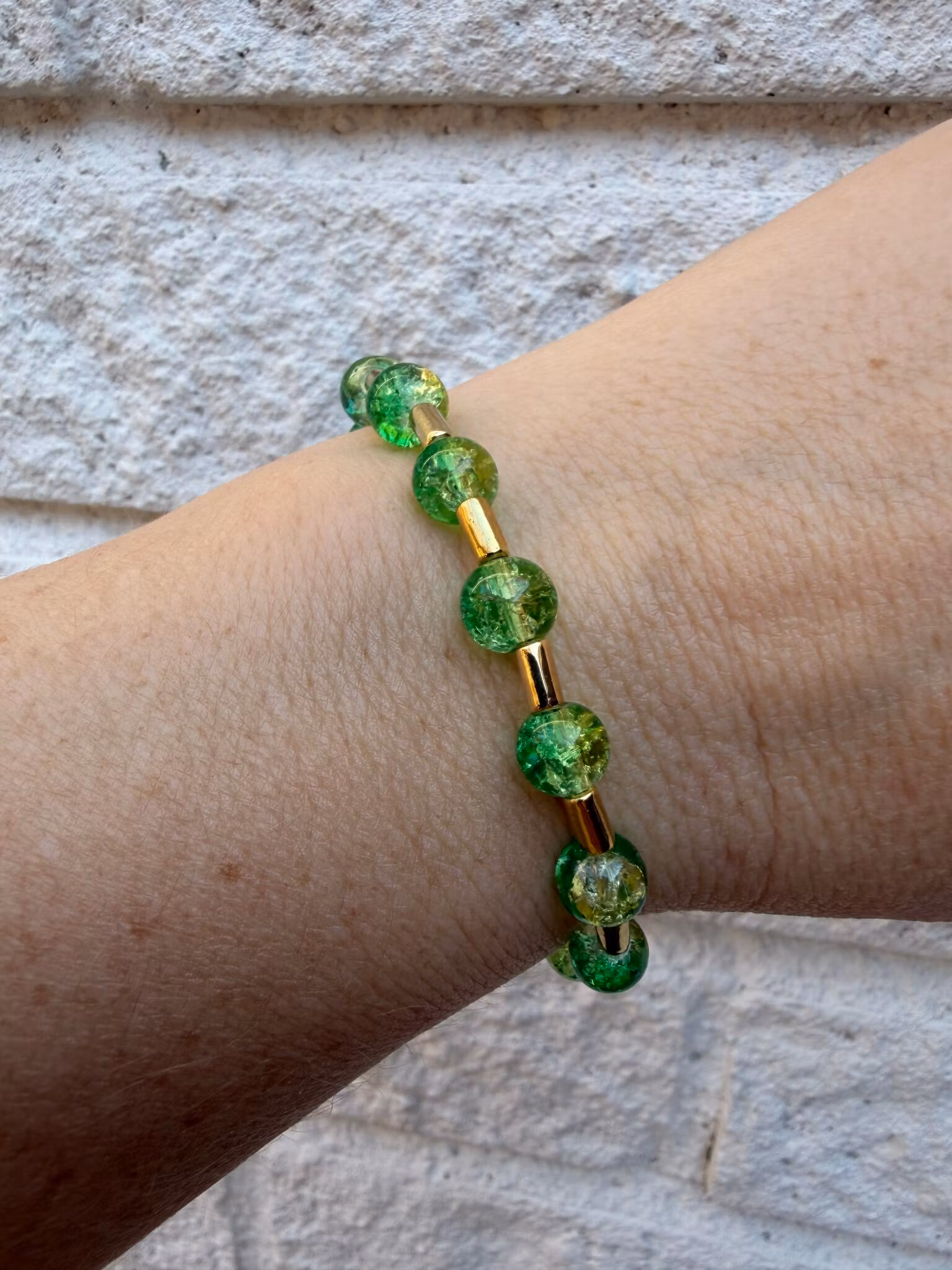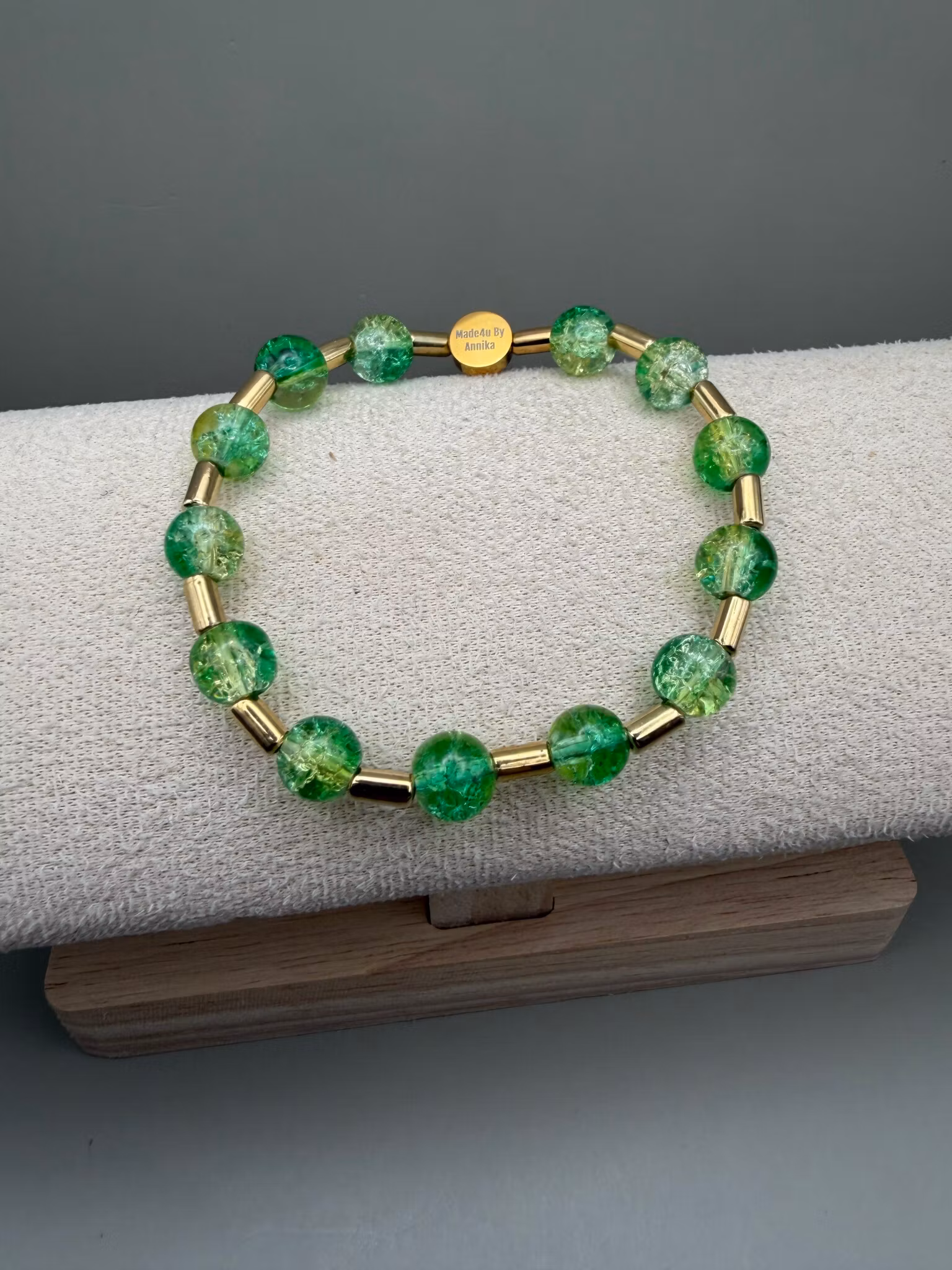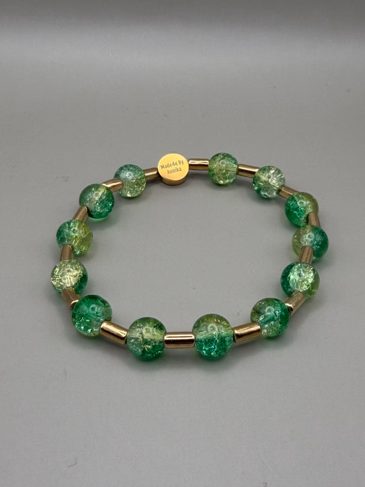Vackert armband med rundade melerade gröna pärlor, varvat med guldfärgade distanser och min signaturpärla som ger en unik och exklusiv känsla.Pärlor: 8mm, 6mm