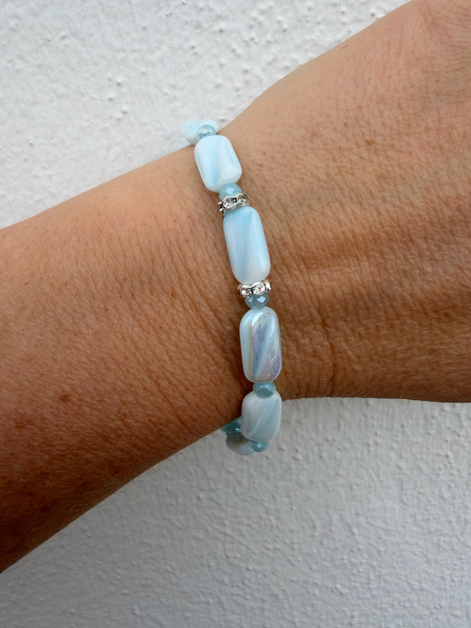 Ett vackert och somrigt armband designat med avlånga, facetterade pärlor i turkosblå nyanser som skimrar mjukt i ljuset. Pärlorna varvas med små facetterade tur