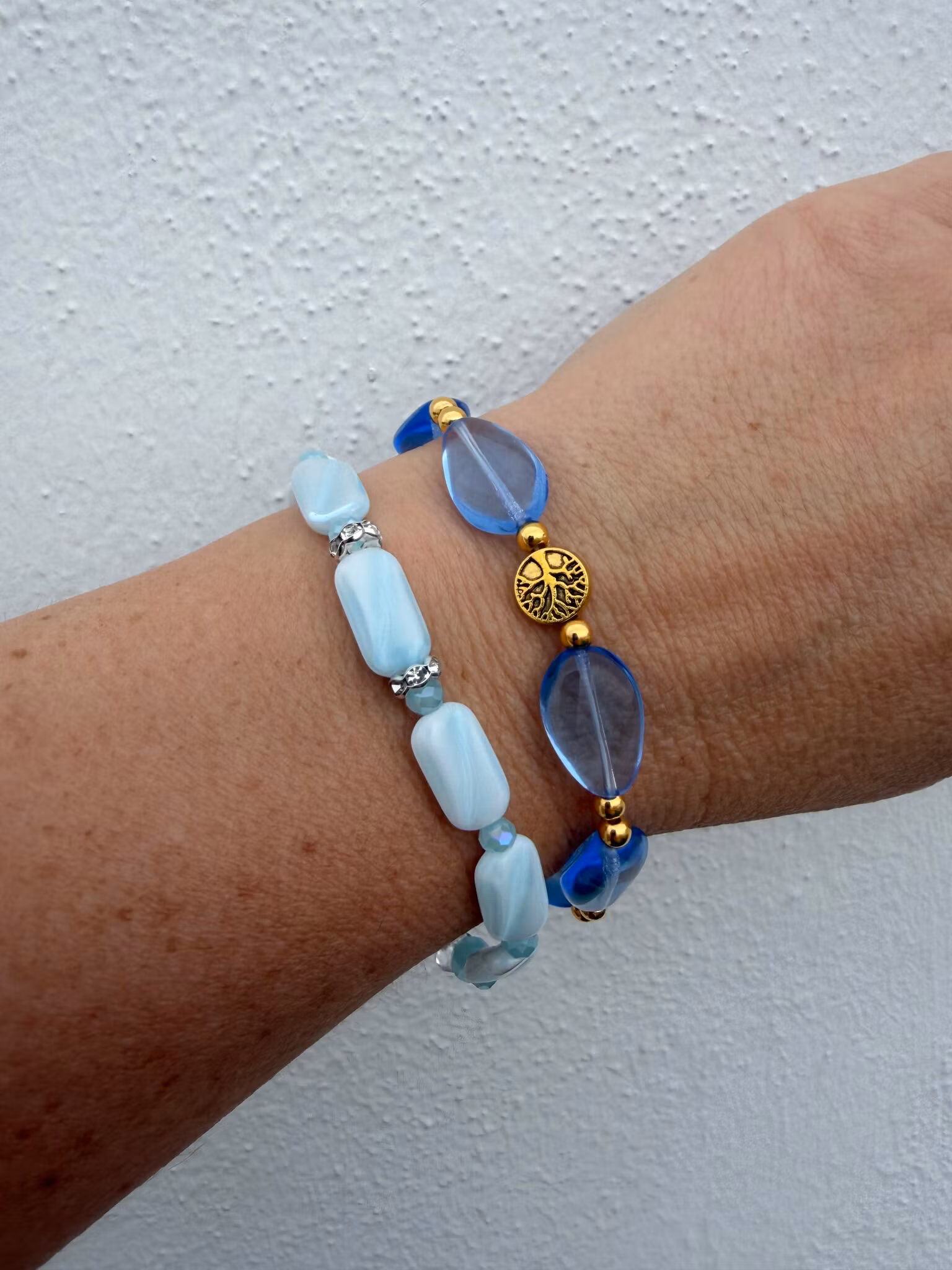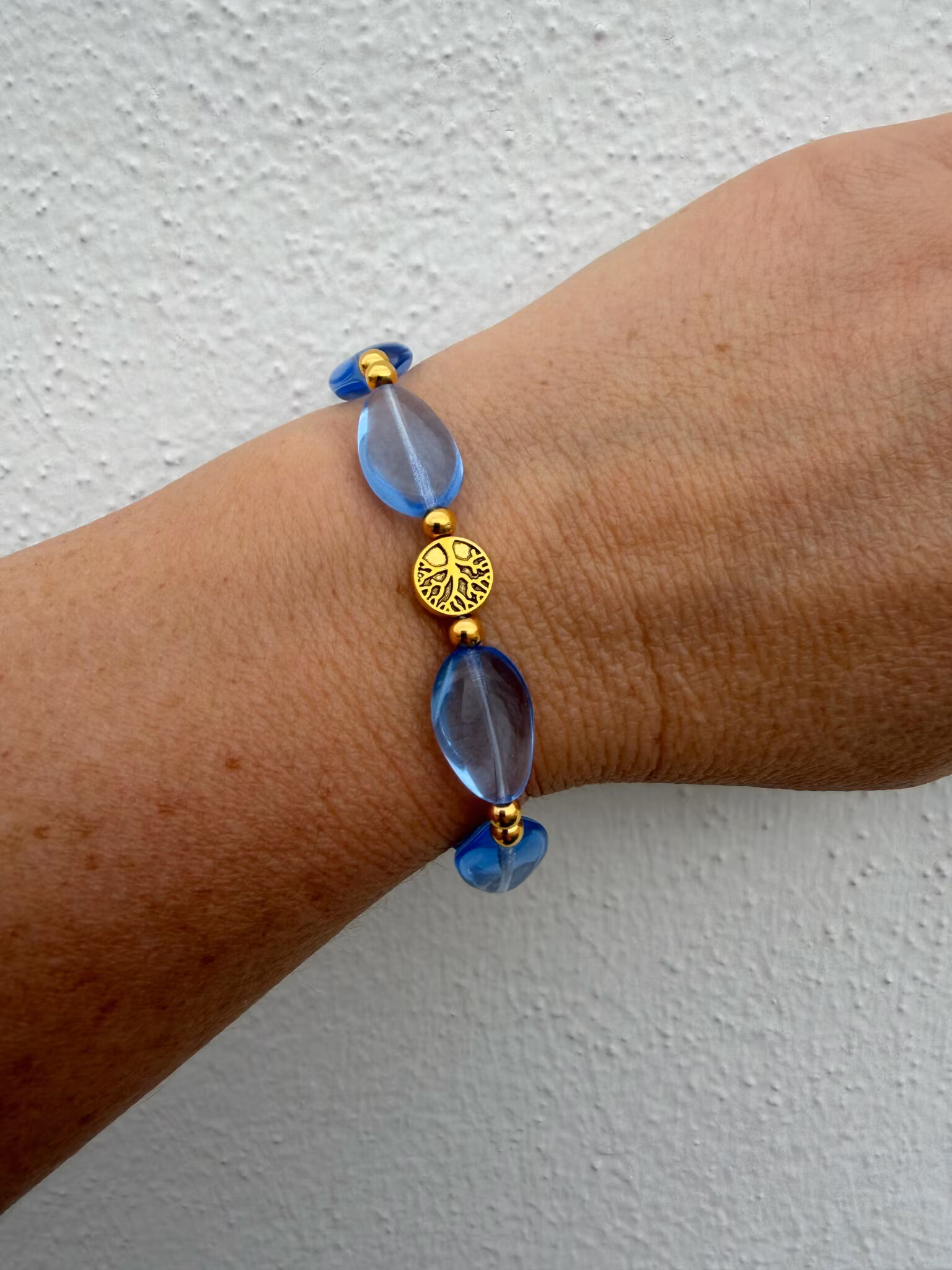Ett vackert och somrigt armband designat med ovala, ljusblå glaspärlor som skimrar mjukt i ljuset. Pärlorna varvas med små guldfärgade pärlor i rostfritt stål som ger en varm och elegant kontrast. I blickfånget finns en fin detalj med livets träd som tillför en symbolisk och harmonisk känsla. Som en stilfull avslutning pryds armbandet av min signaturpärla – en unik detalj som ger ett exklusivt och personligt uttryck.