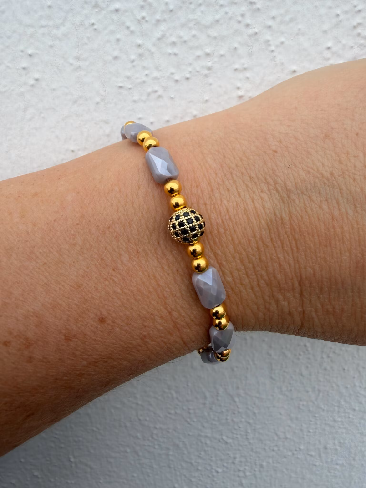 Ett vackert armband i harmoniska toner där dovt grå, facetterade rektangulära pärlor bildar ett mjukt, somrigt mönster. Små guldfärgade pärlor tillför en varm l