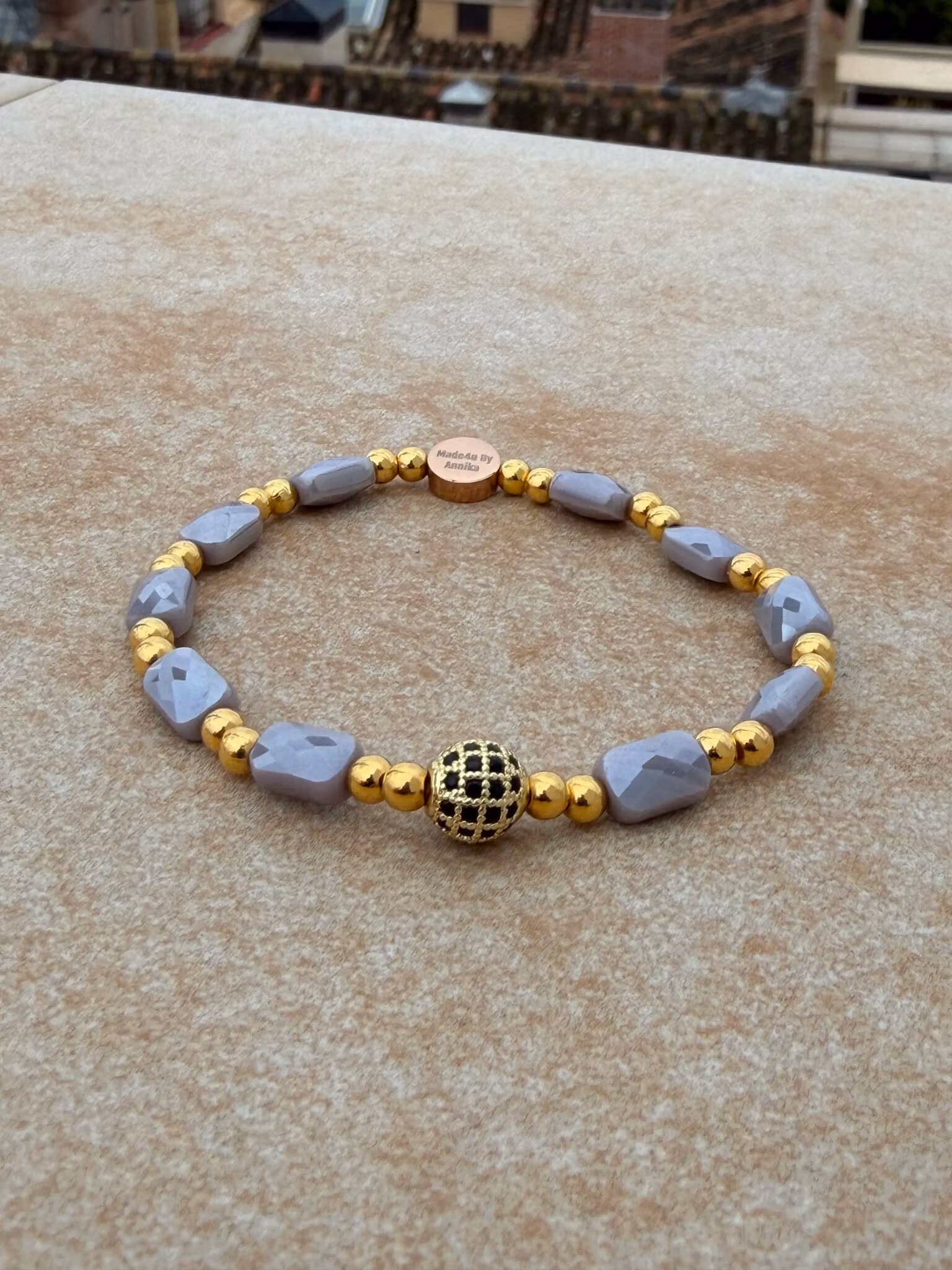 Ett vackert armband i harmoniska toner där dovt grå, facetterade rektangulära pärlor bildar ett mjukt, somrigt mönster. Små guldfärgade pärlor tillför en varm lyster, medan en elegant berlock ger smycket det lilla extra. Som alltid pryds armbandet av min signaturpärla – en unik detalj som skapar ett exklusivt och personligt uttryck.