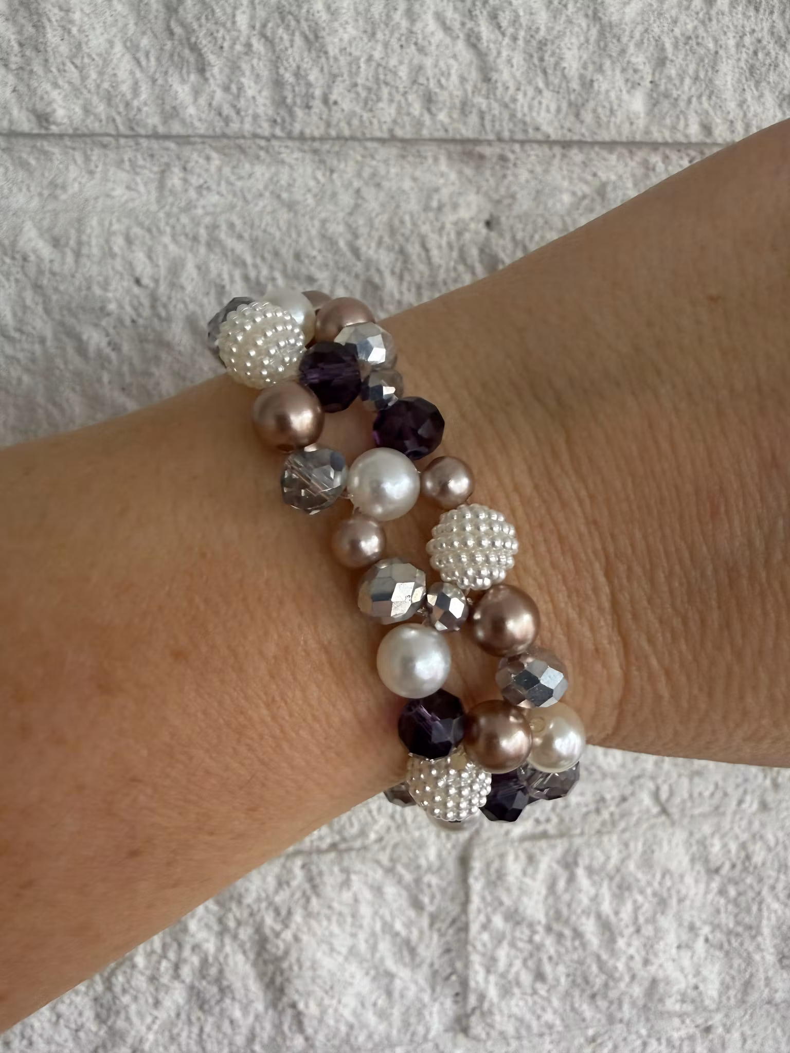 Elegant armband med ett brett, varvat mönster av pärlor i mjuka jordnära toner. En stilfull kombination av glaskristallpärlor och imitationspärlor ger armbandet