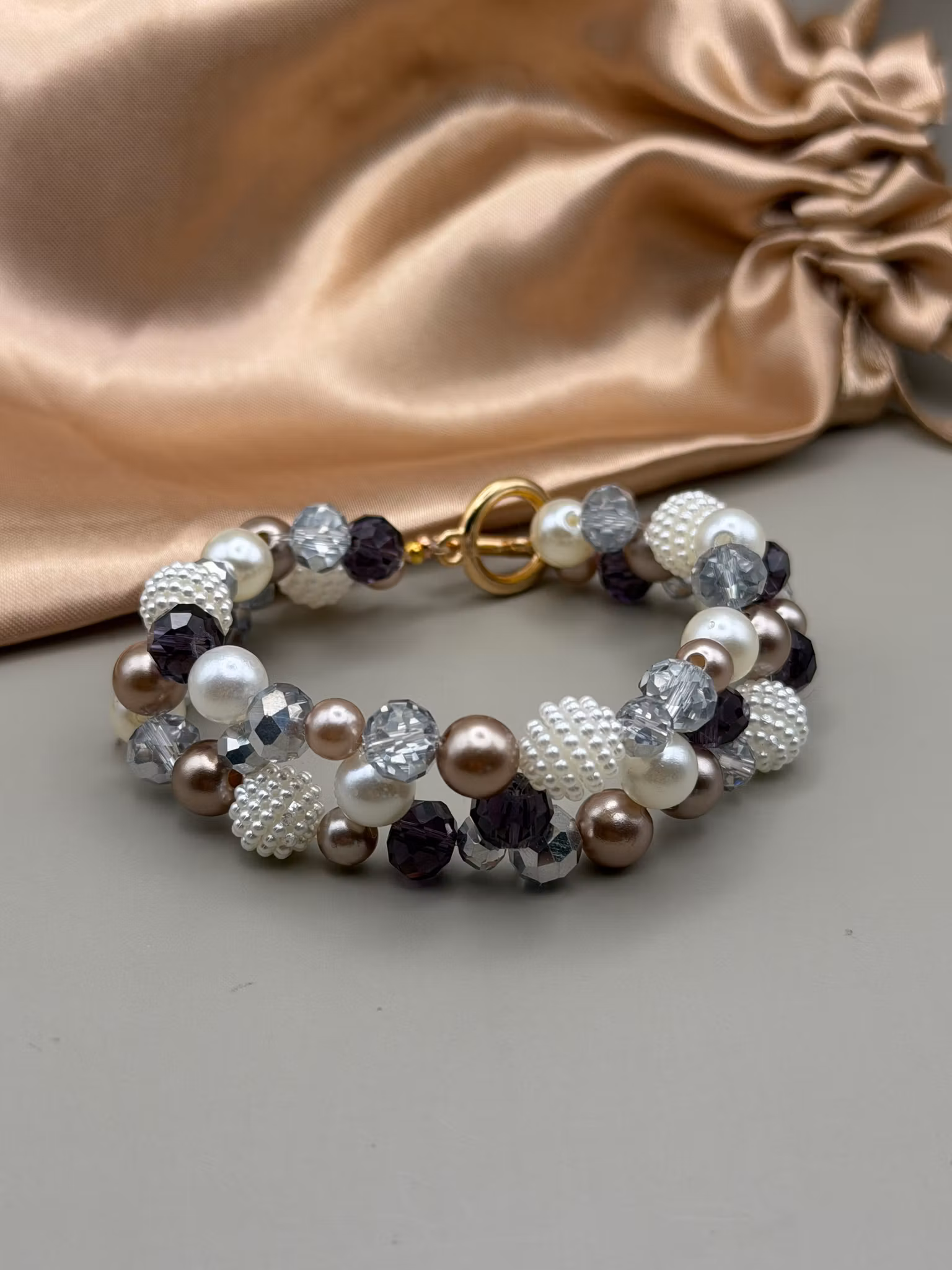 Elegant armband med ett brett, varvat mönster av pärlor i mjuka jordnära toner. En stilfull kombination av glaskristallpärlor och imitationspärlor ger armbandet liv och lyster, och det avslutas med ett guldfärgat spänne.