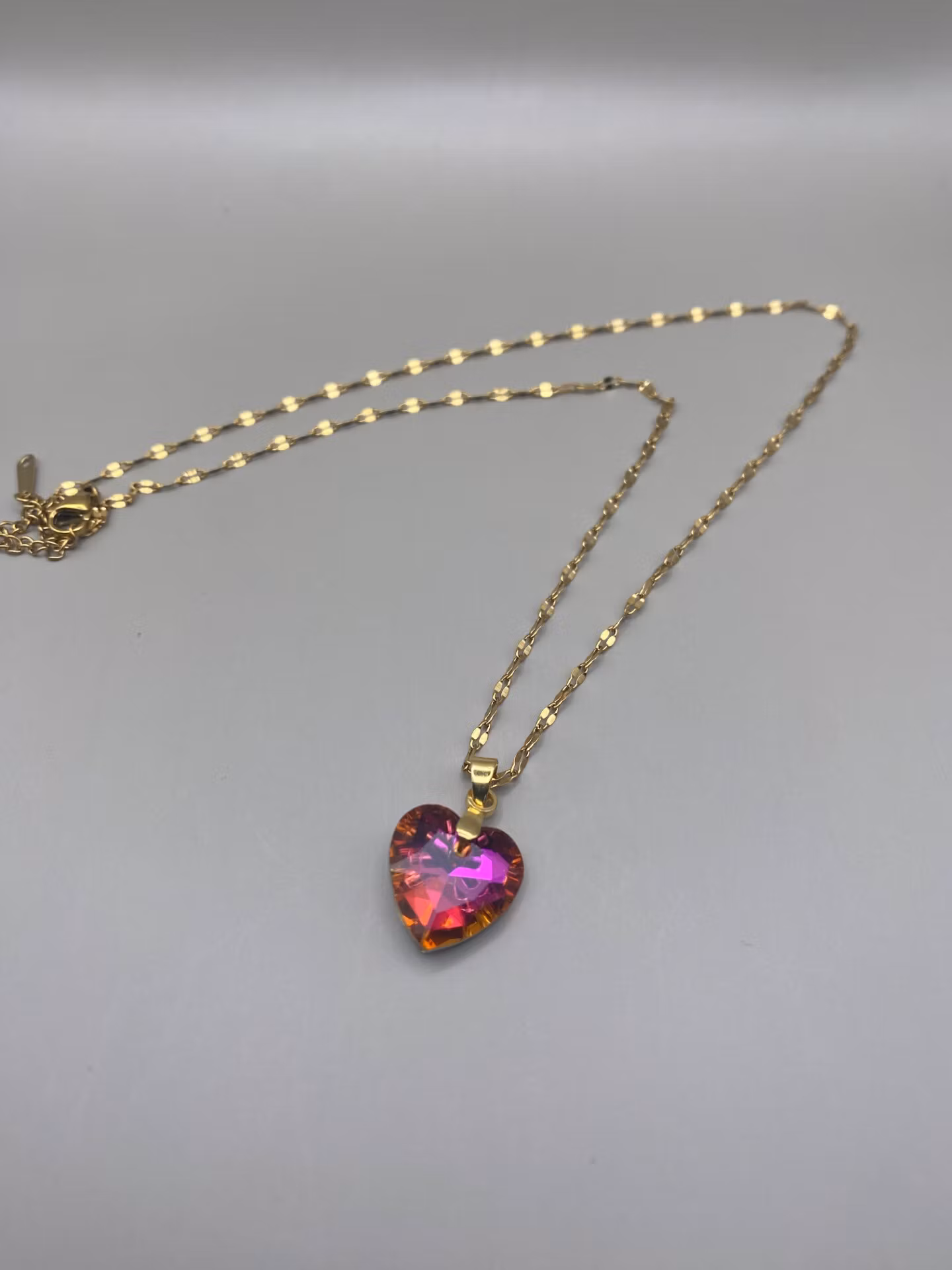 Vackert lekfullt halsband i guldfärgad rostfritt stål med vacker berlock i form av lila facetterat glaskristall hjärta.