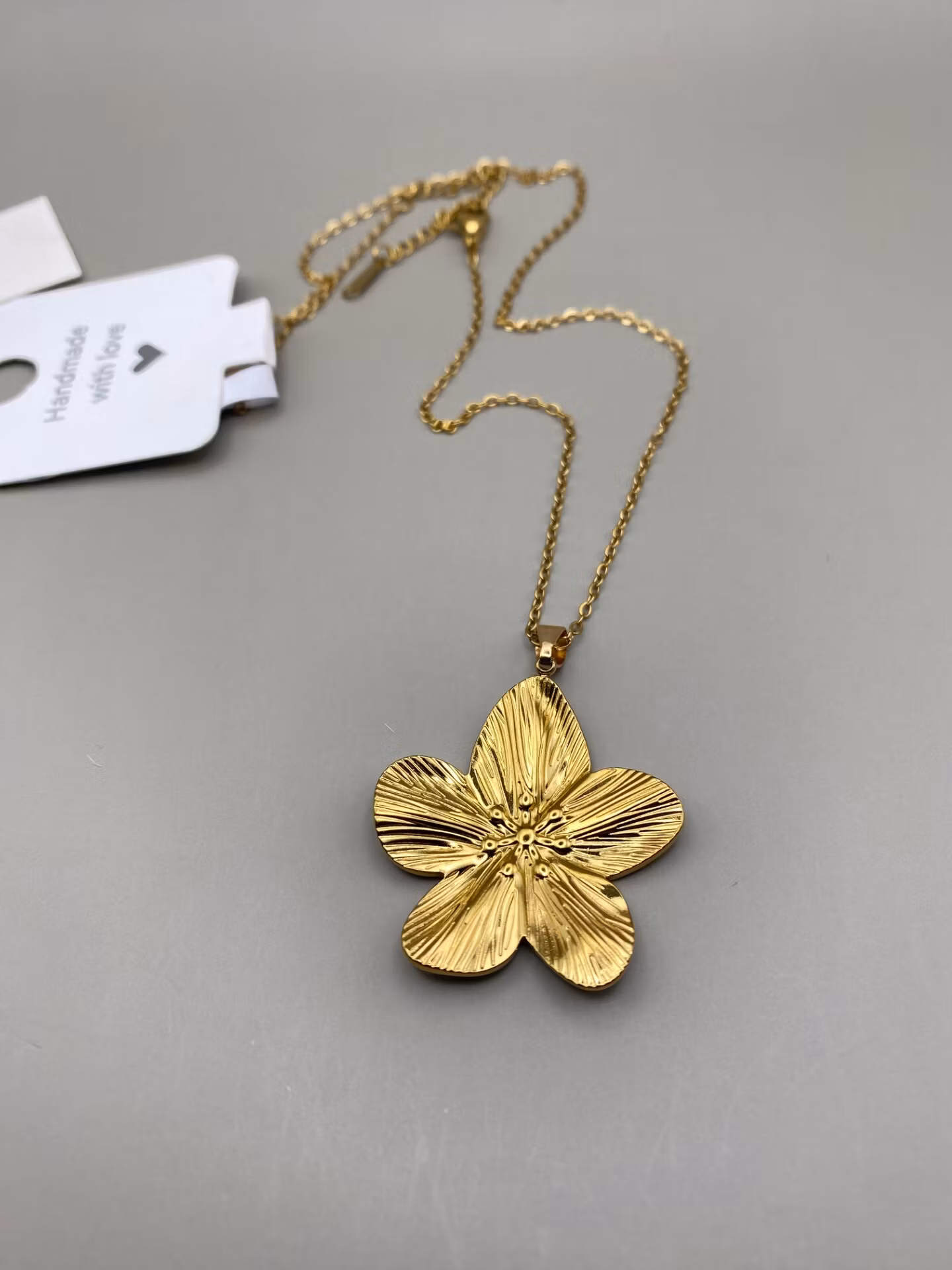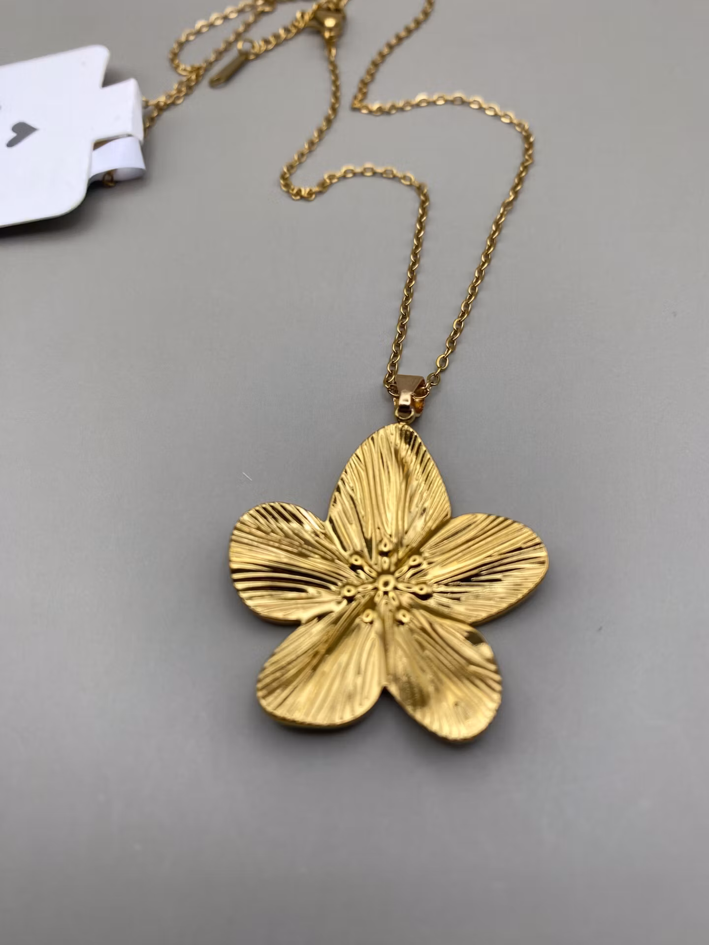 Stiligt halsband med stor guldfärgad blomma i blickfånget.
