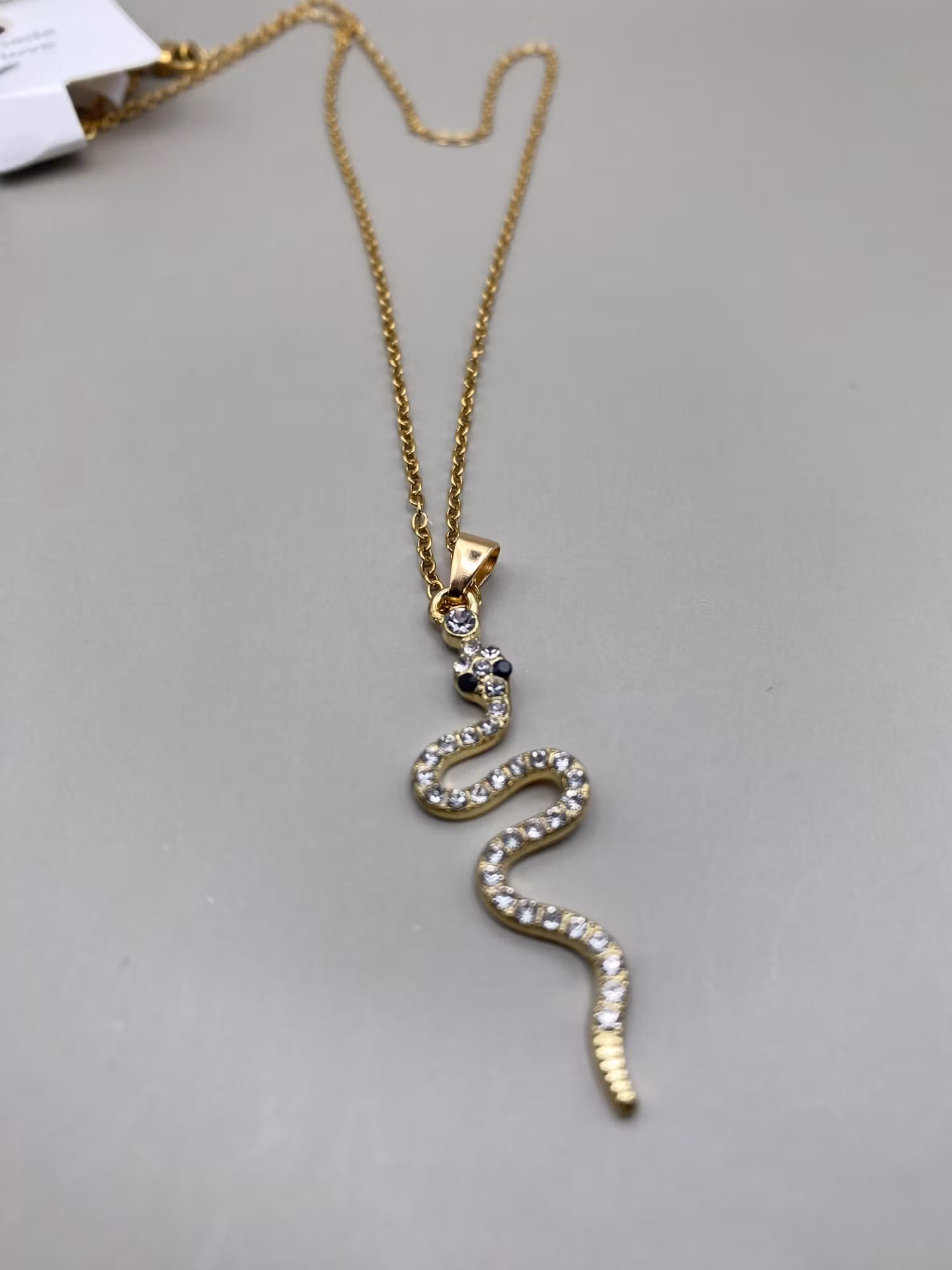 Tufft halsband i guldfärgad halskedja med skimrande slingrande guldfärgad orm med lite strass i blickfånget