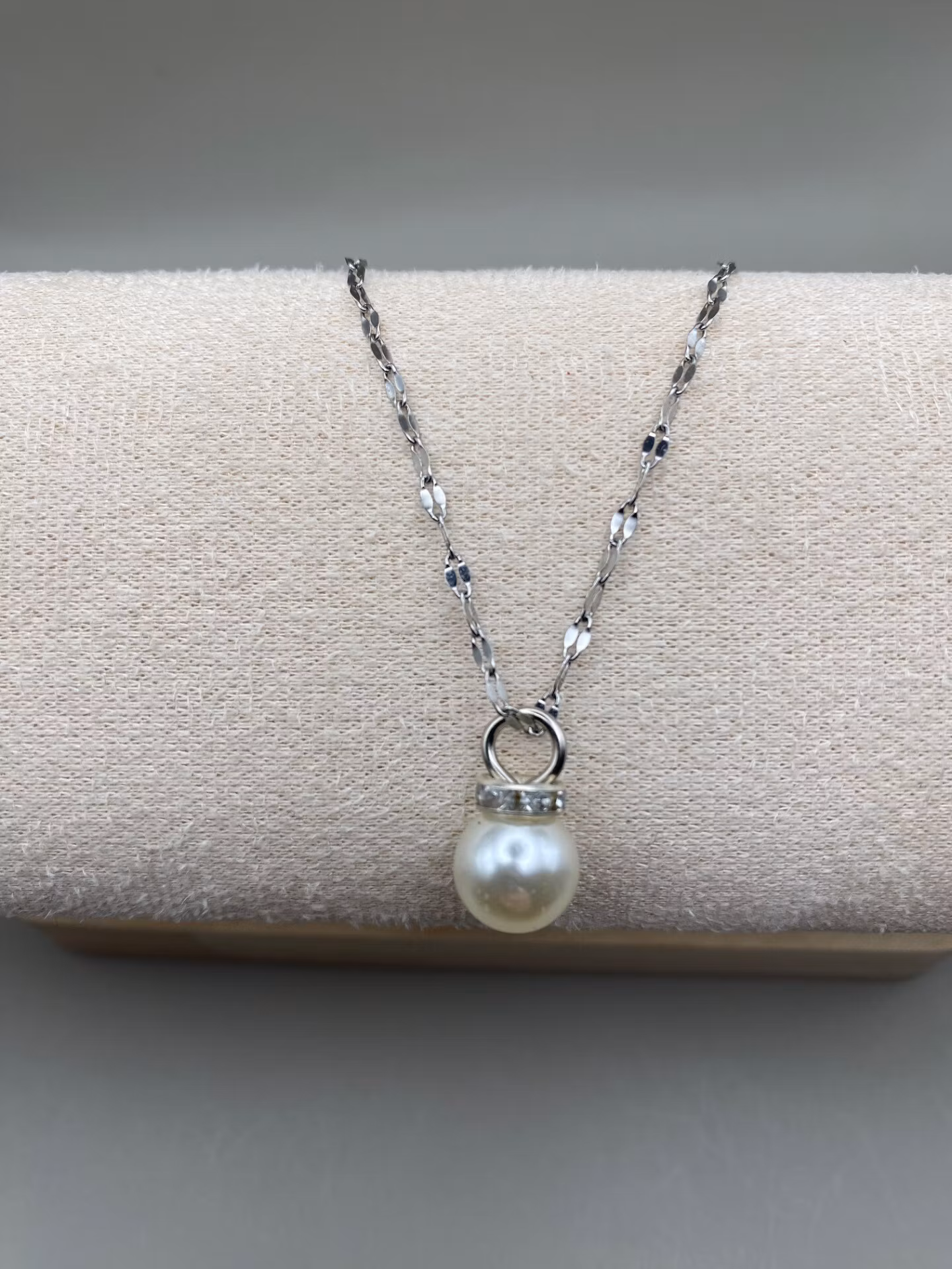 Silverfärgat halsband med en stor vit pärla som berlock, dekorerad med gnistrande strass.