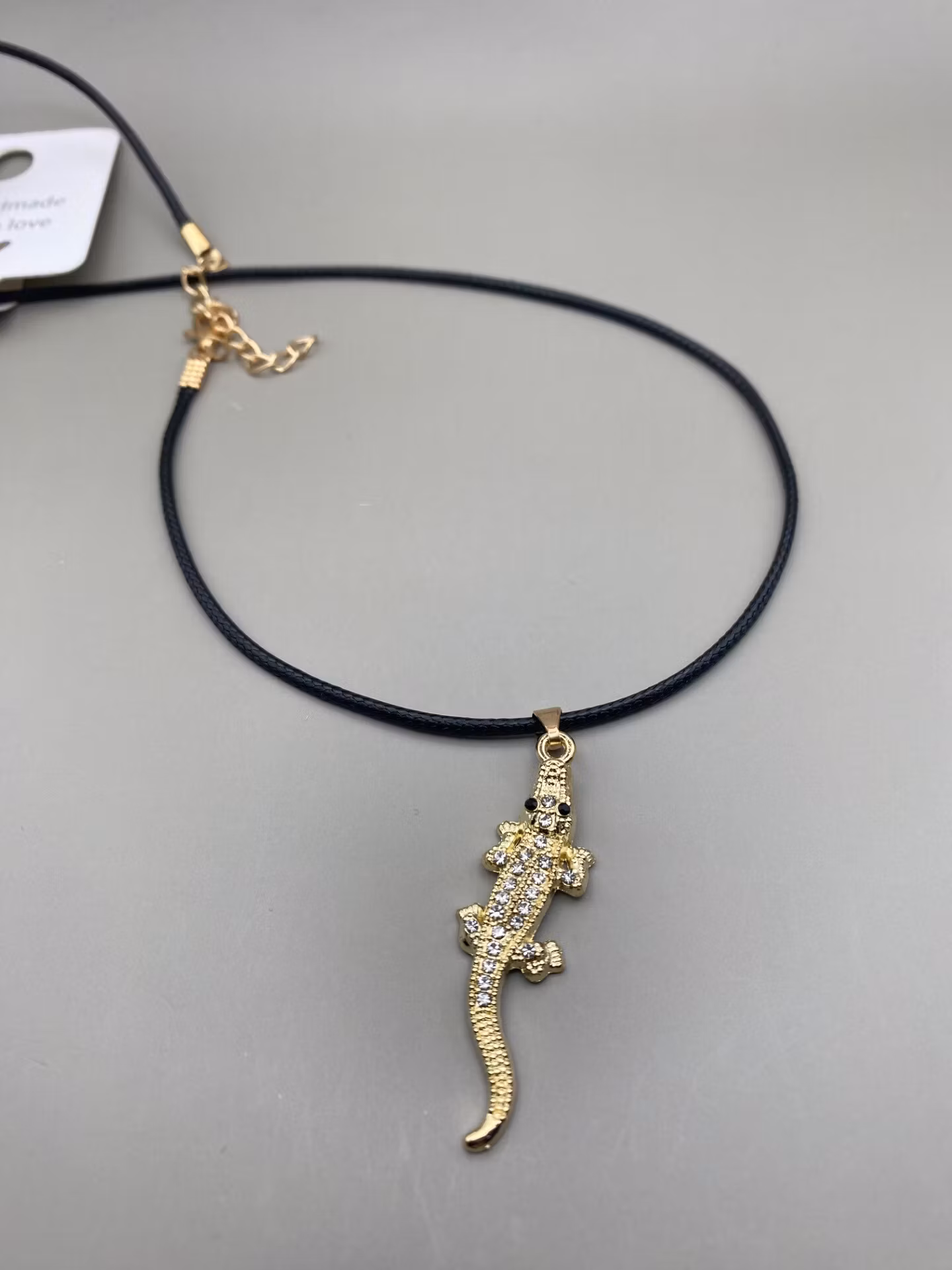 Tufft halsband i svart med en guldfärgad skimrande krokodil med lite strass i blickfånget