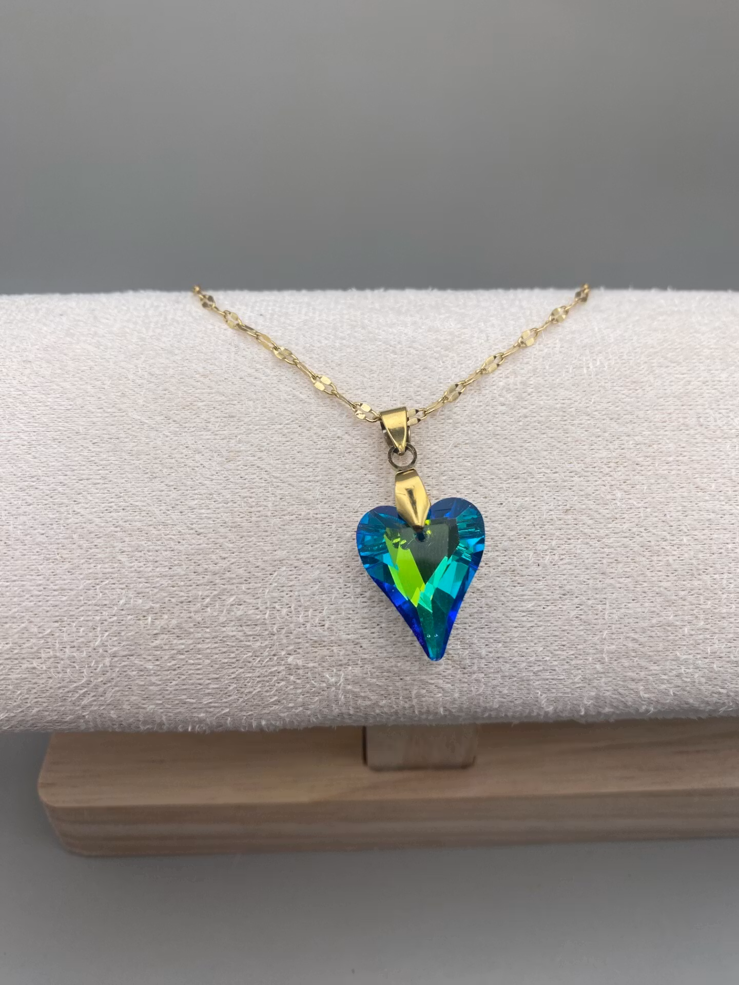 Vackert lekfullt halsband i guldfärgad rostfritt stål med vacker berlock i form av gult oregelbundet glaskristall hjärta.