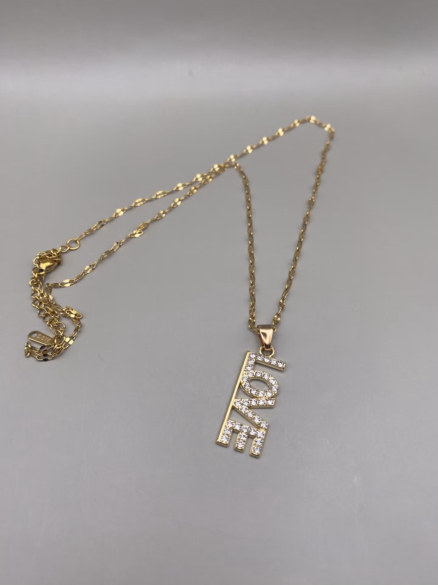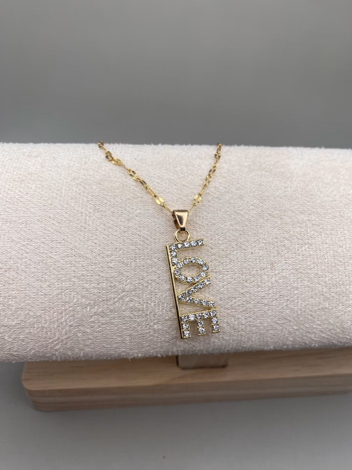 Vackert lekfullt halsband i guldfärgad rostfritt stål med vacker berlock med texten LOVE i rhinestones.