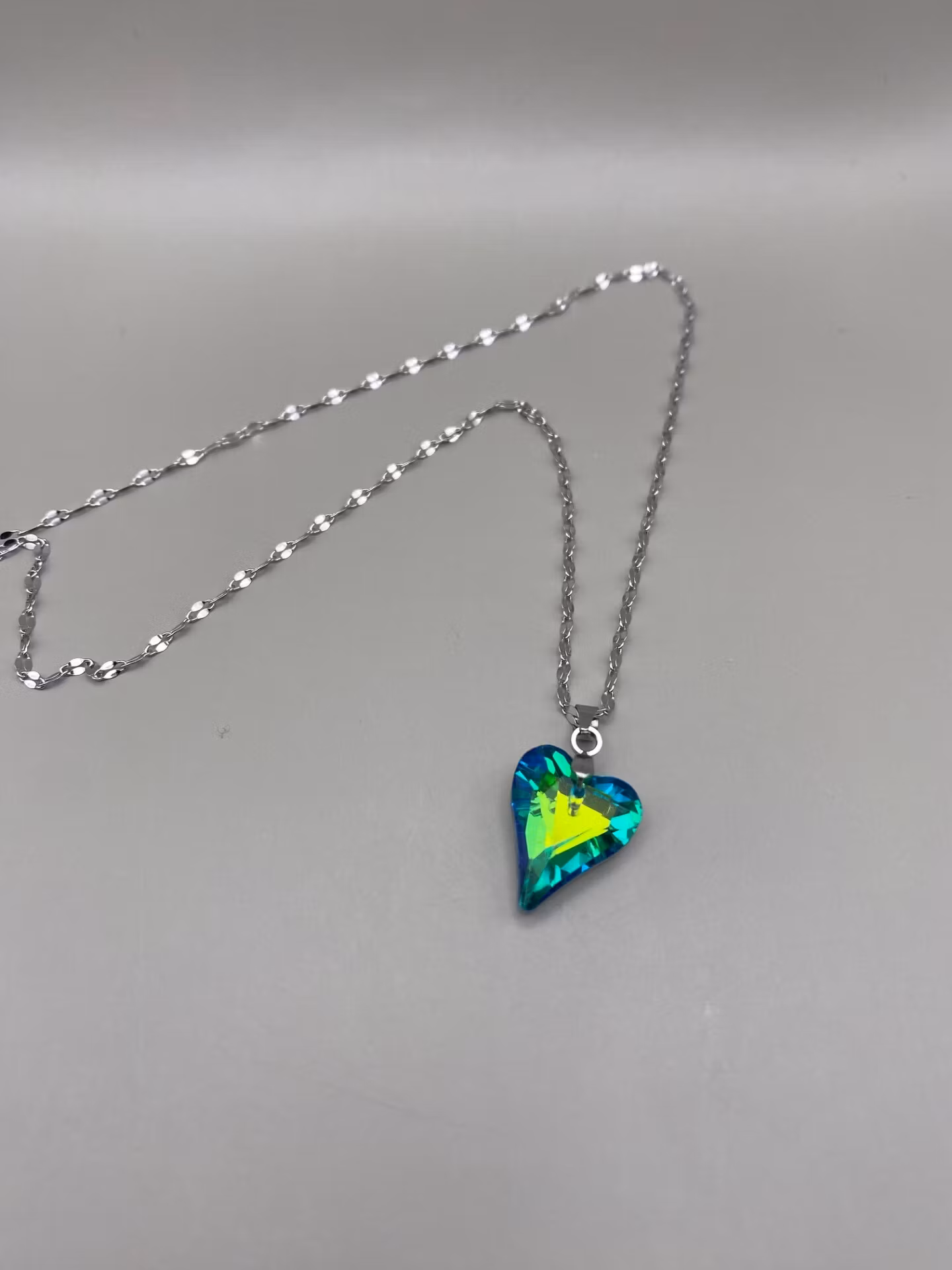 Vackert lekfullt halsband i silverfärgad rostfritt stål med vacker berlock i form av grönt oregelbundet glaskristall hjärta.