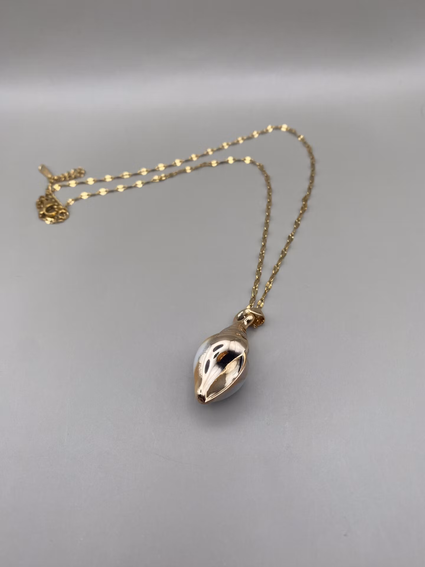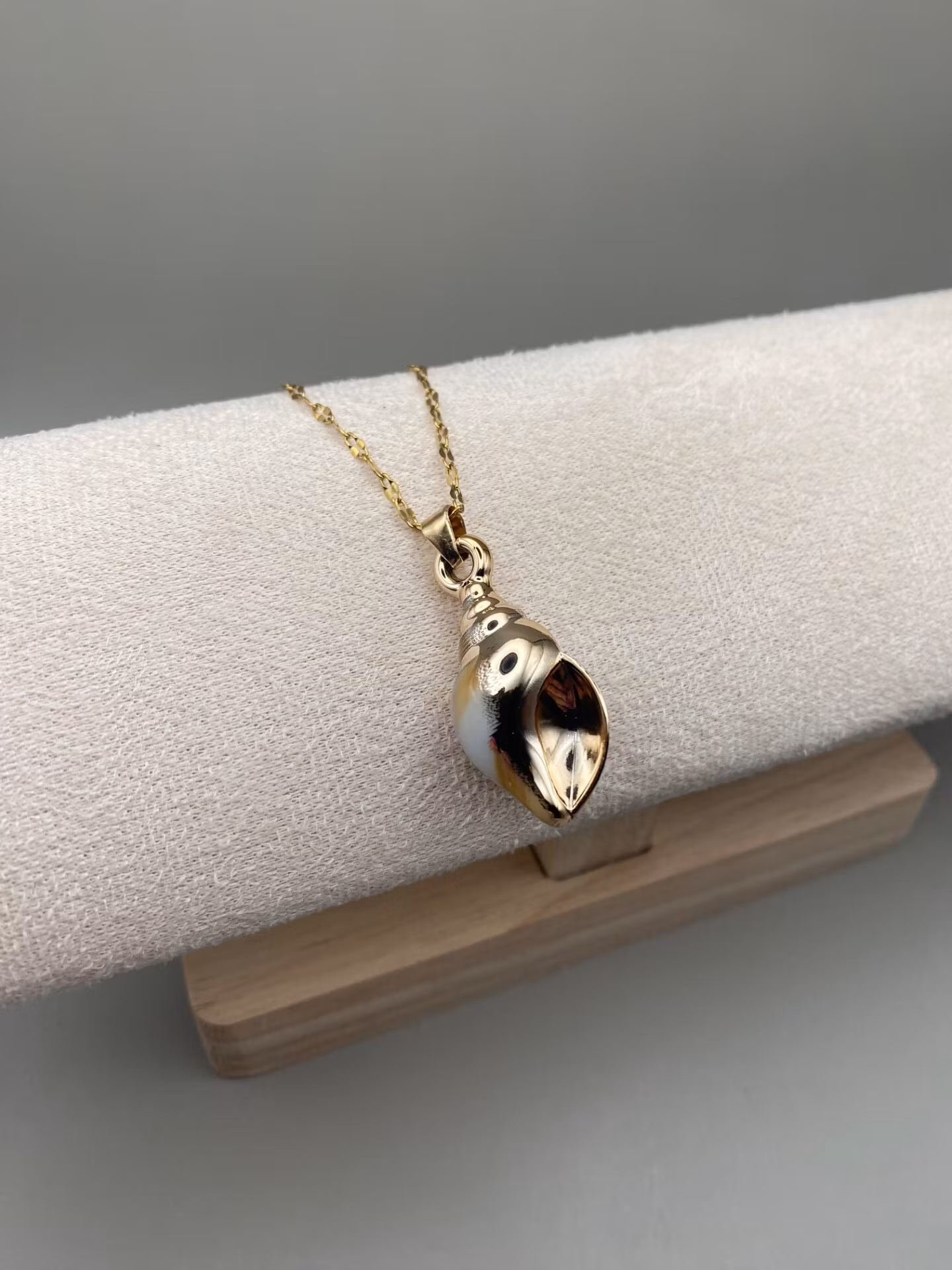 Vackert lekfullt halsband i guldfärgad rostfritt stål med vacker berlock i form av en guld och vit mönstrad faux snäcka.