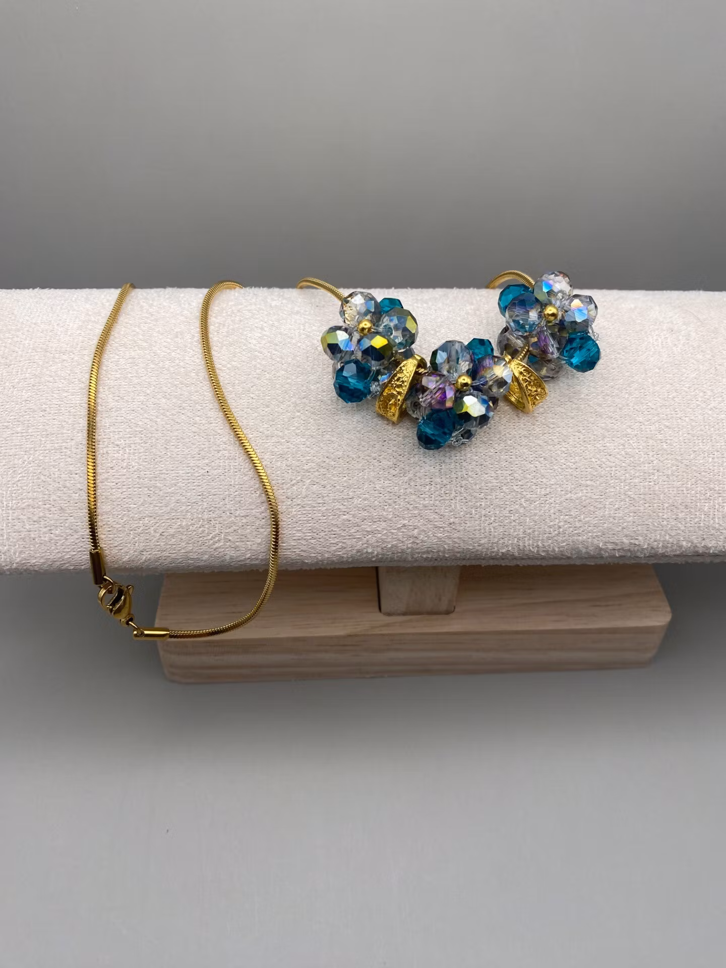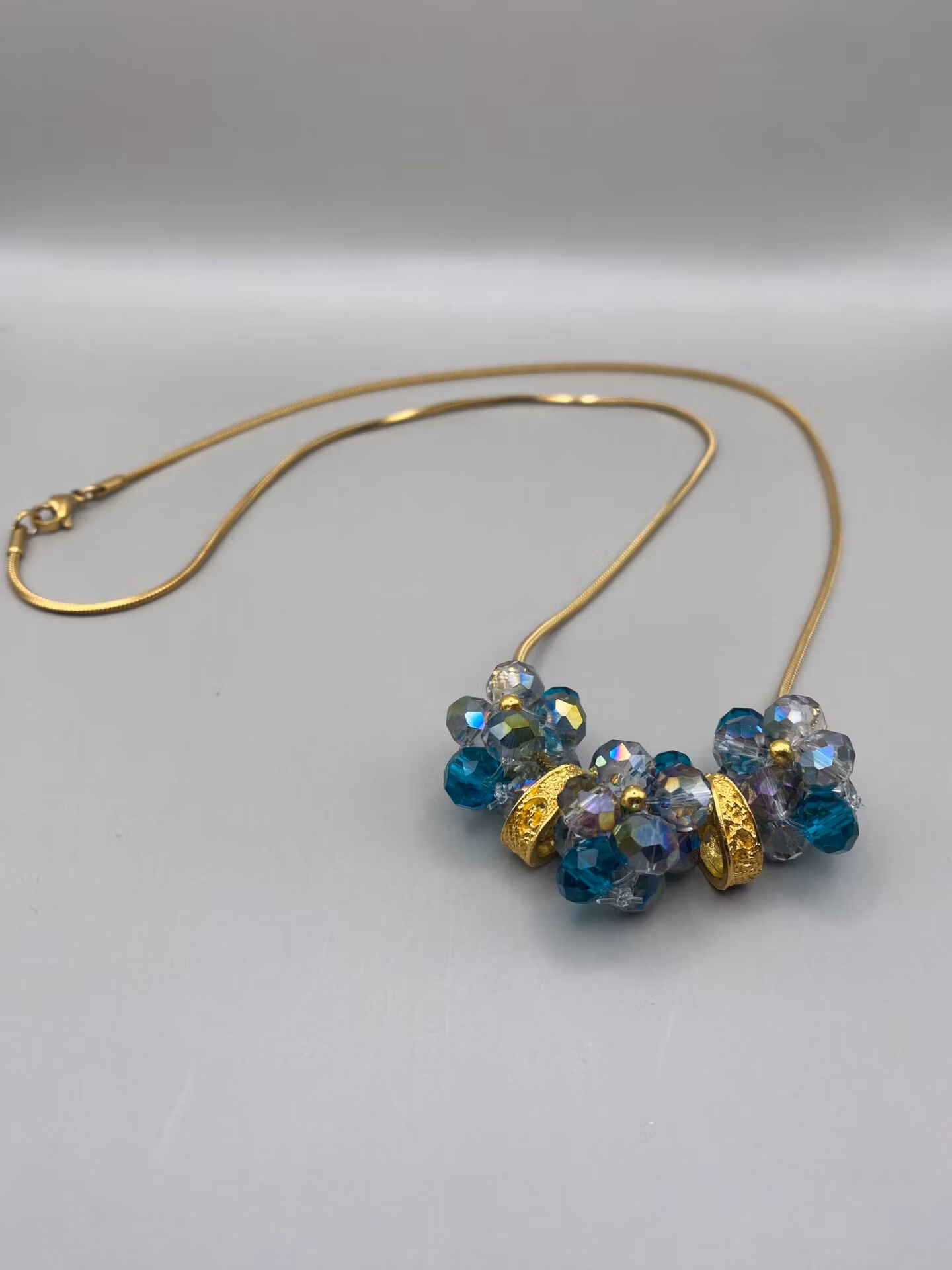 Vackert lekfullt lite längre halsband i guldfärgad rundad halskedja och tre vackra blomformade skapelser av glaskristallpärlor i turkost och flerfärgade pärlor och guldfärgade distanser.