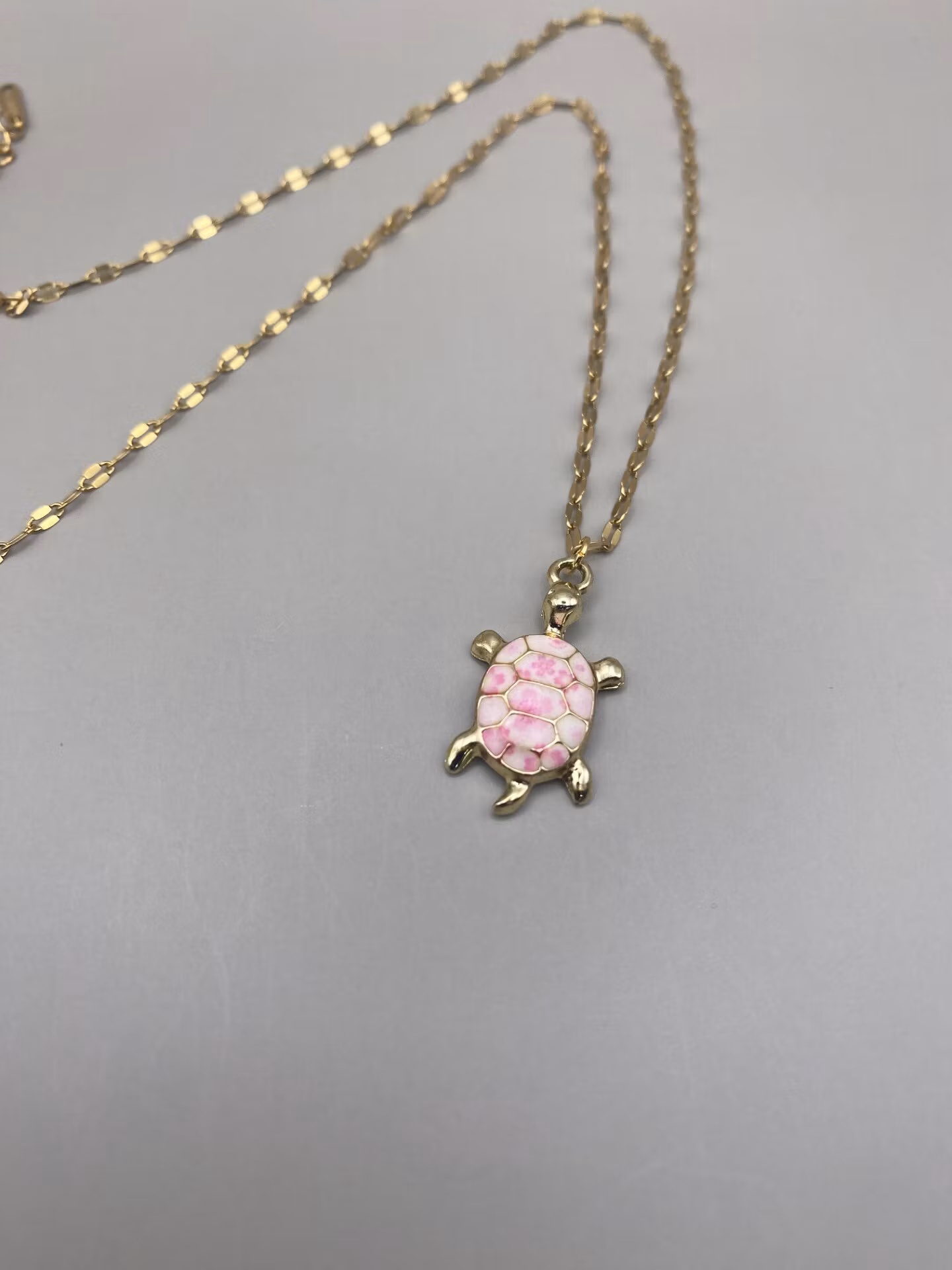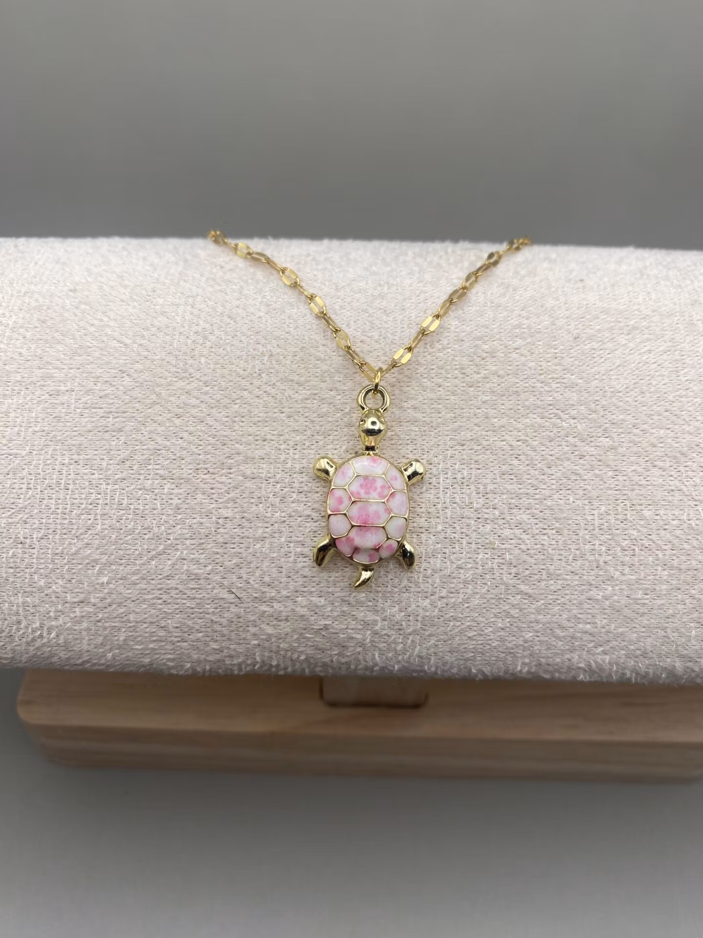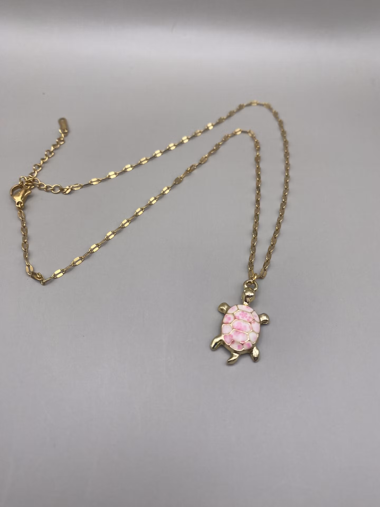 Vackert halsband i guldfärgad rostfritt stål med ljusrosa sköldpadda berlock.