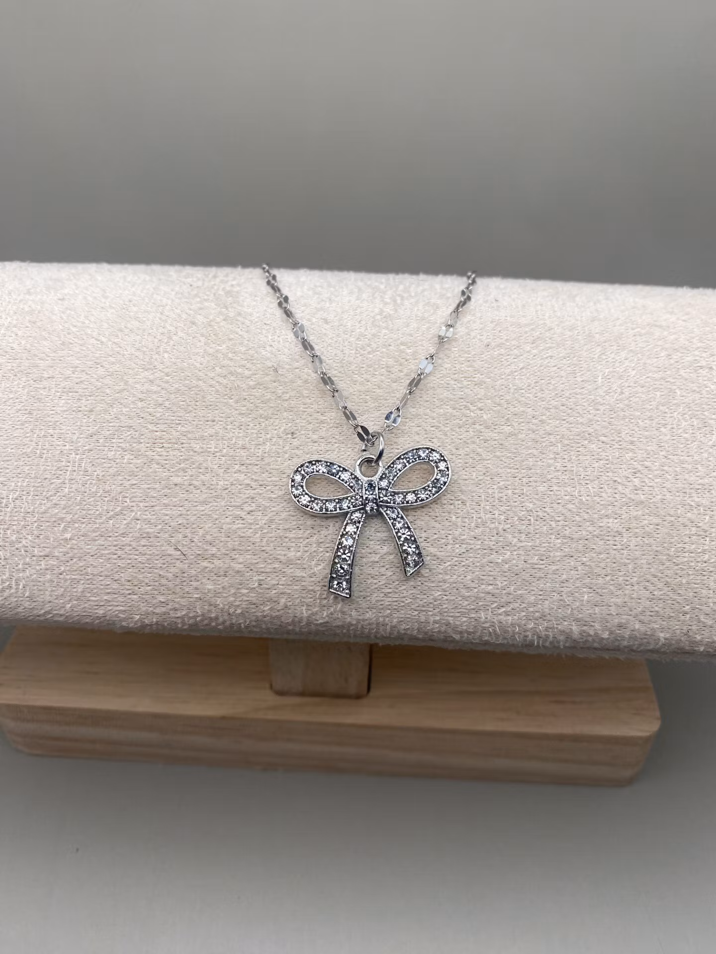 Vackert halsband i silverfärgad rostfritt stål med en berlock i form av silverfärgad rosett med rhinestones.