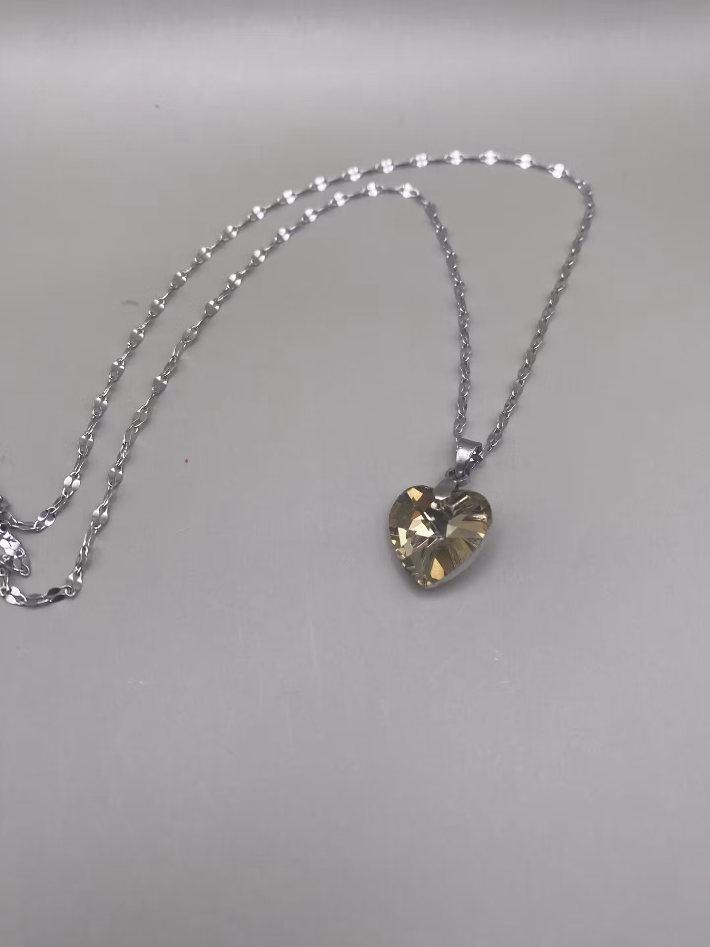 Vackert lekfullt halsband i silverfärgad rostfritt stål med vacker berlock i form av champagnefärgat facetterat glaskristall hjärta.