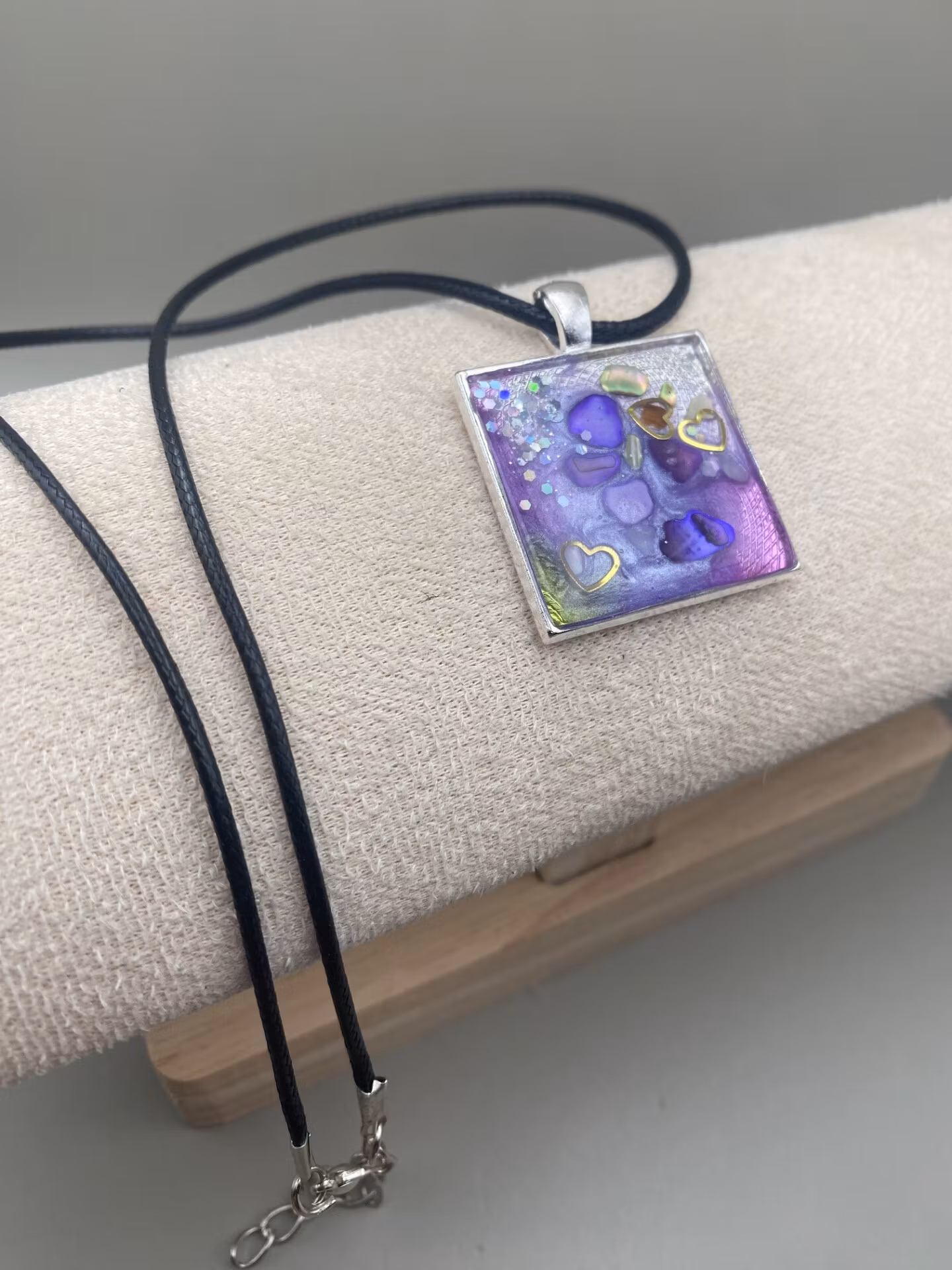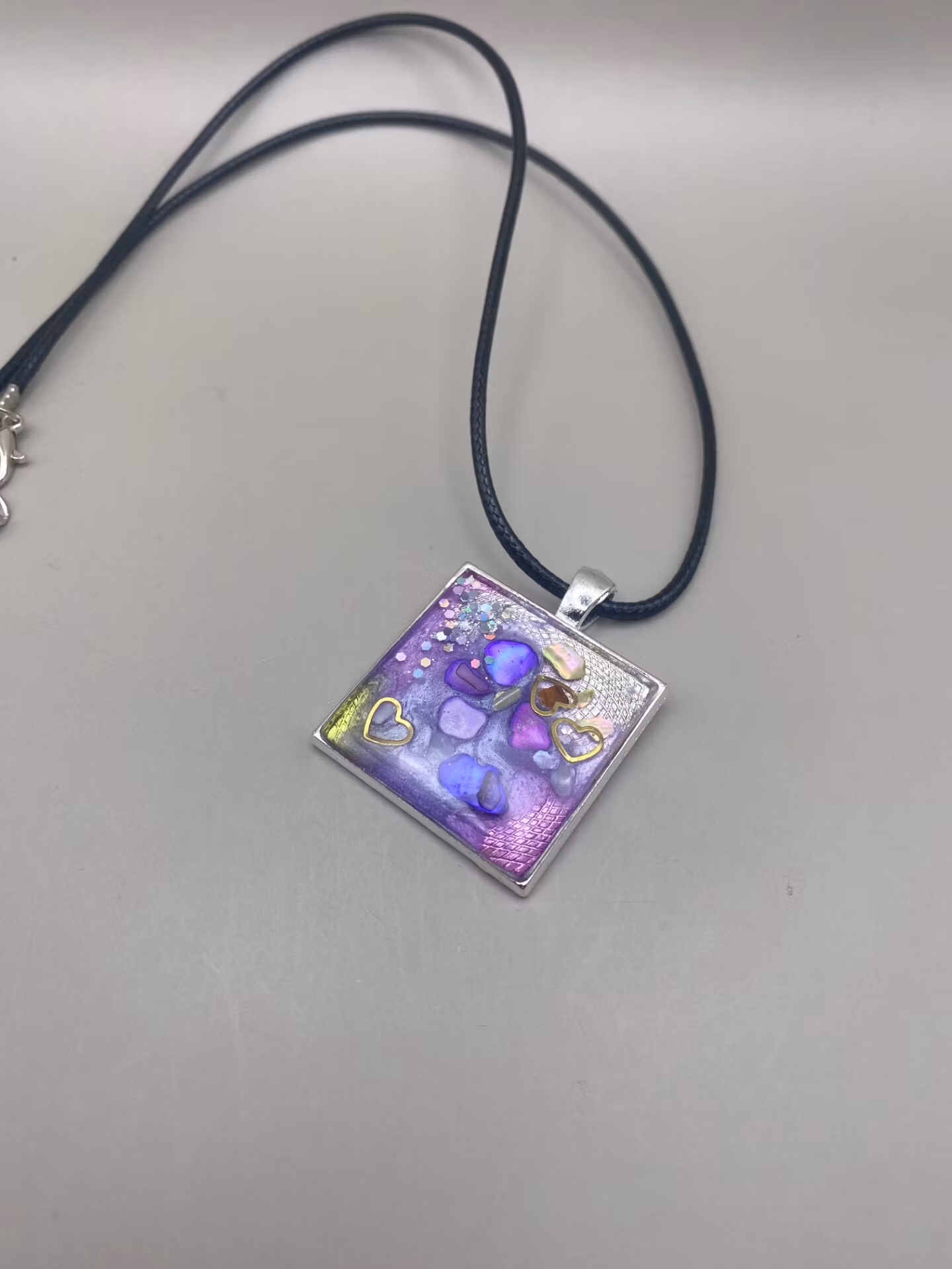 Förtrollande halsband med en vacker fyrkantig silverfärgad berlock med härligt färglatt skimrande mönster i rosa och lila inuti, täckt av glasliknande materialet resin, svart halsband.