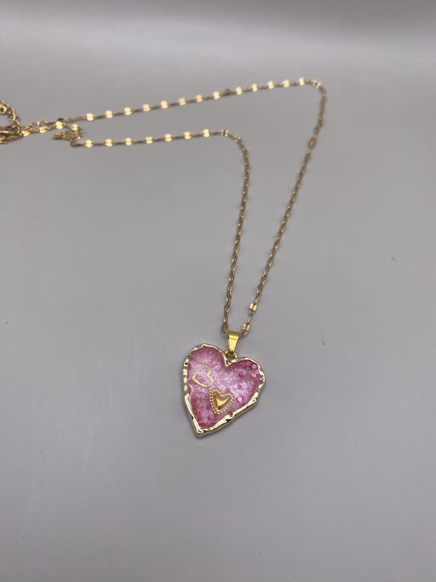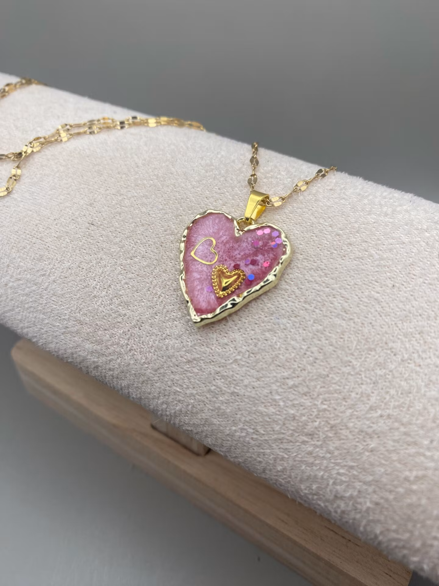 Lekfullt halsband med en vacker hjärtformad berlock med rosa skimrande fyllning och detaljer. Guldfärgat halsband i rostfritt stål.