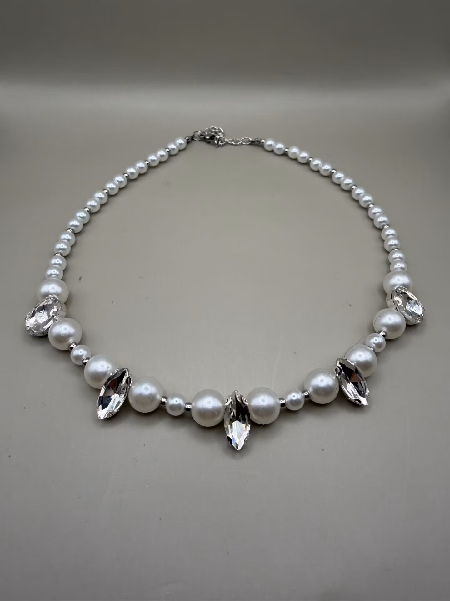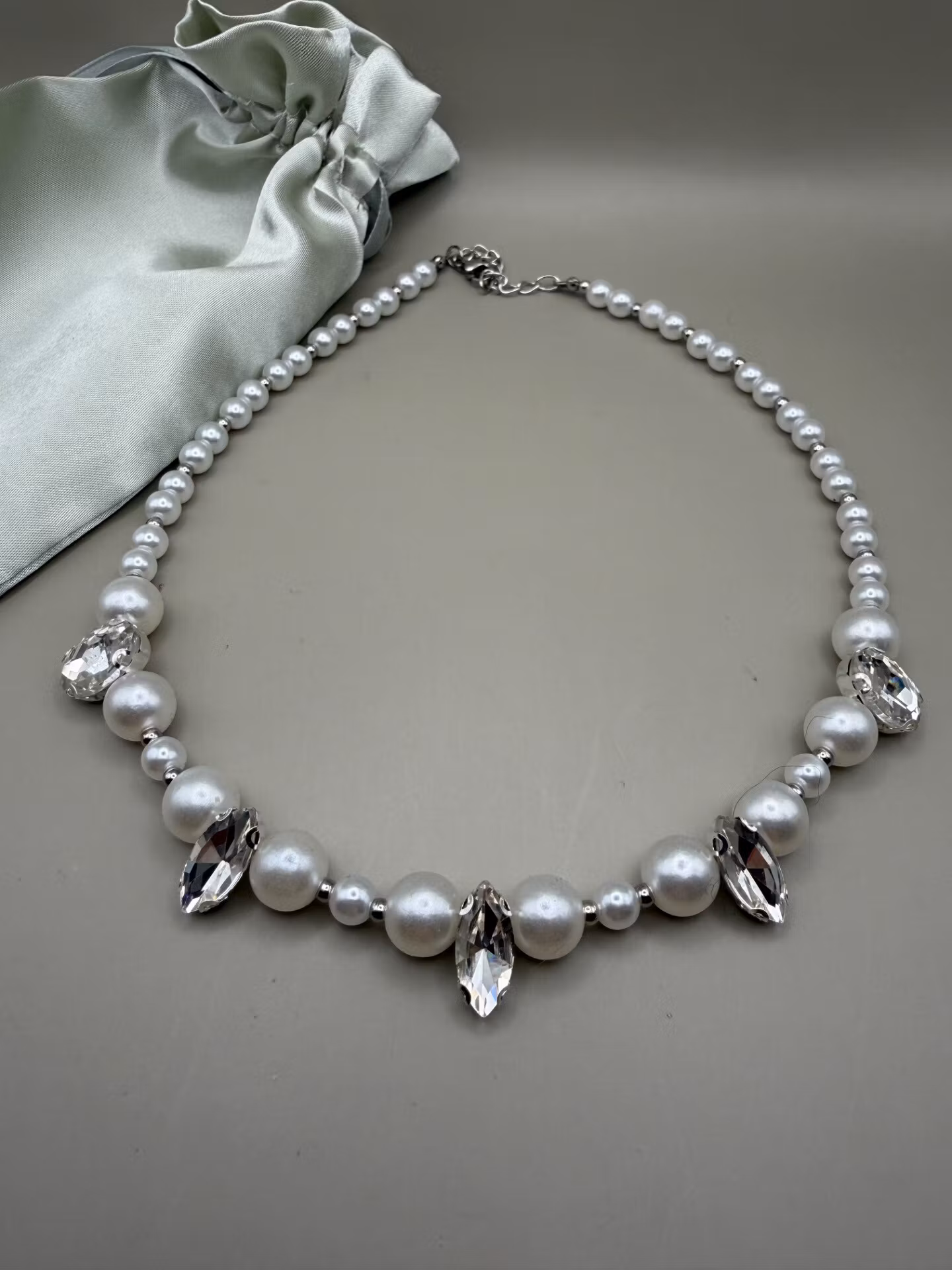 Ett vackert halsband i ett varvat mönster av små och mellanstora vita, högblanka pärlor. Smycket är dekorerat med små silverfärgade distanser och klar strass som ger ett fint ljusspel. Halsbandet är en kort modell som vilar högt upp vid nyckelbenen och har reglerbar längd för bästa passform.