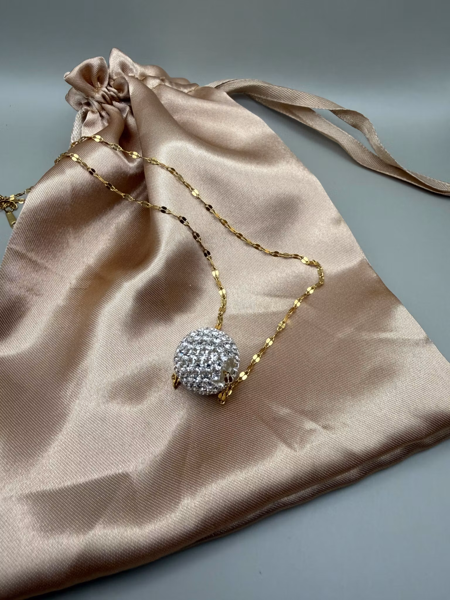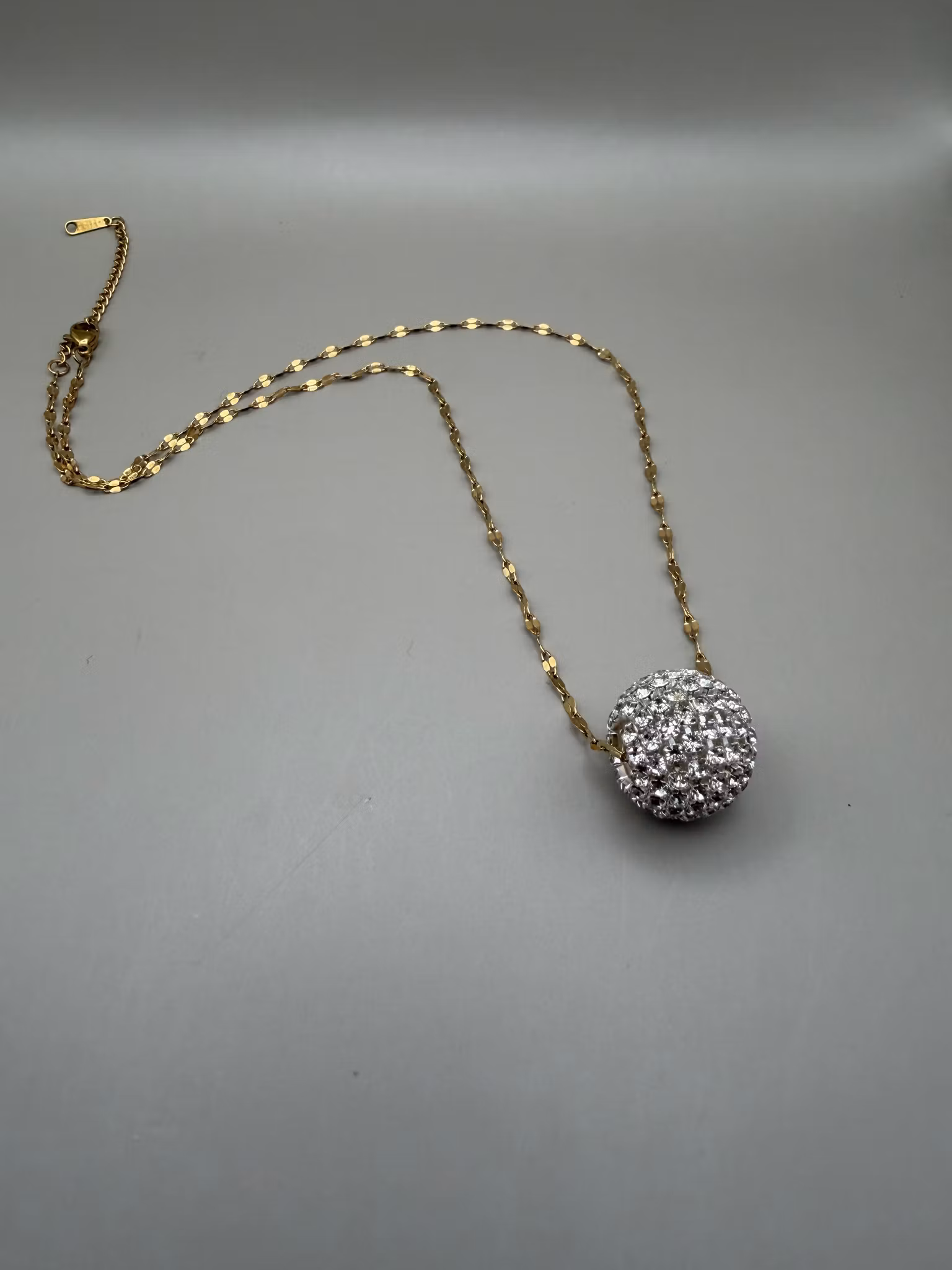 Vackert guldfärgat halsband med en stor rundpärla som gnistrar av rhinestones. Den skimrande detaljen fångar ljuset på ett elegant sätt och ger halsbandet det där lilla extra.
