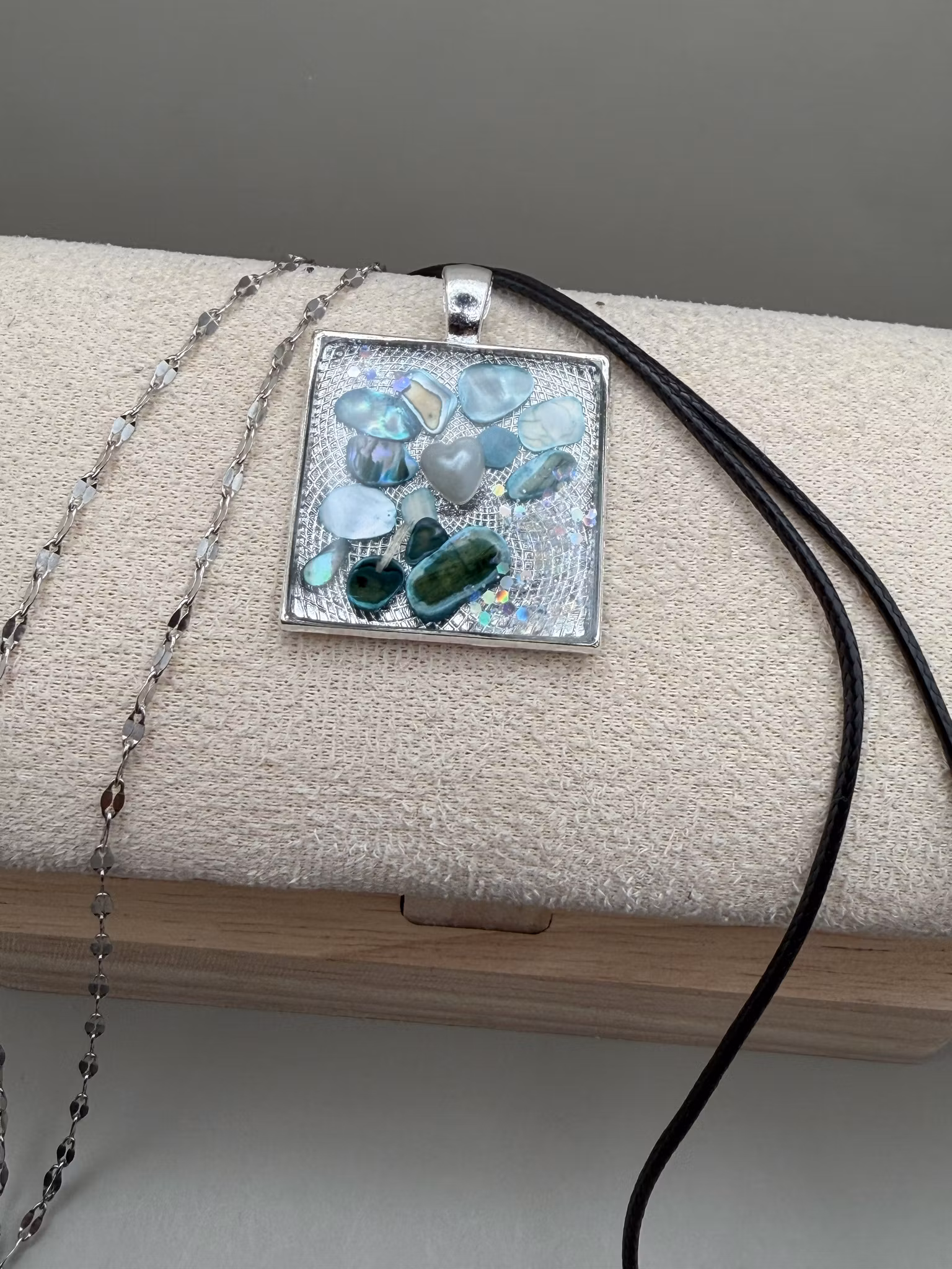 Ytan är täckt av kristallklar resin som förstärker djupet och ger en exklusiv, glasliknande finish. Varje smycke blir unikt och skapat med omsorg.