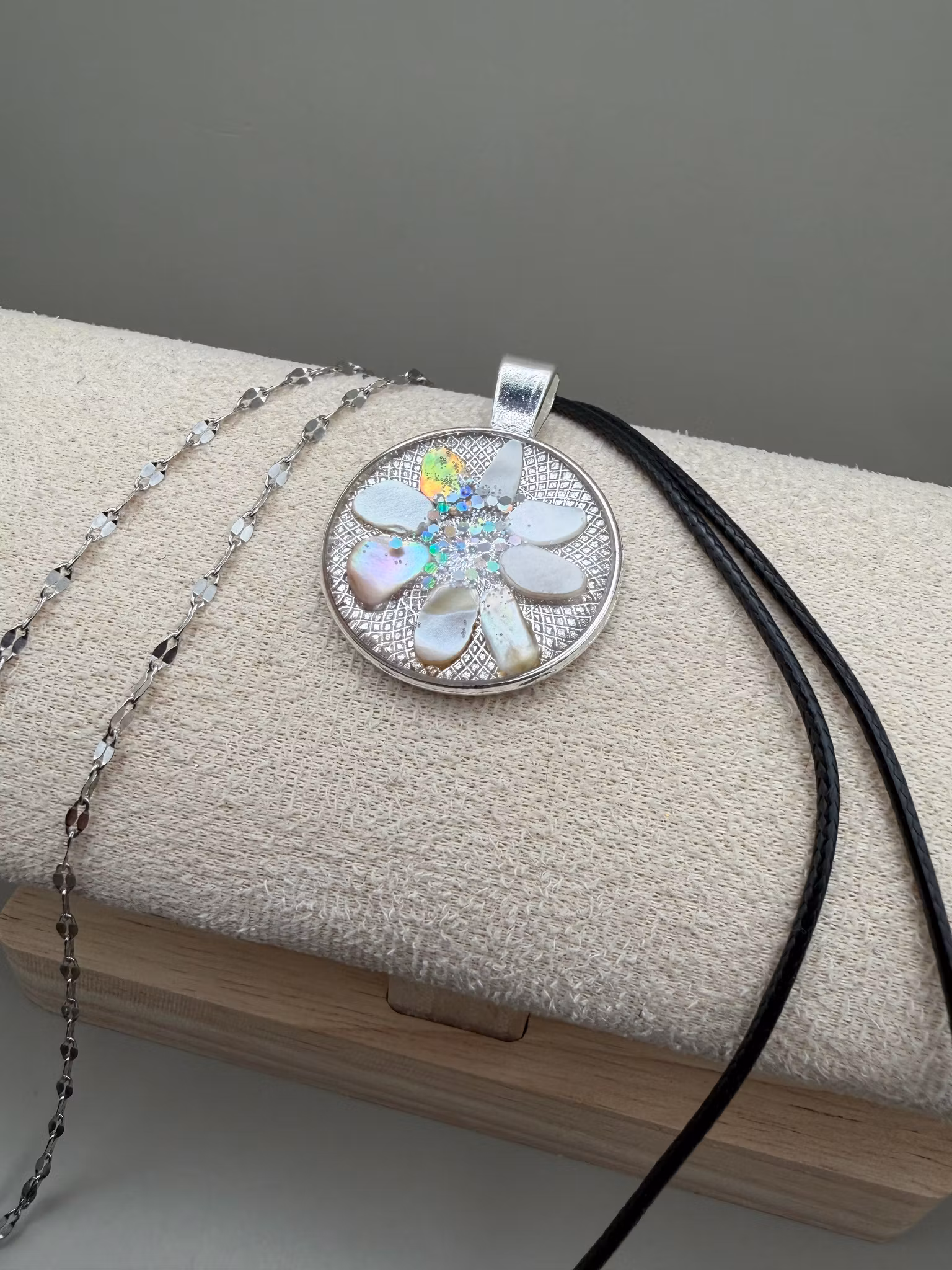 Ytan är täckt av kristallklar resin som förstärker djupet och ger en exklusiv, glasliknande finish. Varje smycke blir unikt och skapat med omsorg.