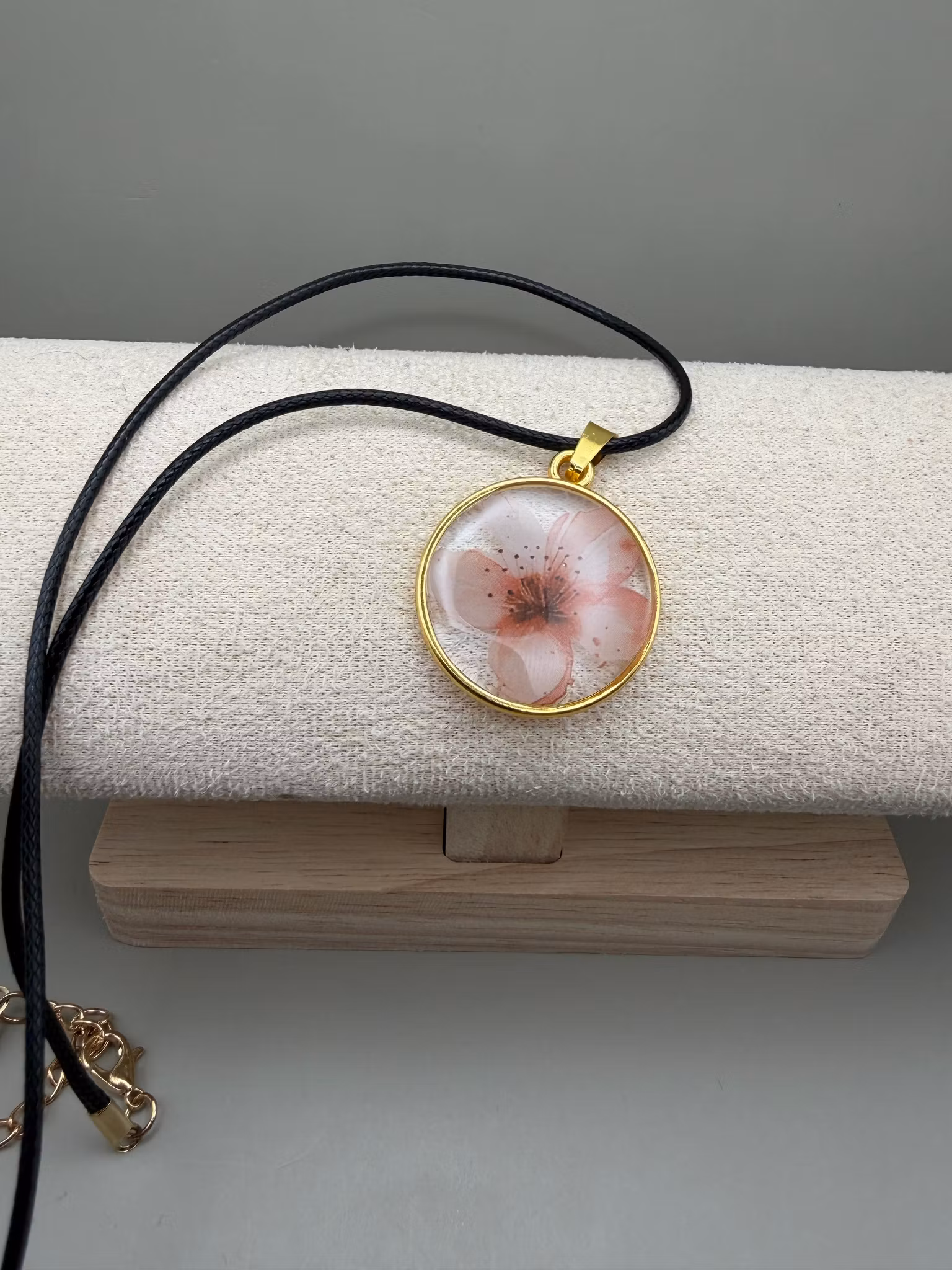 En rund, guldfärgad berlock i rostfritt stål pryds av ett vackert mönster av en aprikosfärgad blomma. Ytan är täckt med kristallklar resin som framhäver djupet och ger en exklusiv, glasliknande finish.
