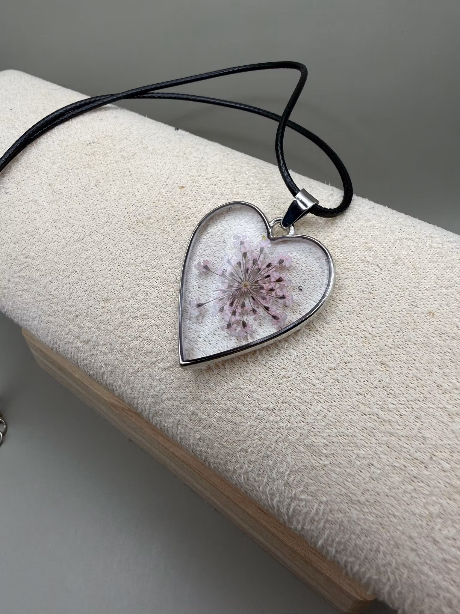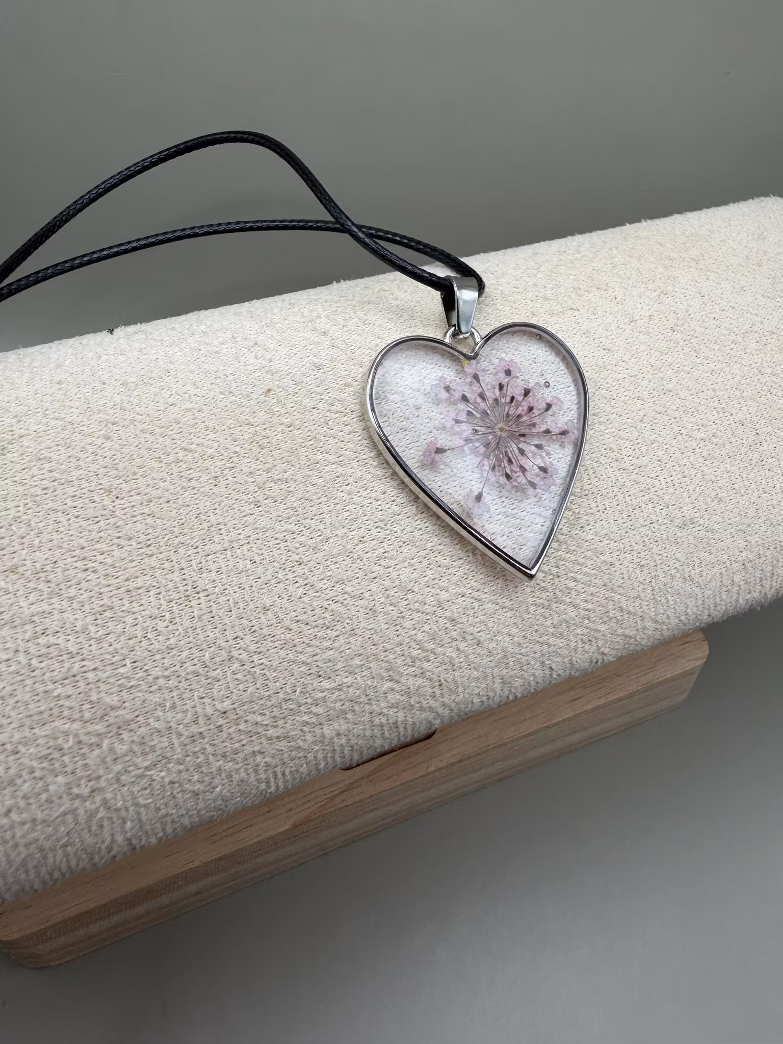 En hjärtformad, silverfärgad berlock i rostfritt stål pryds av ett vackert mönster av en ljusrosa blomma. Ytan är täckt med kristallklar resin som framhäver djupet och ger en exklusiv, glasliknande finish.