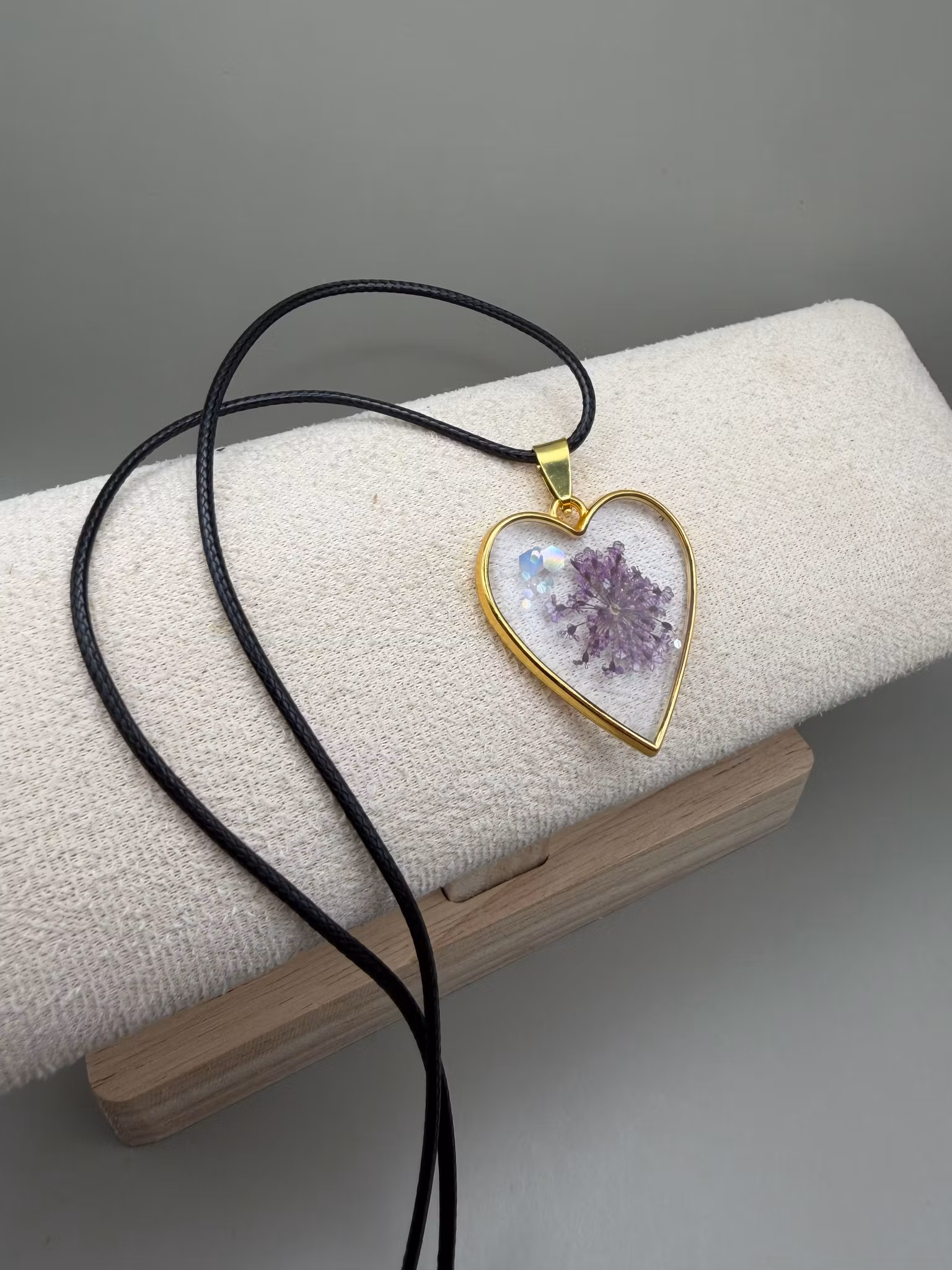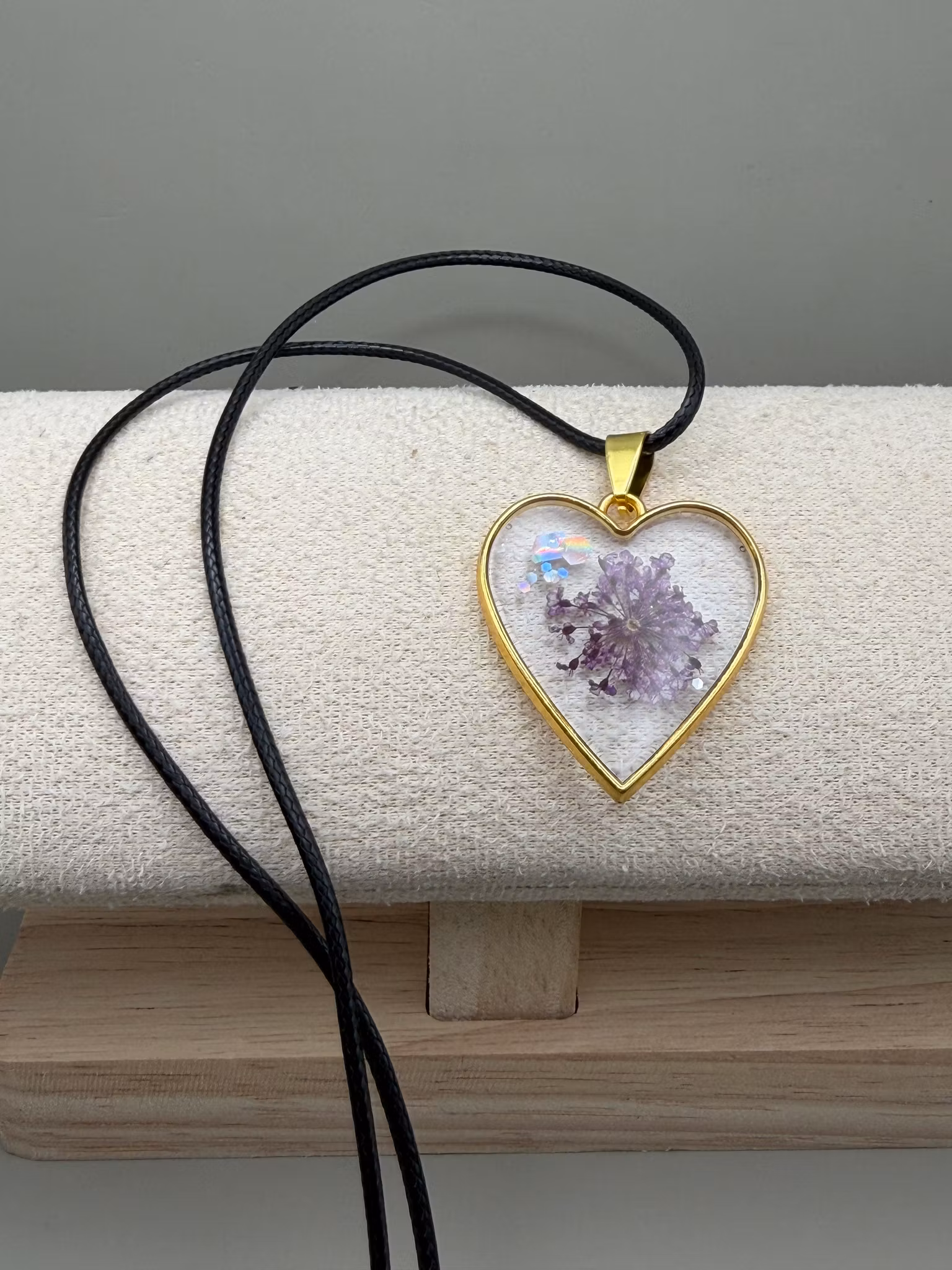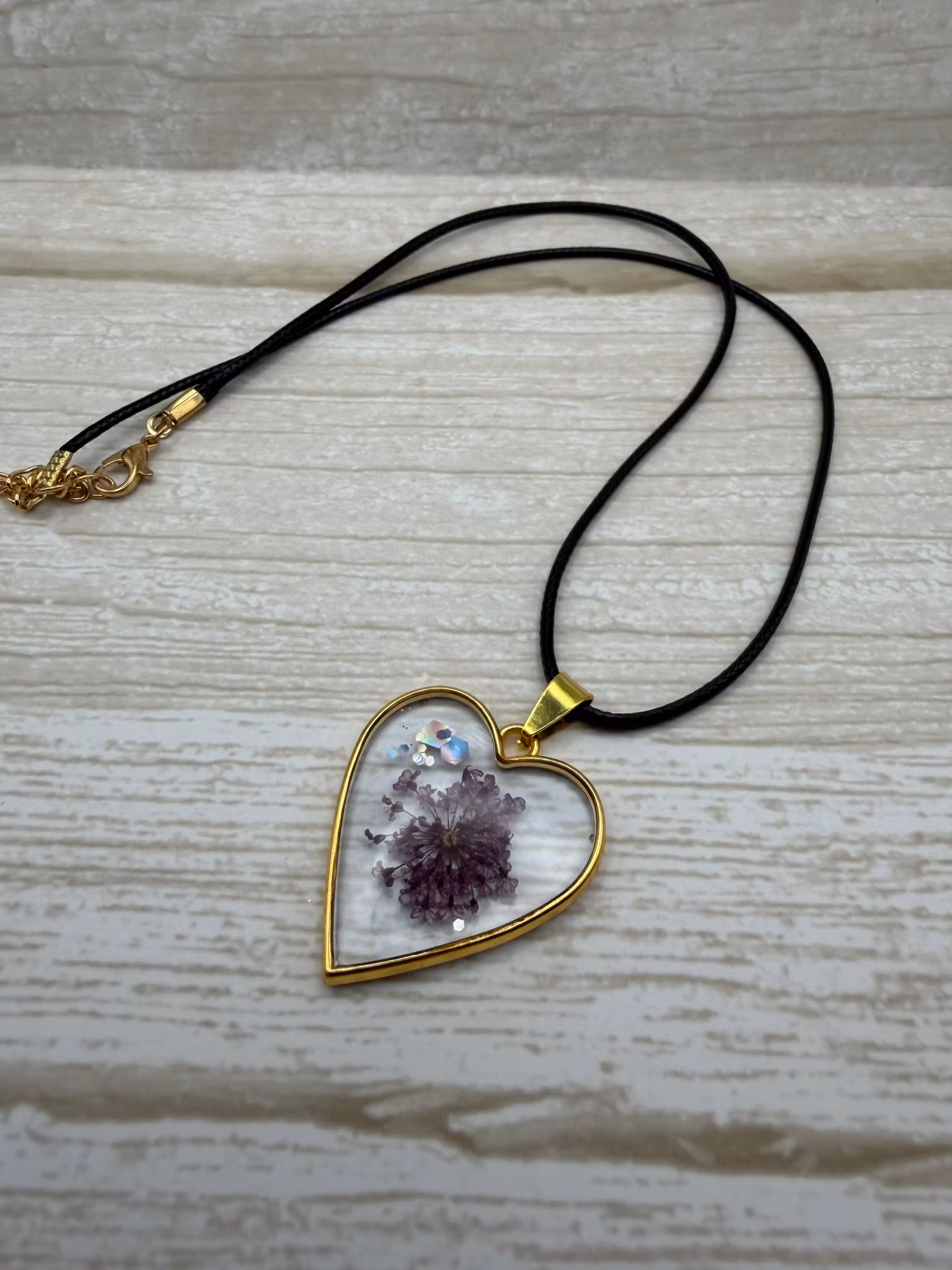 En vacker guldfärgad hjärtberlock i rostfritt stål pryds av ett vackert mönster av en lilafärgad blomma och glitter. Ytan är täckt med kristallklar resin som framhäver djupet och ger en exklusiv, glasliknande finish.