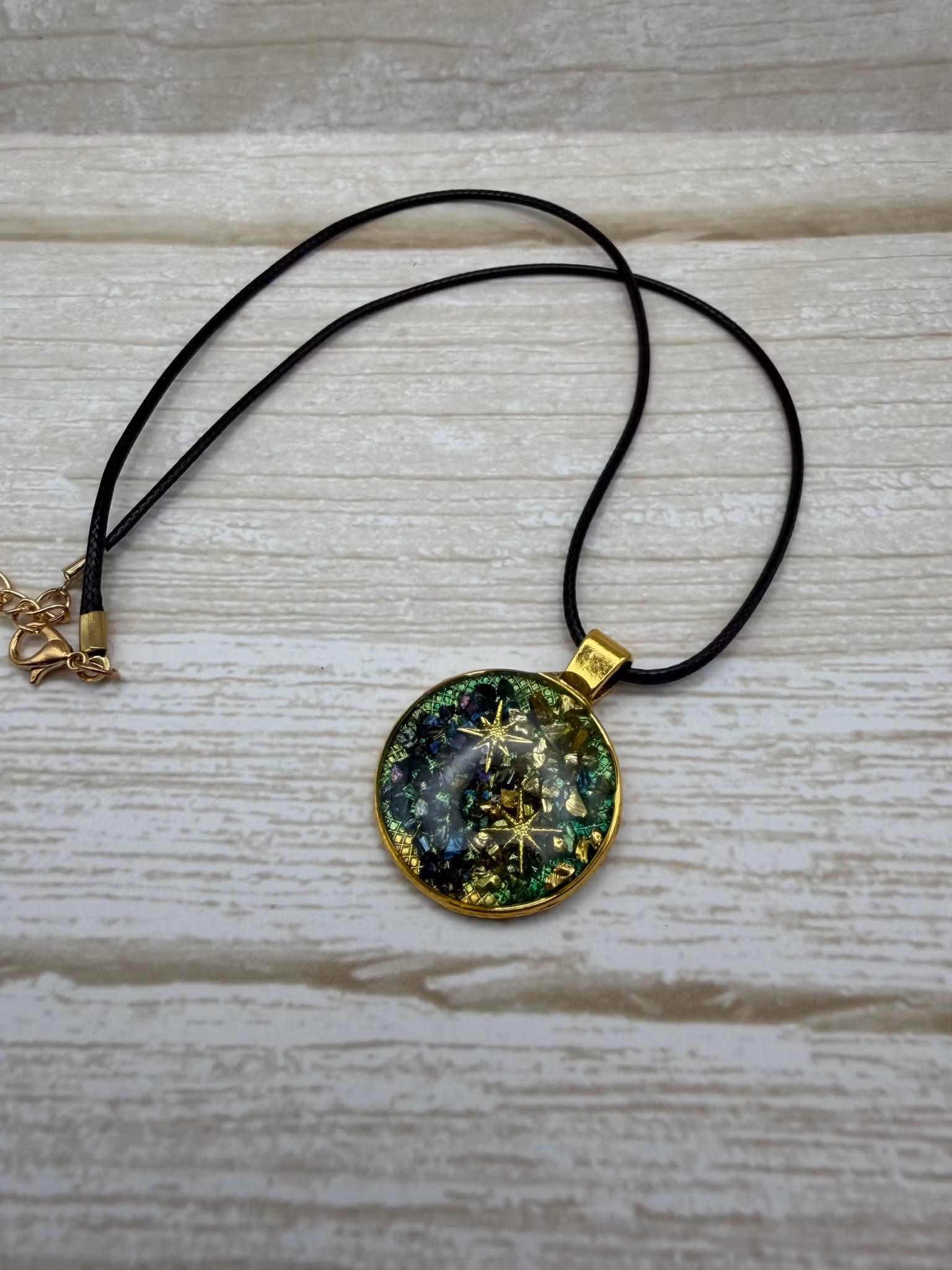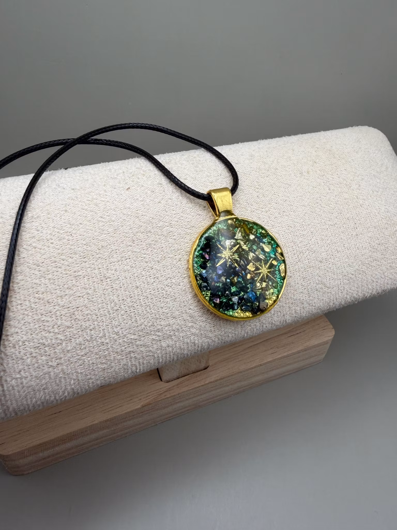 En vacker guldfärgad berlock i rostfritt stål pryds av ett vackert mönster av guld och grågrönfärgat glaskross. Ytan är täckt med kristallklar resin som framhäver djupet och ger en exklusiv, glasliknande finish.