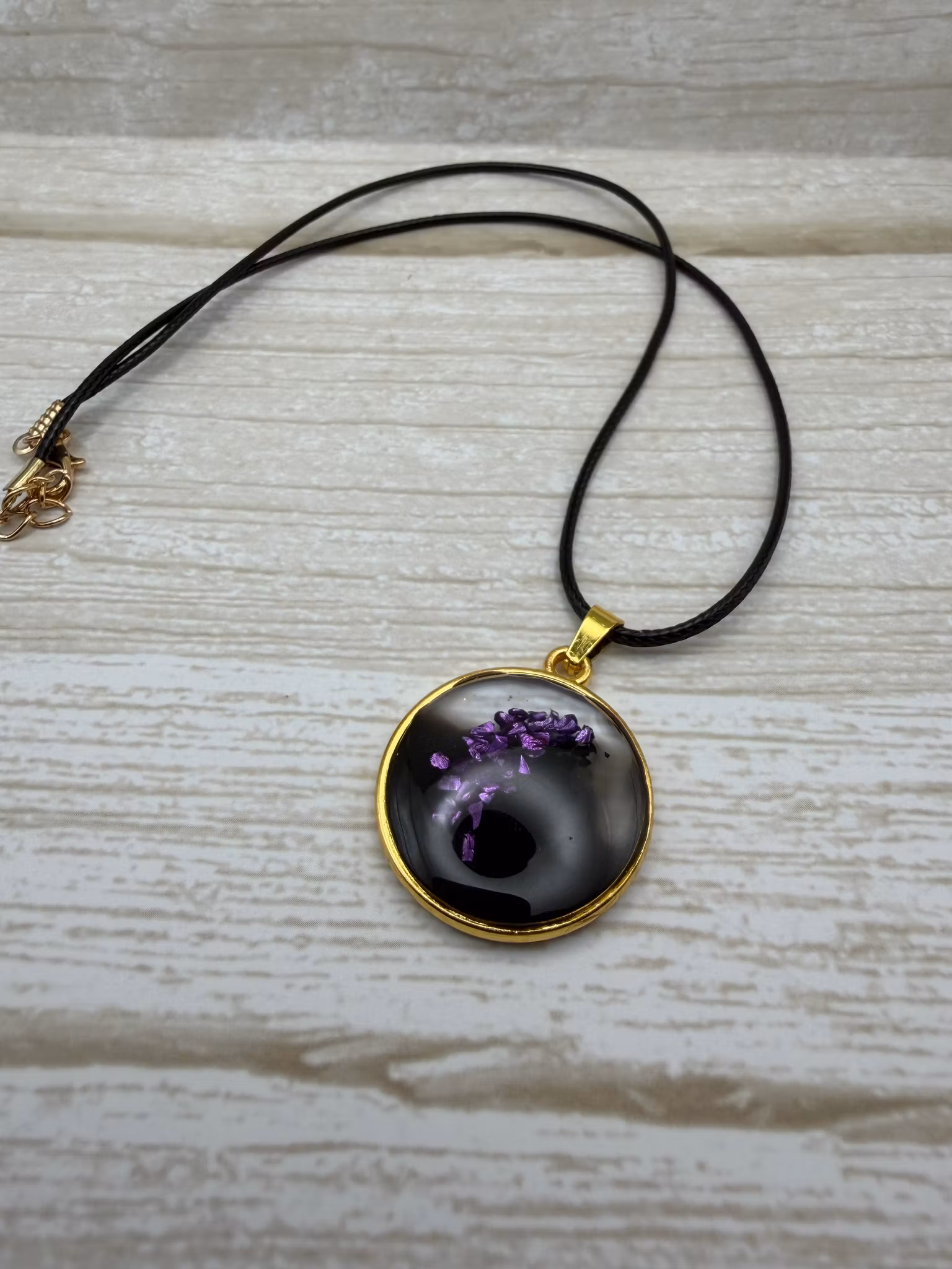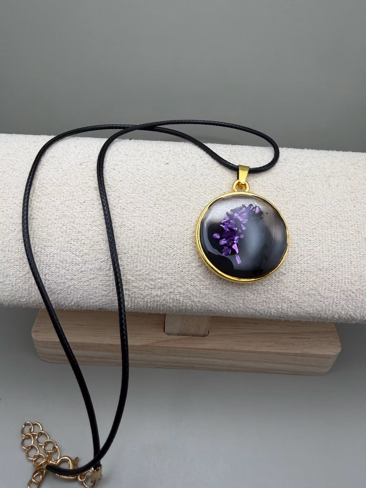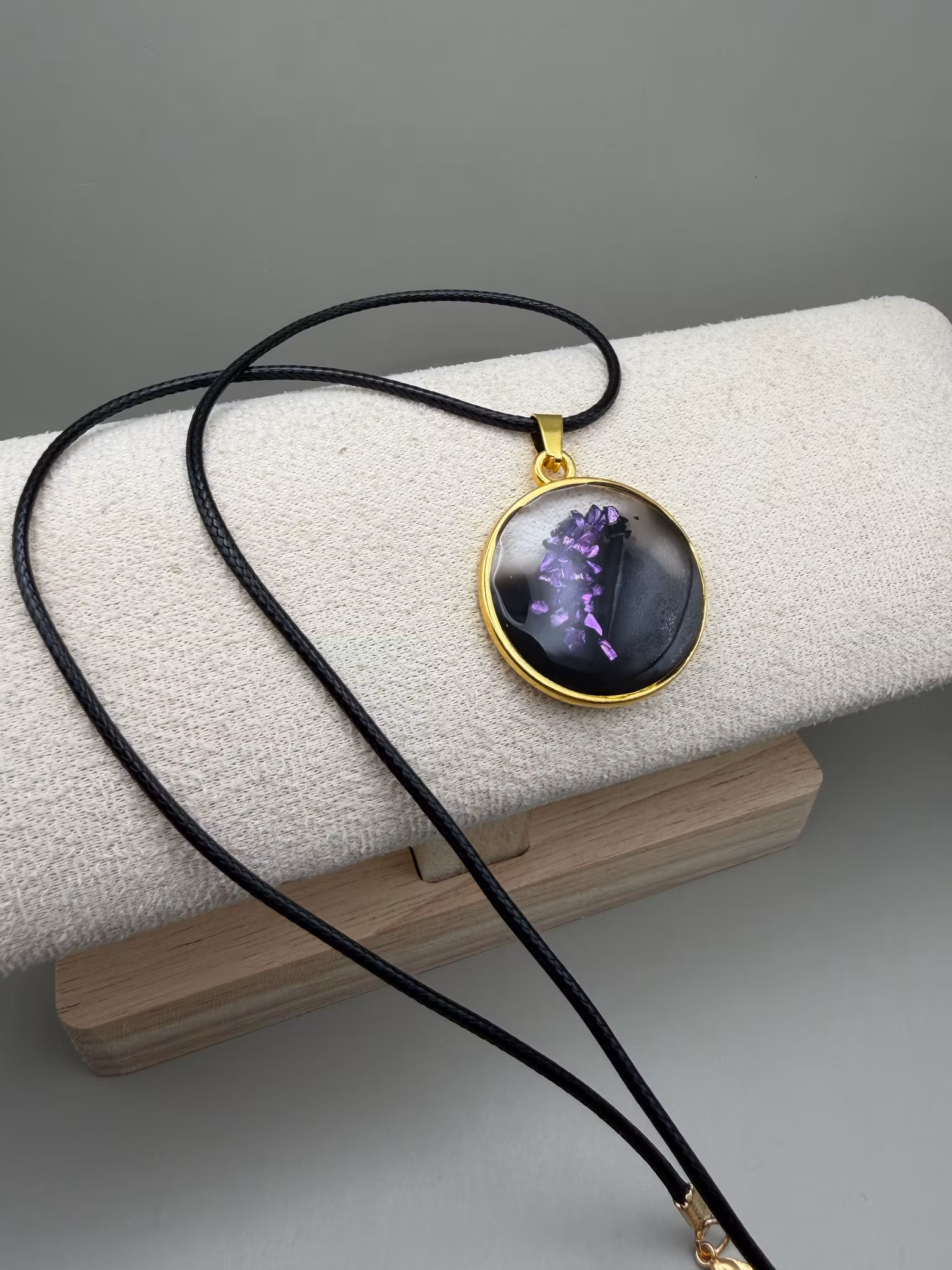 En vacker guldfärgad berlock i rostfritt stål pryds av ett vackert mönster av lila och svart glaskross på svart bakgrund. Ytan är täckt med kristallklar resin som framhäver djupet och ger en exklusiv, glasliknande finish.