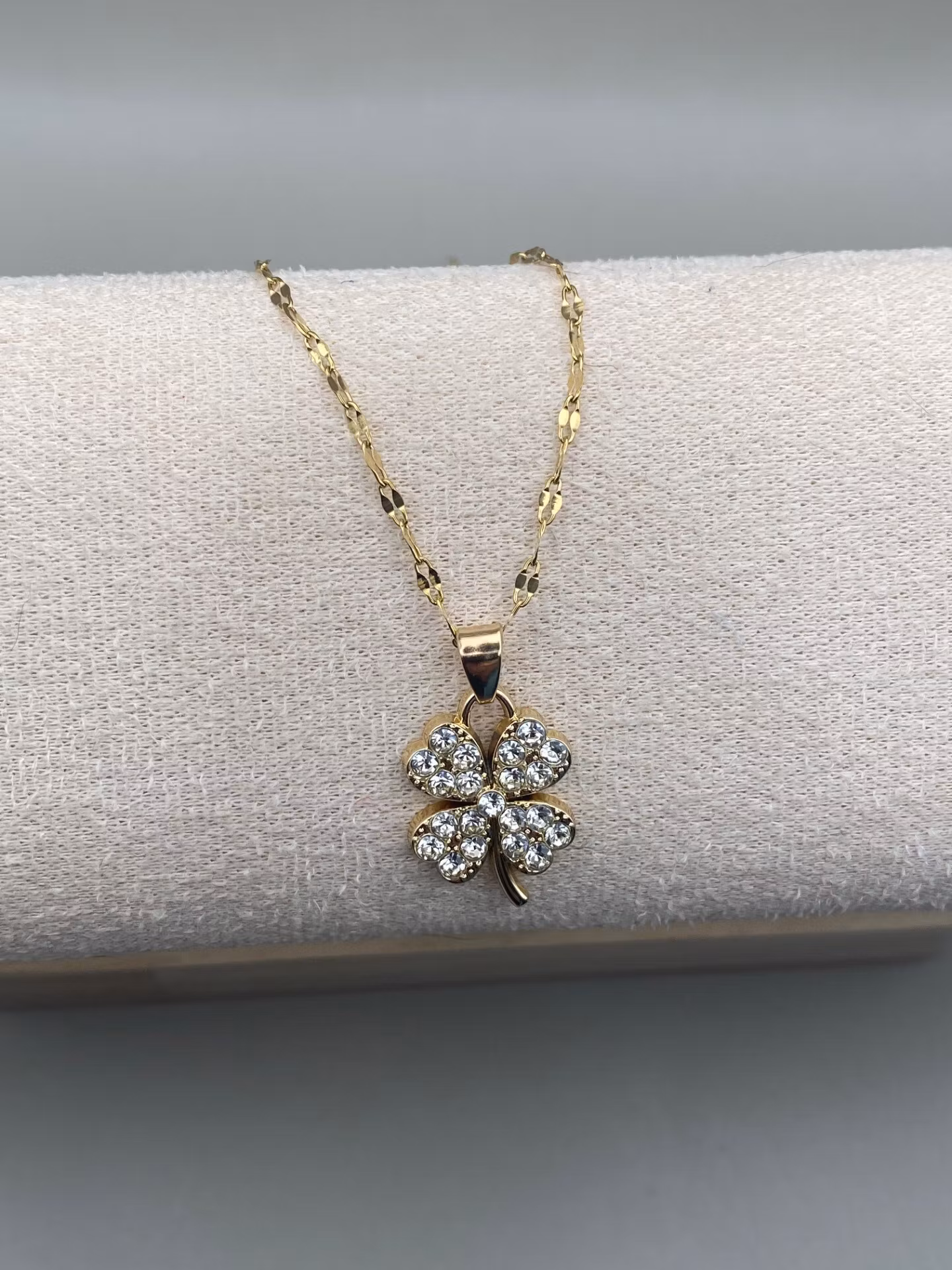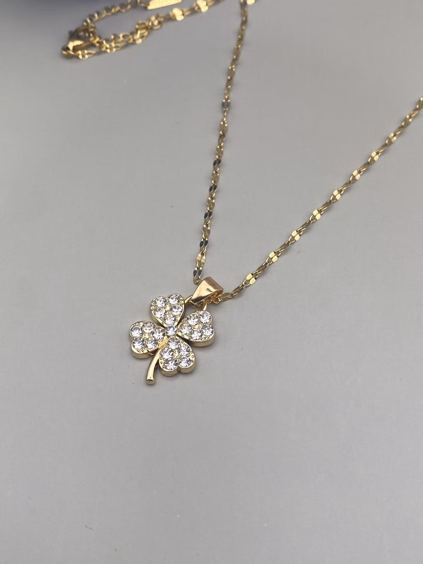 Vackert stilrent halsband i guldfärgad rostfritt stål med fin guldfärgad berlock i form av fyrklöver med rhinestones.