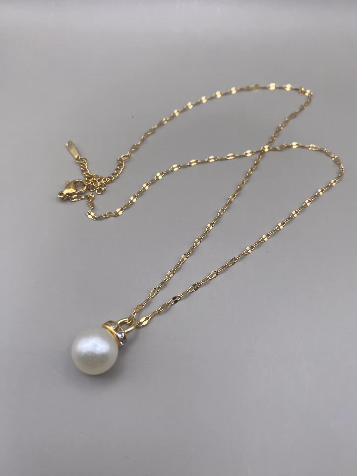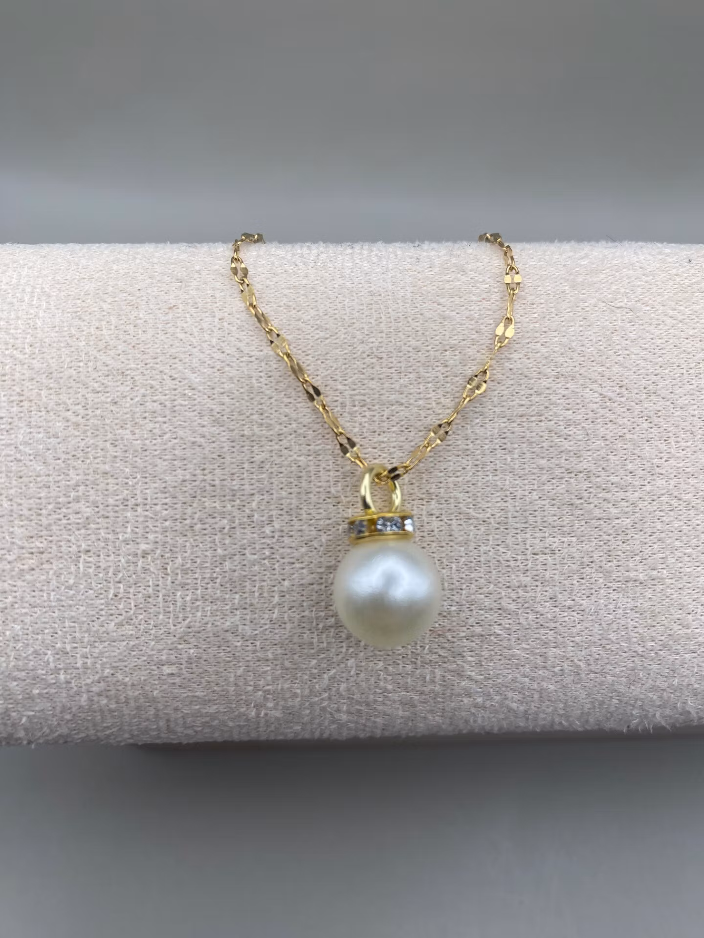 Vackert stilrent halsband i guldfärgad rostfritt stål med stilren berlock i form större benvit pärla med strass.