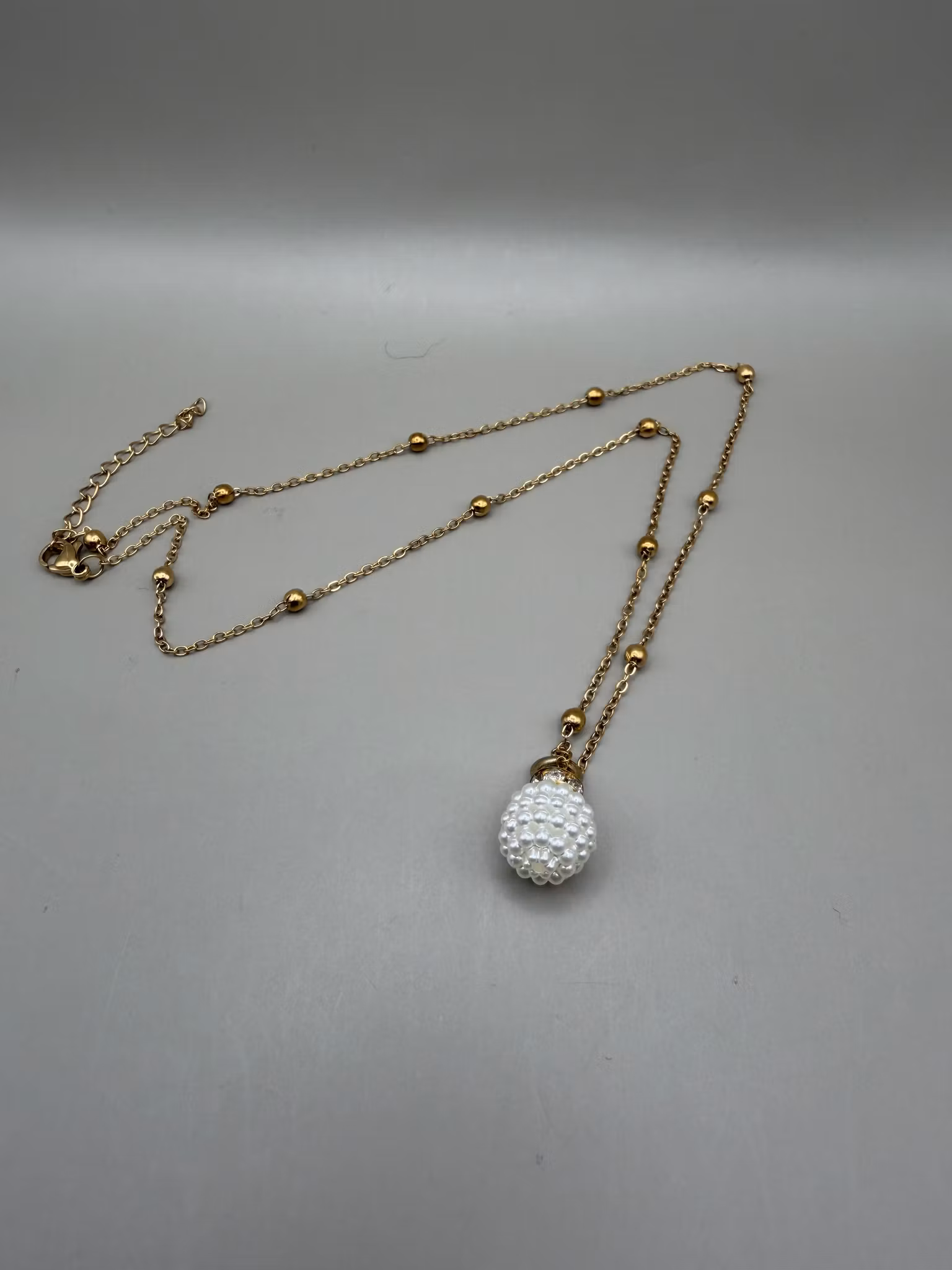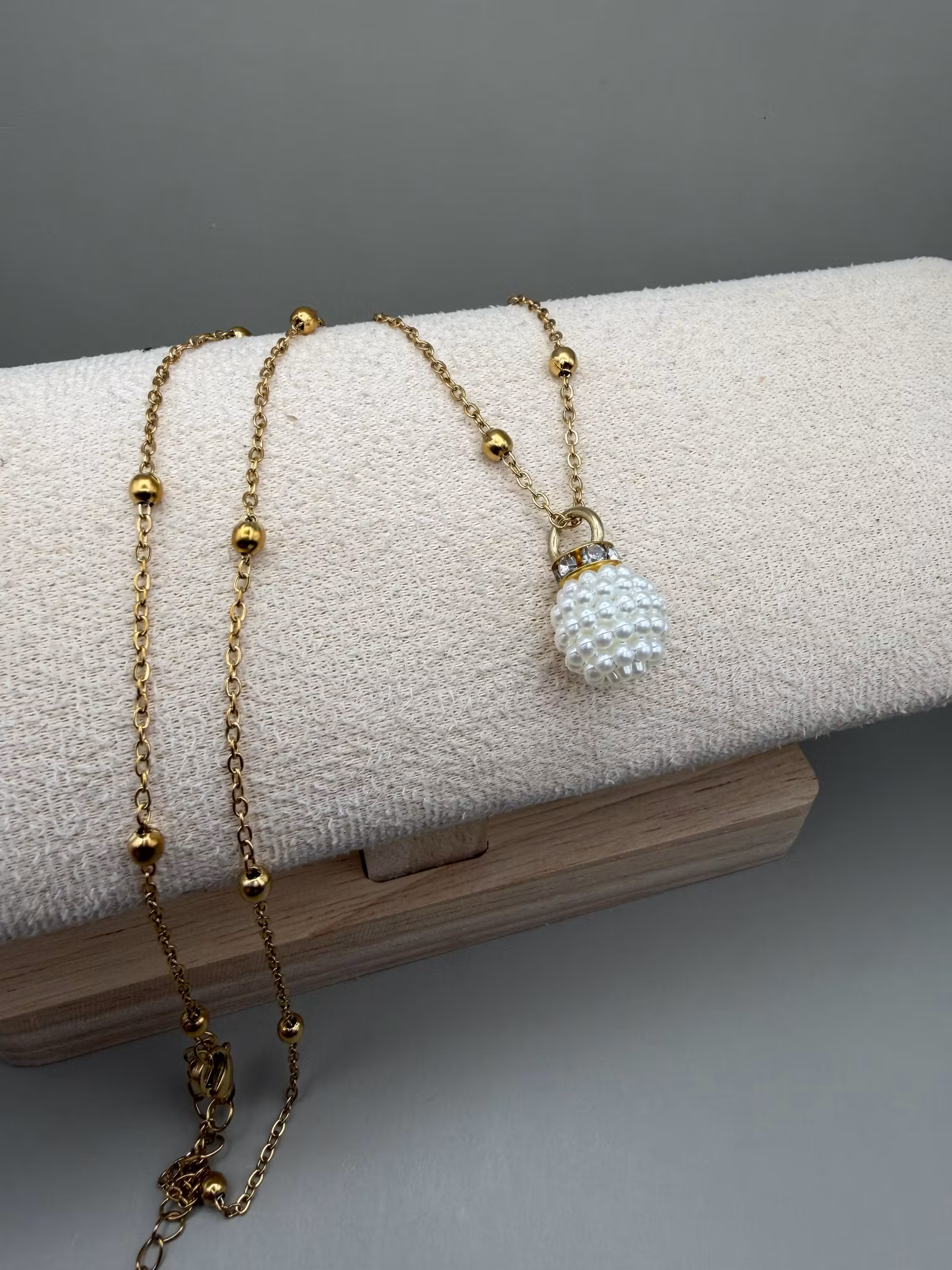 En elegant, tunn guldfärgad kedja i rostfritt stål, dekorerad med små pärlor som ger ett mjukt och detaljrikt uttryck. Smycket pryds av en vacker vit berlock i form av en knottrig pärla, elegant infattad med strass som fångar ljuset på ett subtilt sätt.