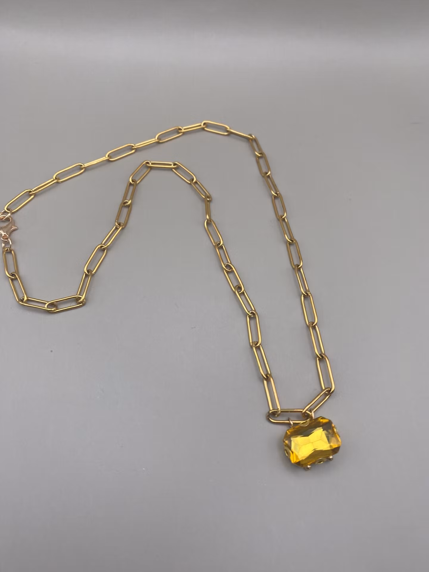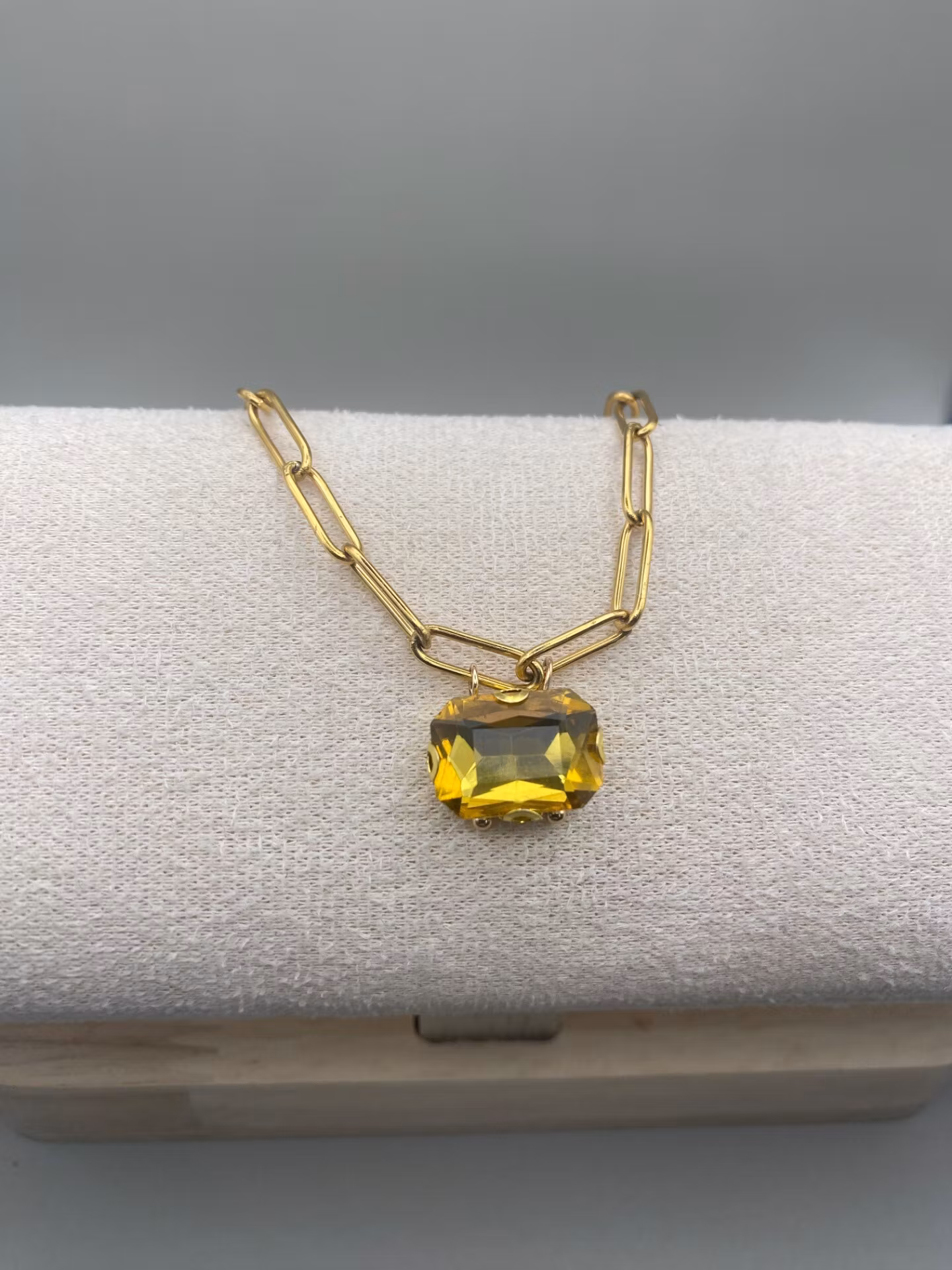 Snyggt halsband i större kantig statement-kedja i guldfärgad rostfritt stål, med en klassisk berlock i form av senapsgul glaskristall strass.