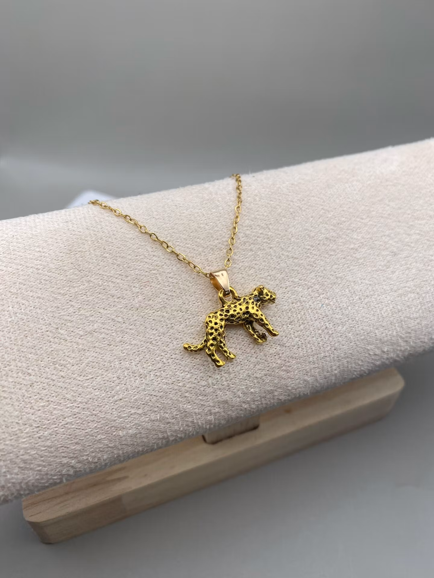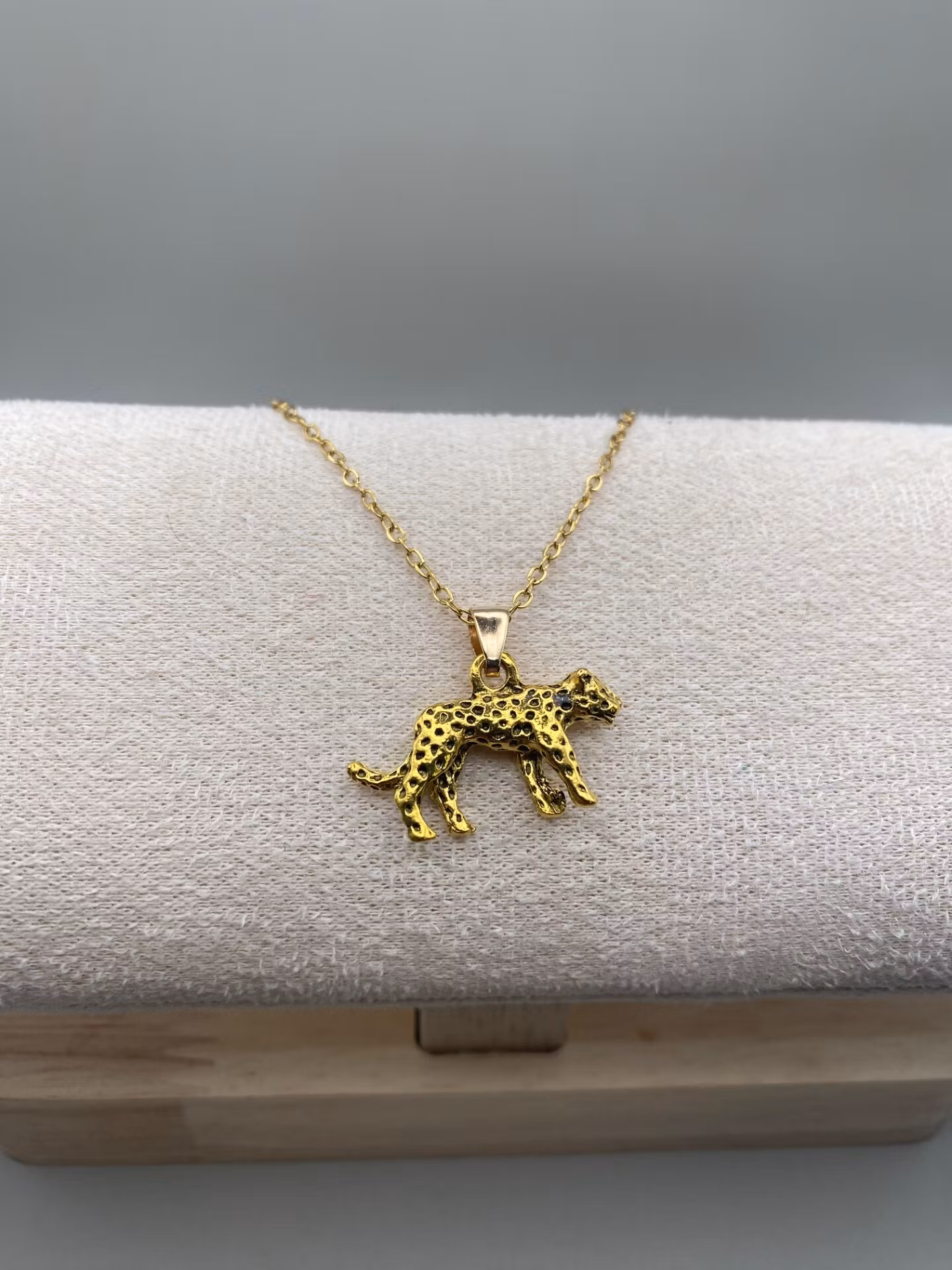 Lekfullt halsband i guldfärgad rostfritt stål med berlock i form guldfärgat kattdjur