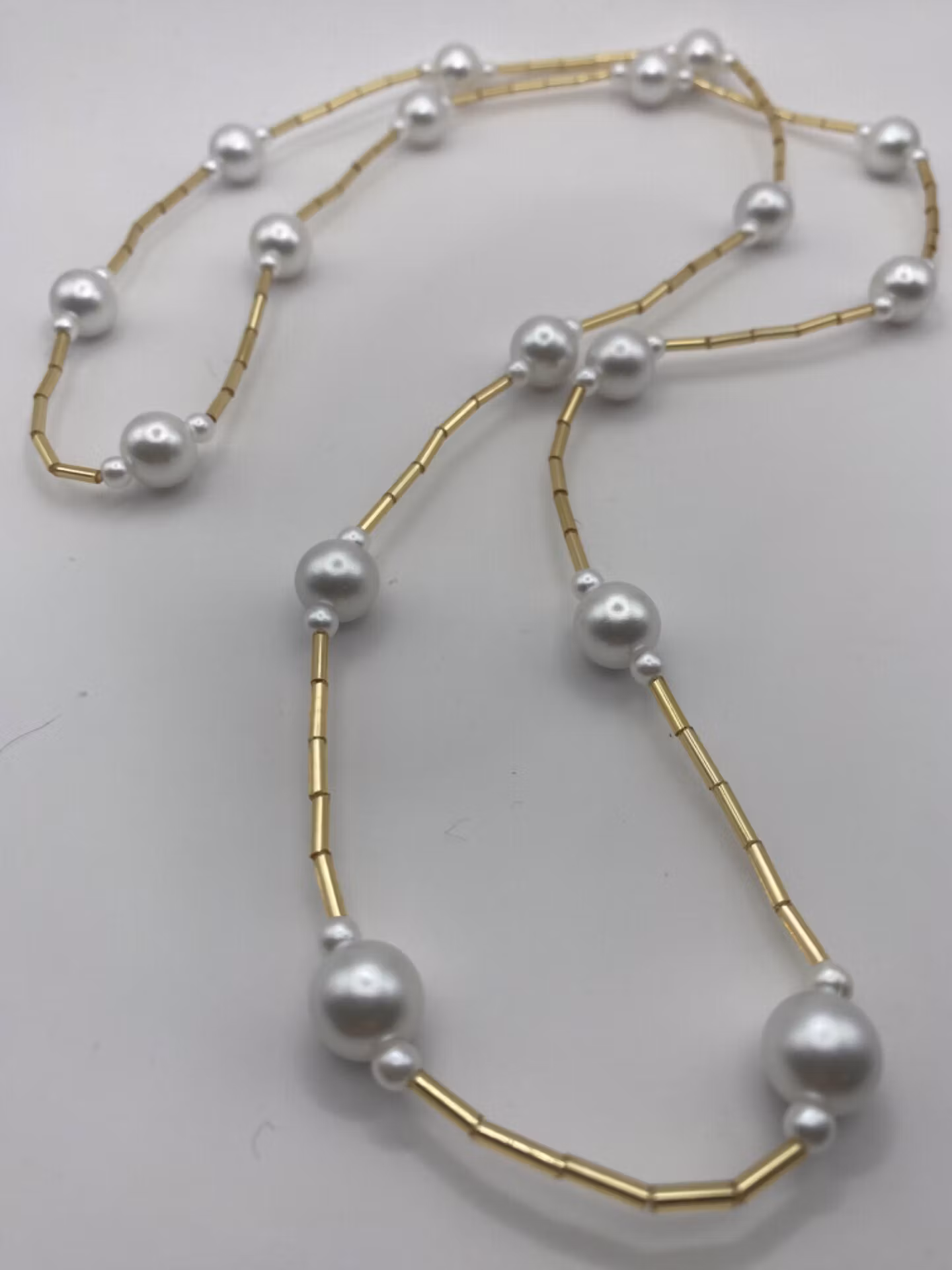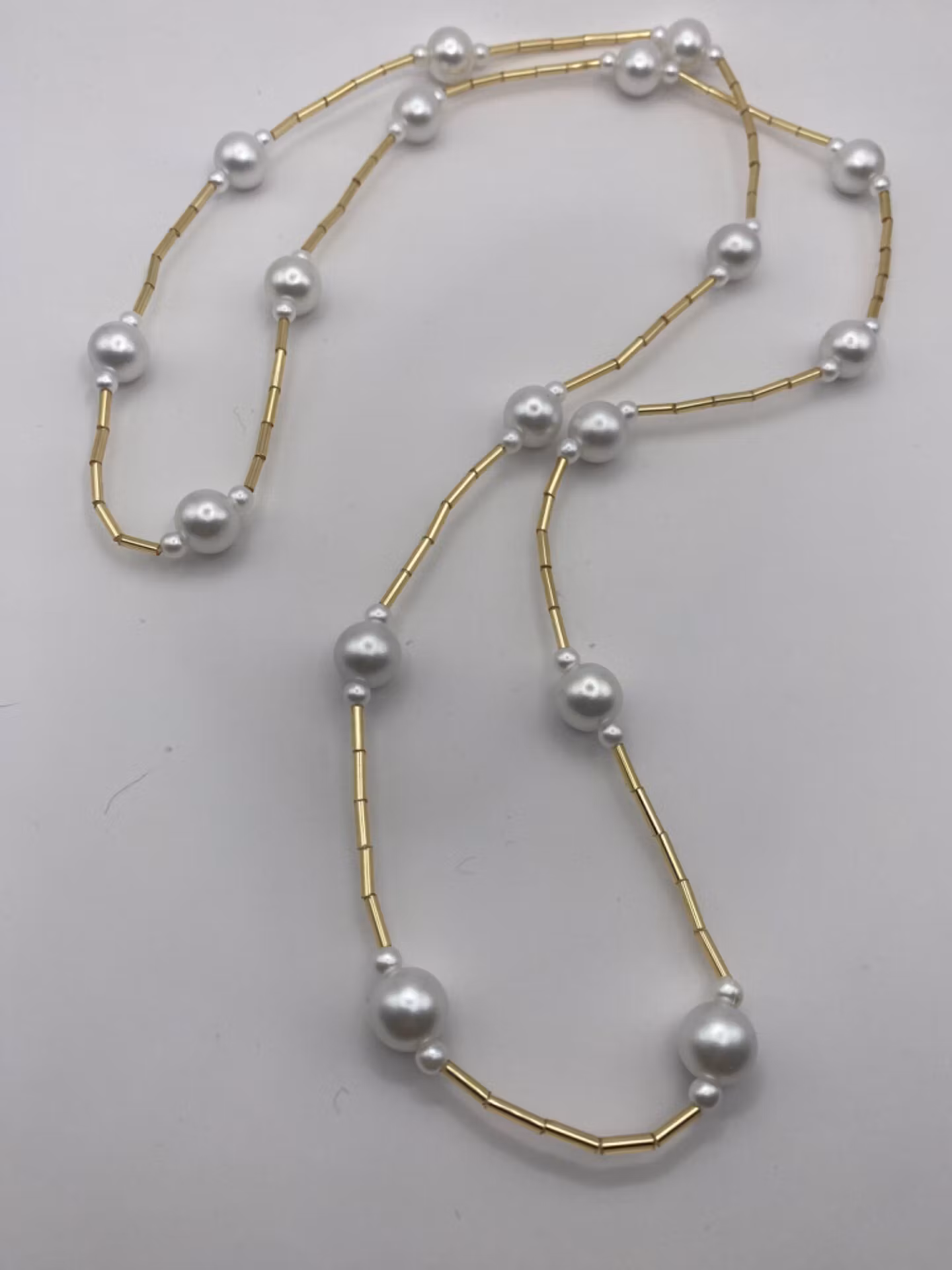 Halsband i vackert mönster av guldfärgade smala långa pärlor och kritvita vaxade större pärlor med jämna mellanrum. Halsbandet är 85cm i omkrets, ej öppningsbar utan träs enkelt över huvudet.