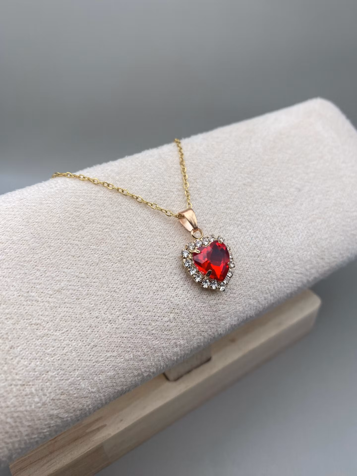 Sött halsband i guldfärgad rostfritt stål med berlock i form av hjärta med röd glassten och strass