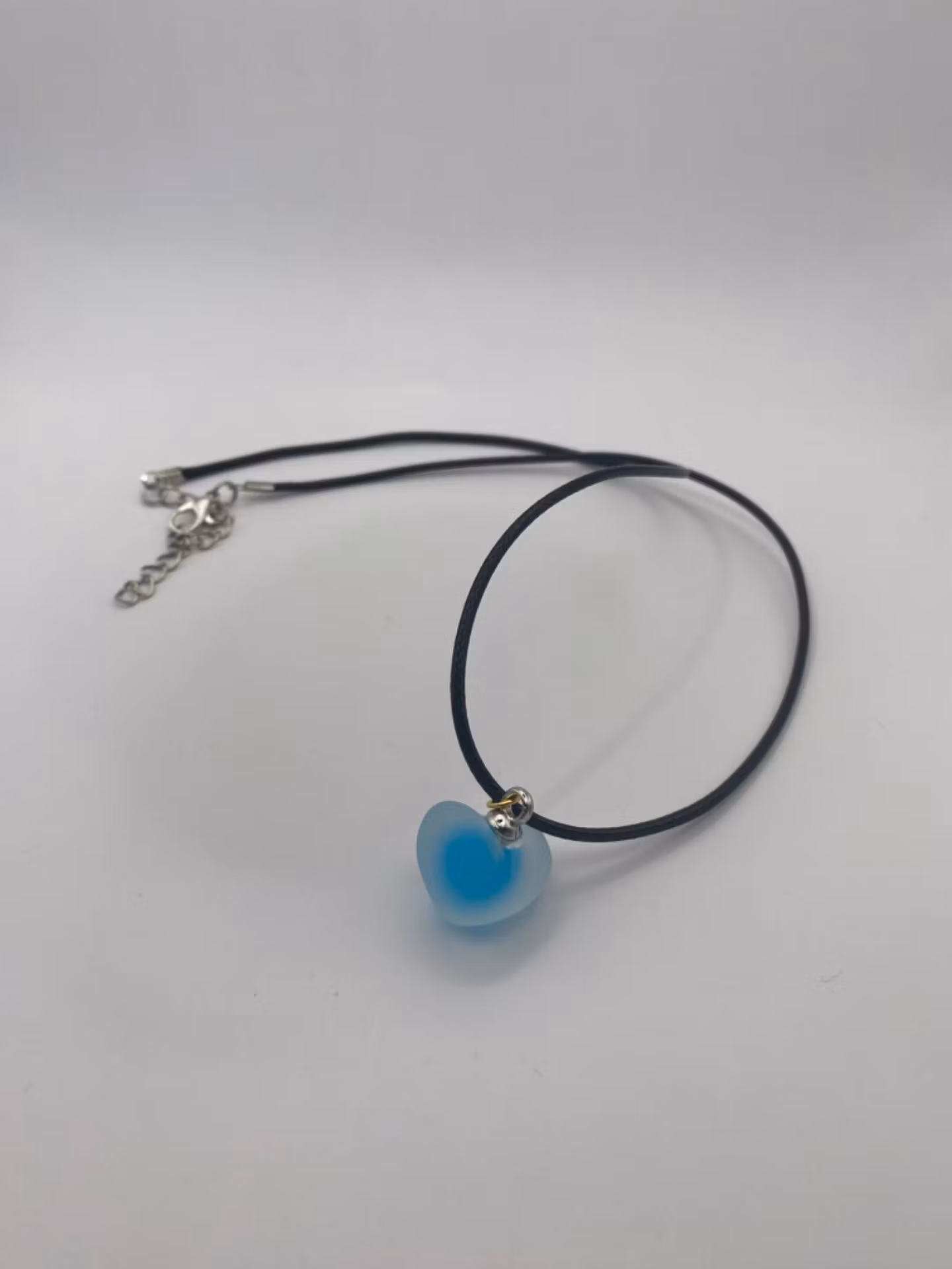 Svart läderhalsband med en berlock i form av ett frostat hjärta turkos färgklick i.