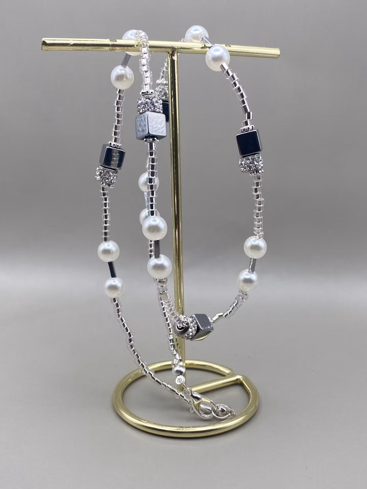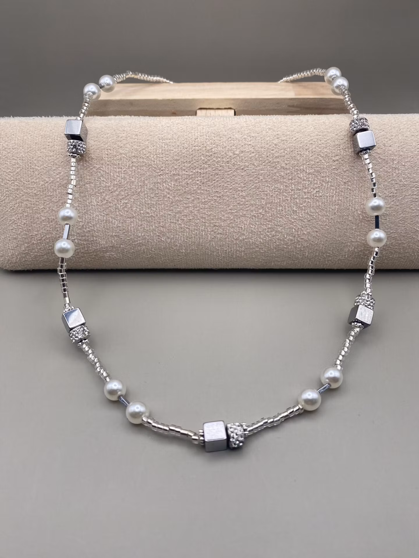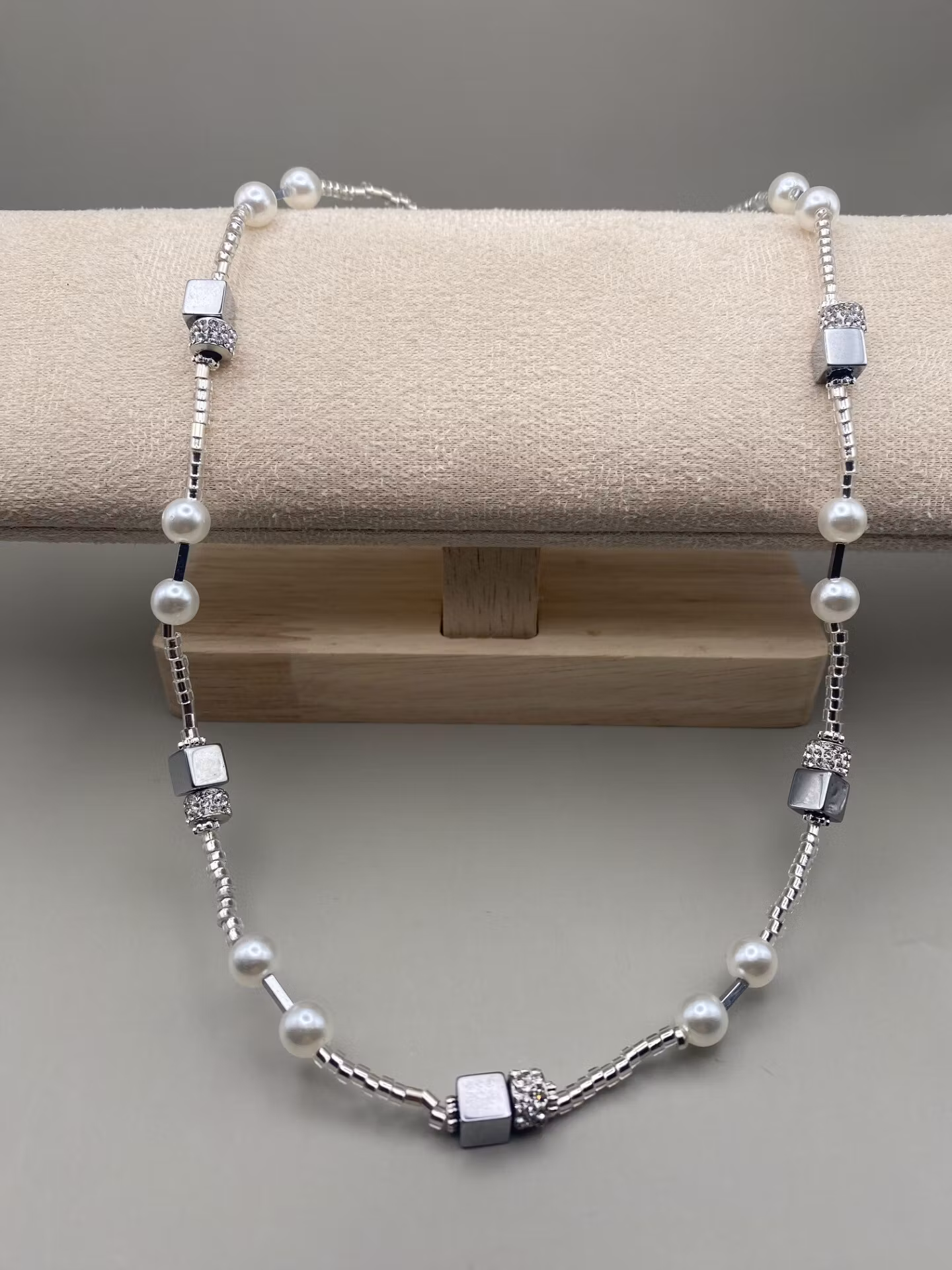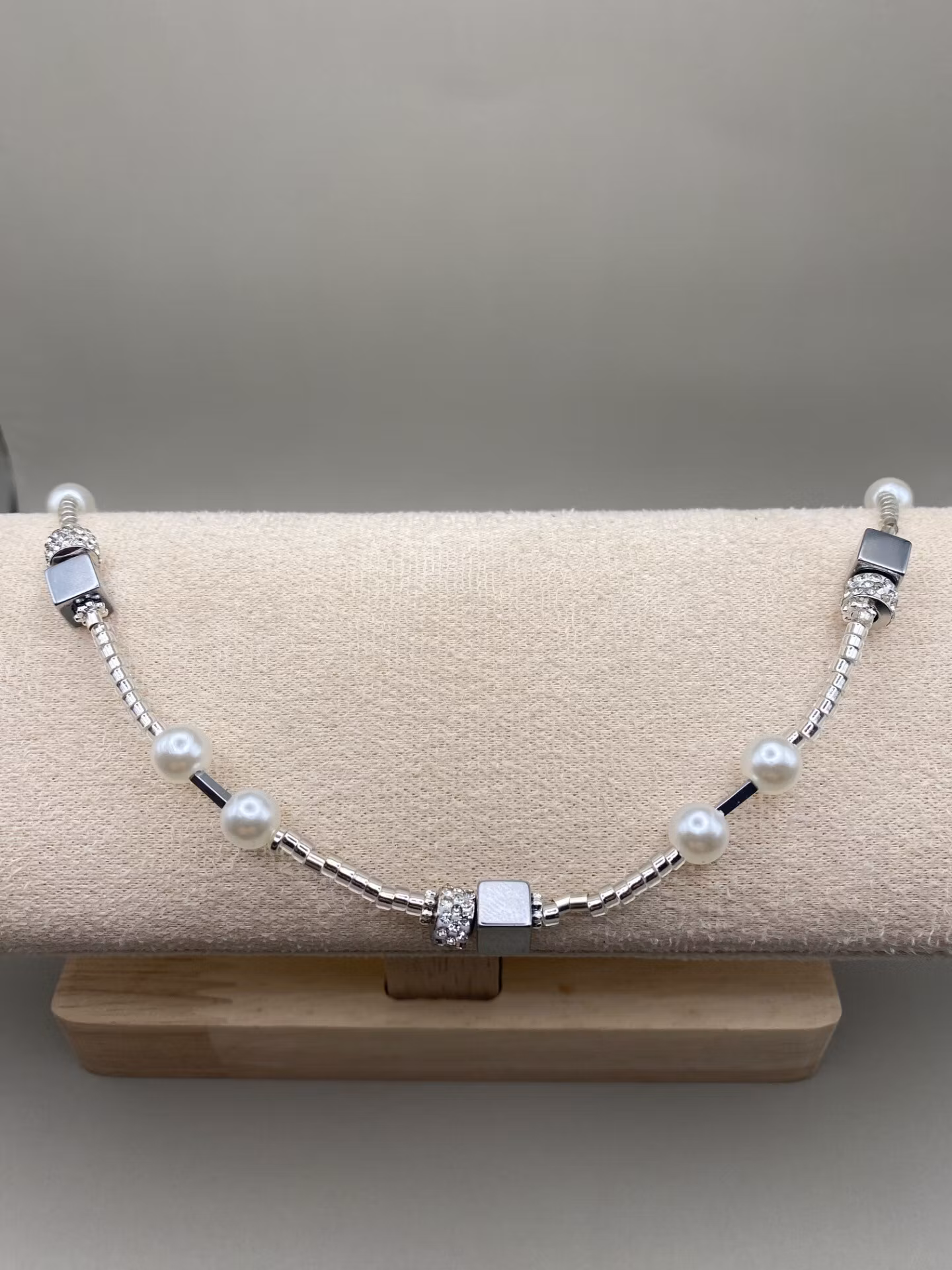 Väldigt stiligt halsband i vackert mönster av små silverfärgade glasstenar i varvat mönster av elfenbensvita högblanka pärlor och silverfärgade avlånga kantiga hematitpärlor samt stora fyrkantiga silverfärgade hematigtpärlor och strass.