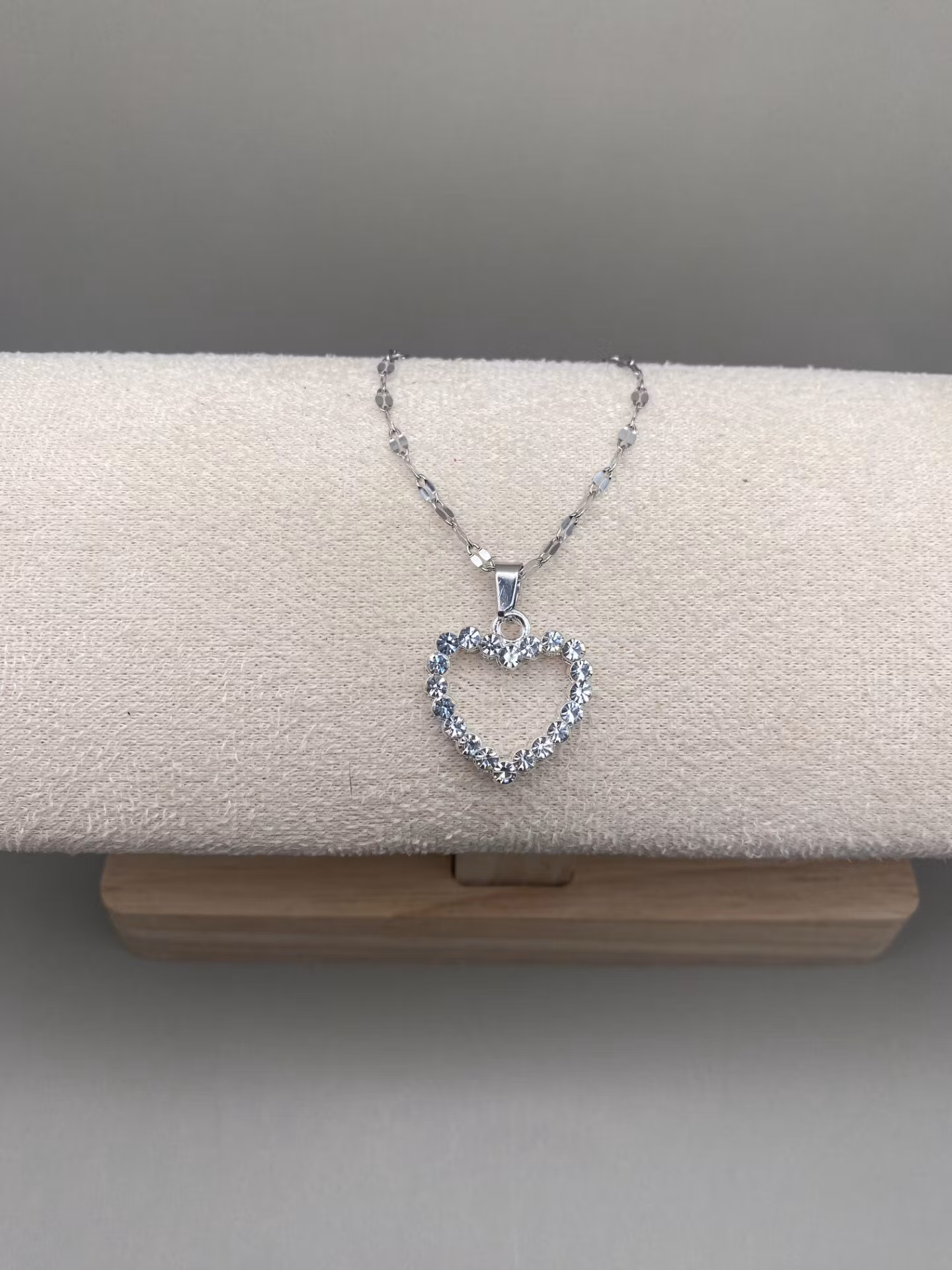 Vackert halsbandi silverfärgad rostfritt stål med vacker berlock i form av ett silverfärgat hjärta med strass.