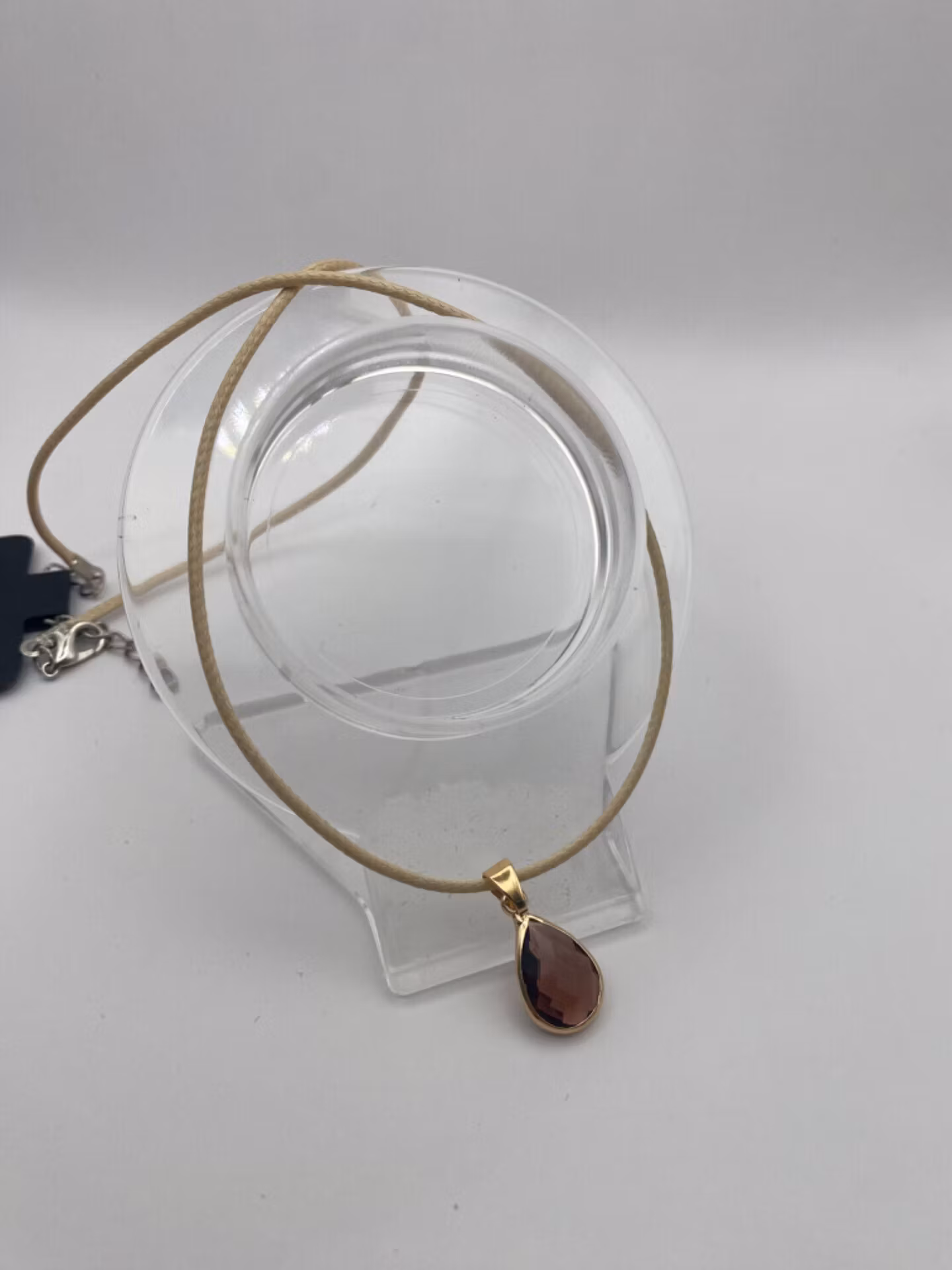 Halsband, beige läderband med guldfärgat droppformat hänge med dovt lila/brun glaspärla