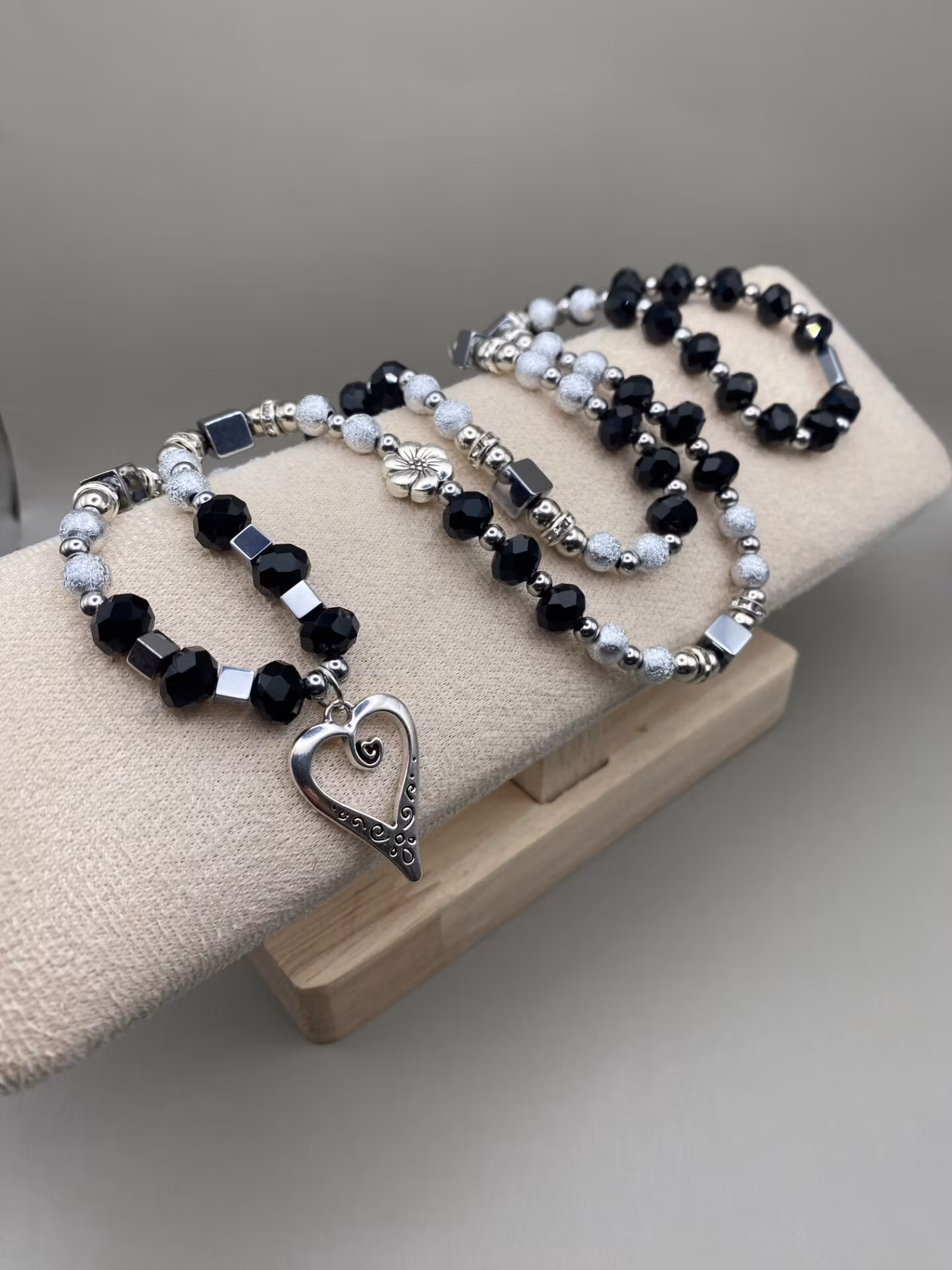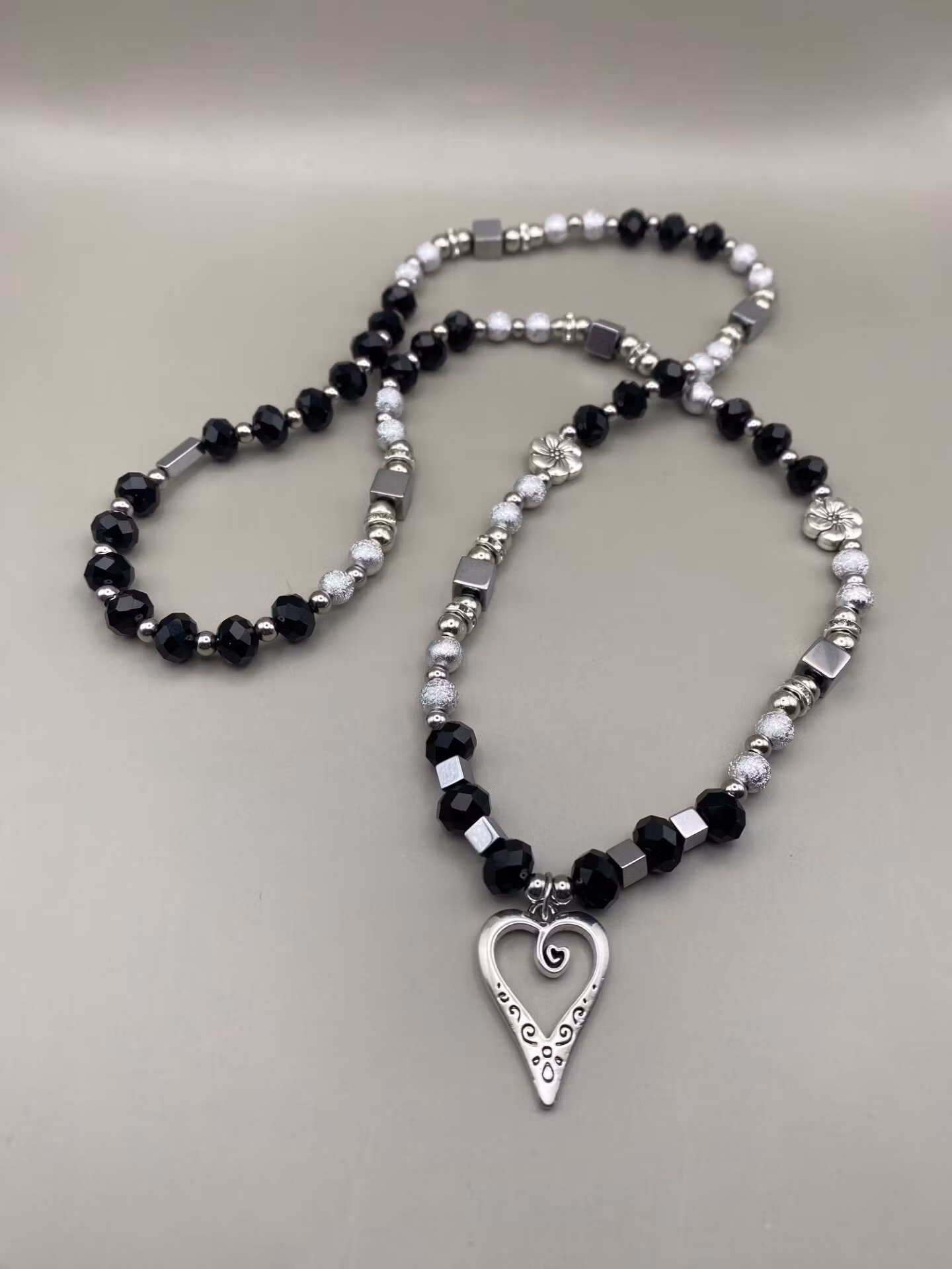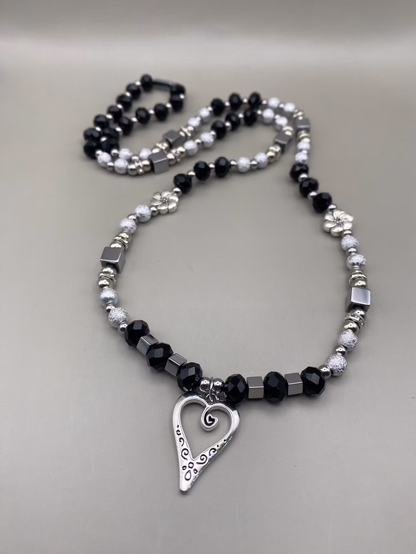Läckert långt halsband med mix av nattsvarta glaskristallpärlor, silverfärgade pärlor i olika storlekar, silverborstade pärlor och fyrkantiga hematitpärlor i vackert mönster. Två dekorativa blommor och ett vackert hänge i form av silverfärgat hjärta.
