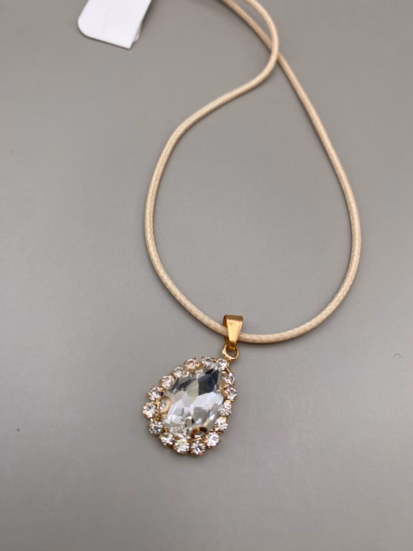 Fint halsband i beige tygkedja och berlock i form av guldfärgad droppformad glassten med strass runt om.