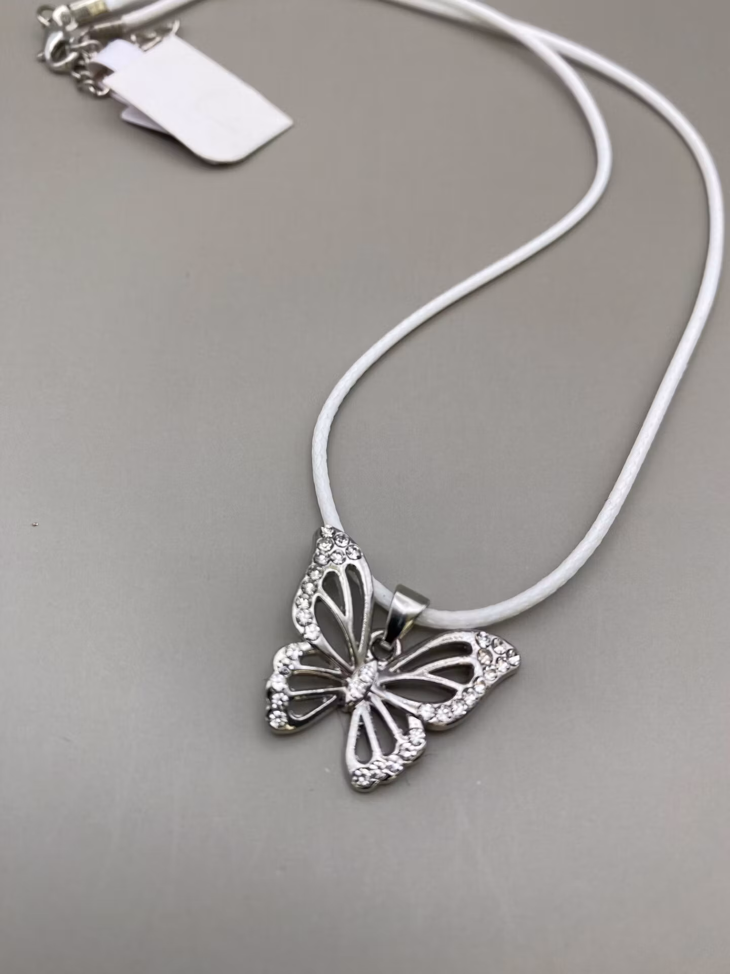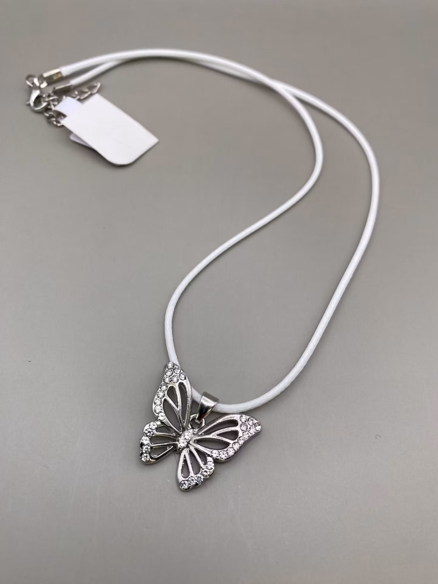 Tufft halsband i vit tygkedja och berlock i form av silverfärgad fjäril