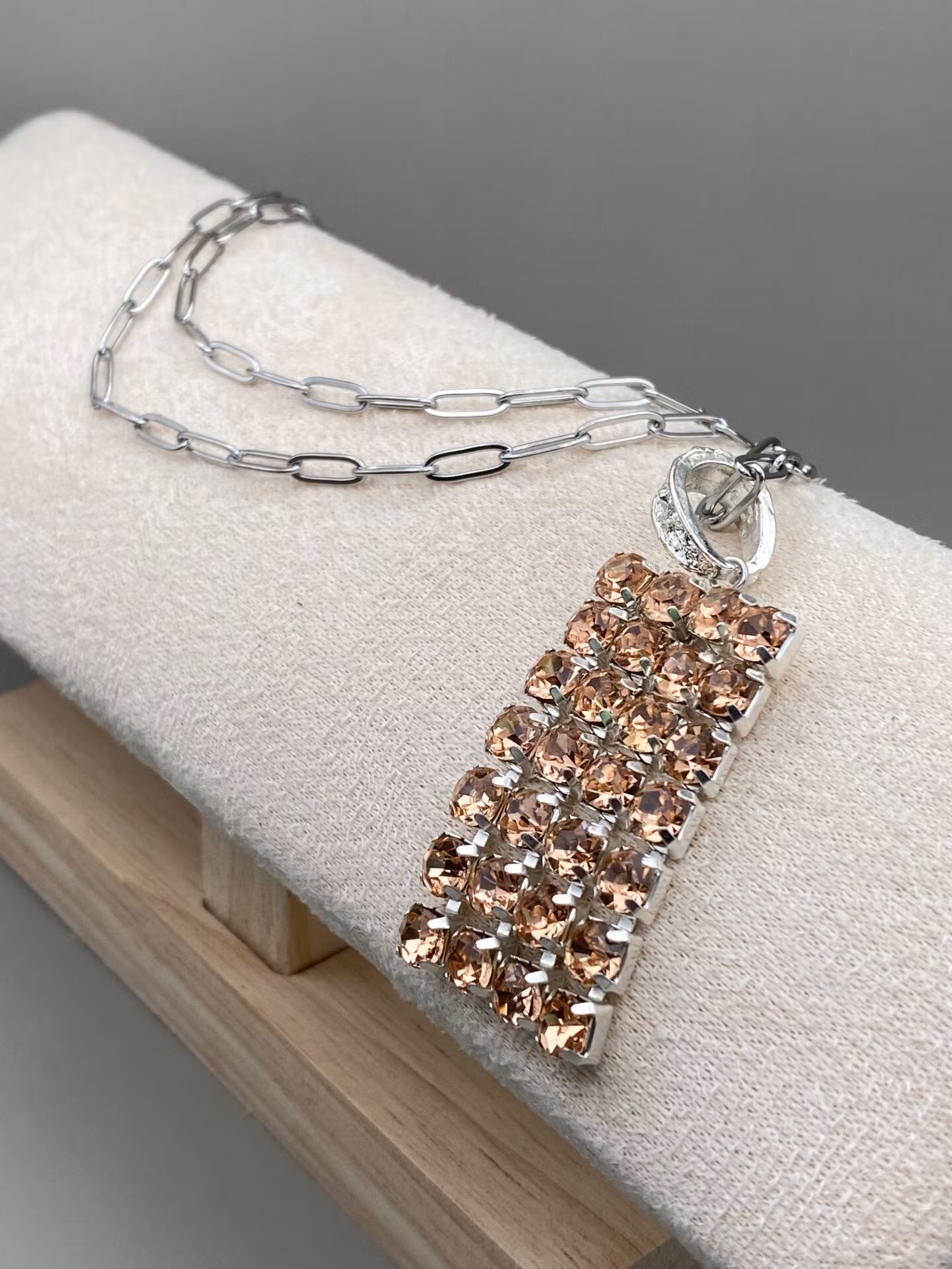 Vackert halsband i silverfärgad kedja med stort mönster, härligt skimrande berlock i ljusrosa strass. Kedjan är i rostfritt stål och är fullt reglerbar till 48cm