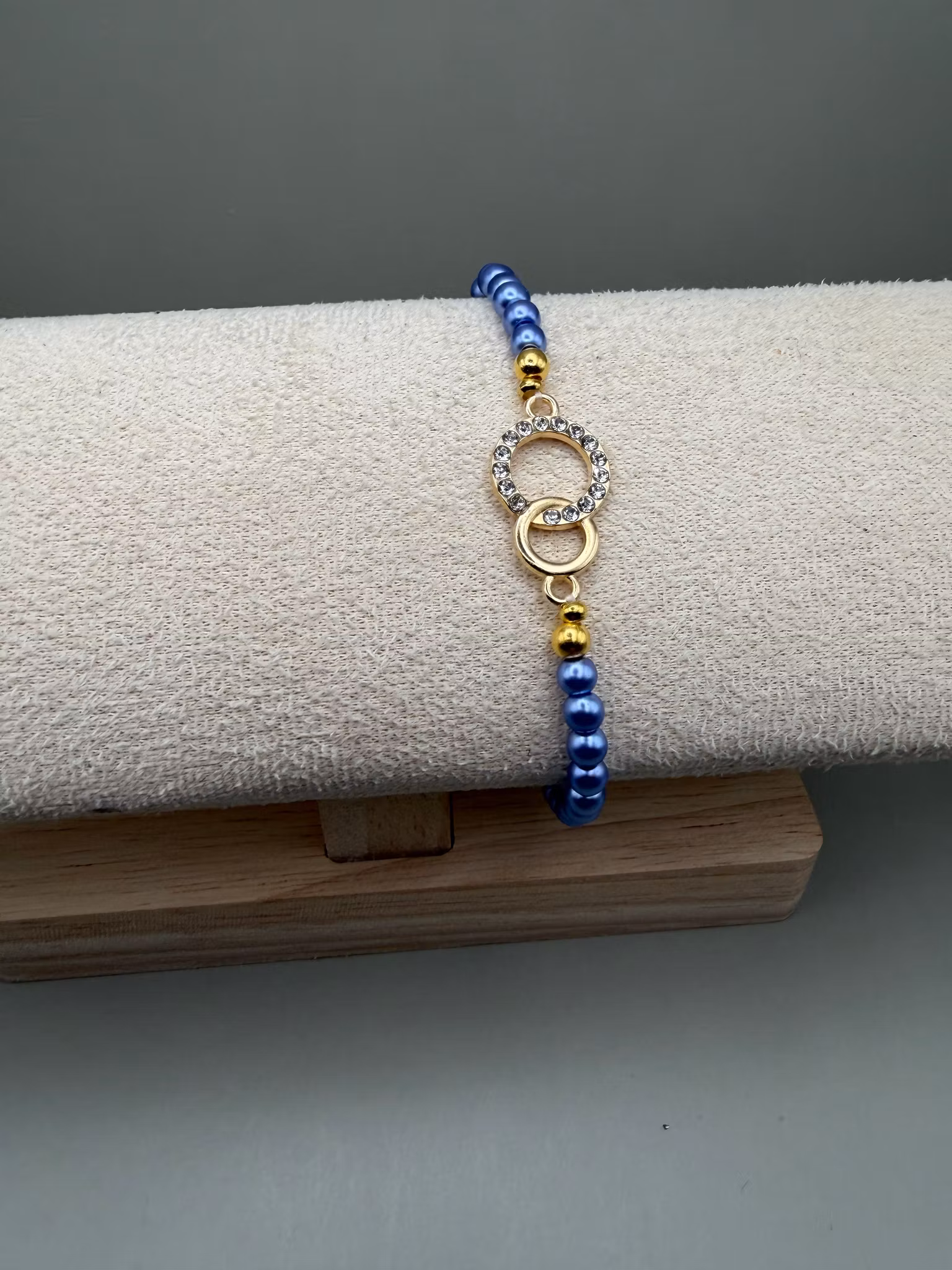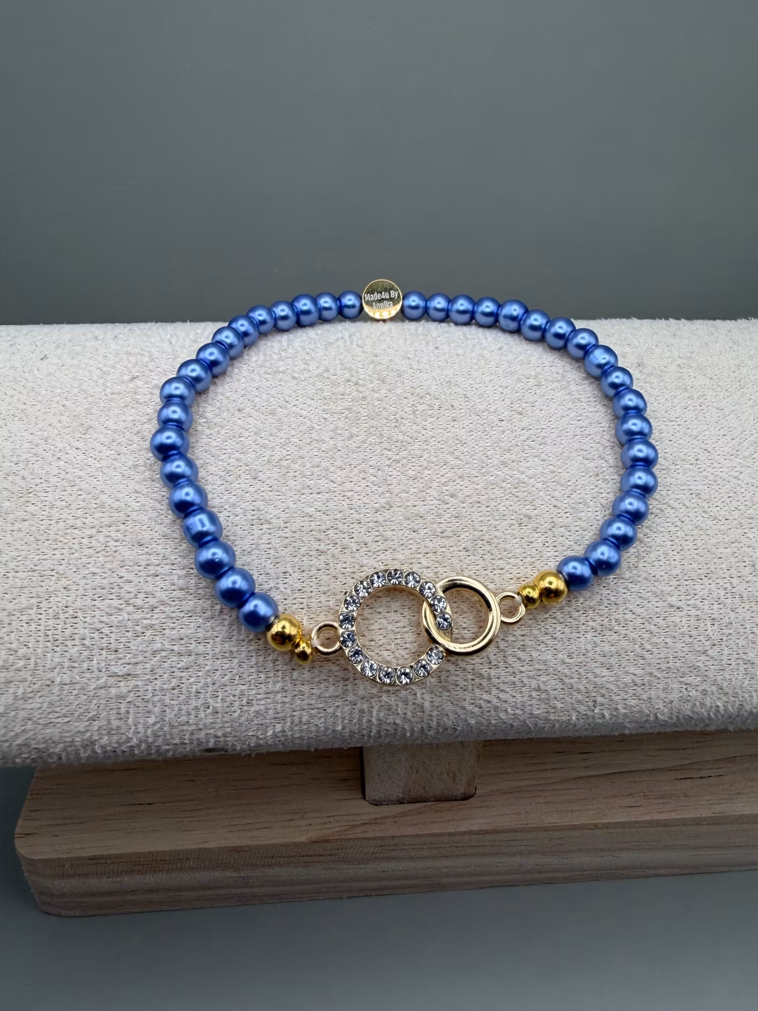 Vackert tunt pärlarmband med duvblå små pärlor och vacker berlock med strass. Smycket avslutas med min unika signaturpärla.