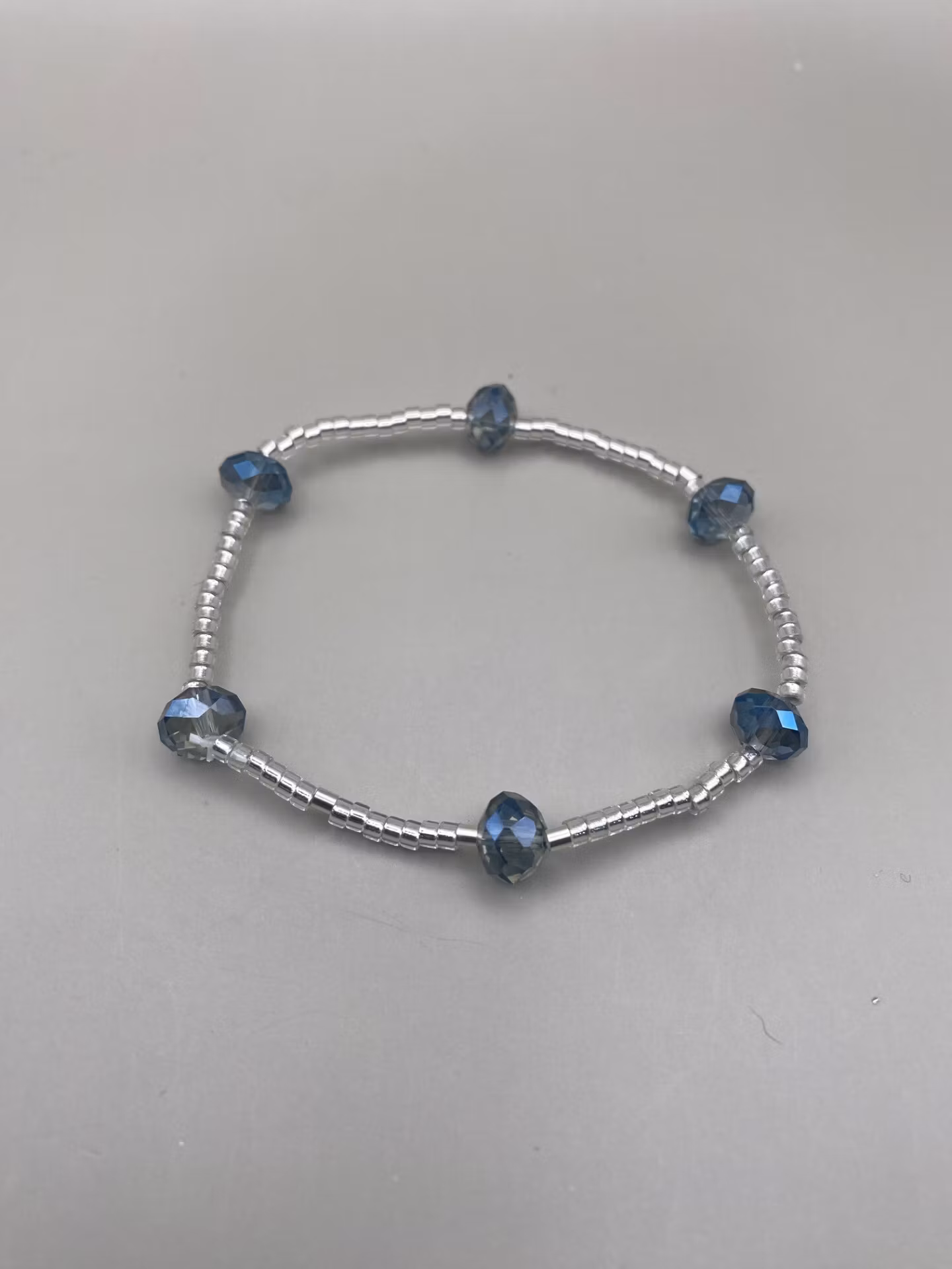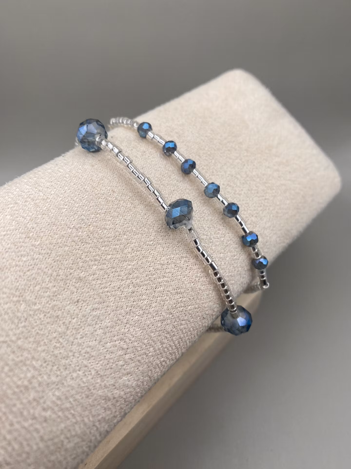 Elegant, diskret men utmärkande armband i små små silverfärgade glaspärlor i fint varvat mönster med dovt blåmellerade stora glaskristallpärlor.