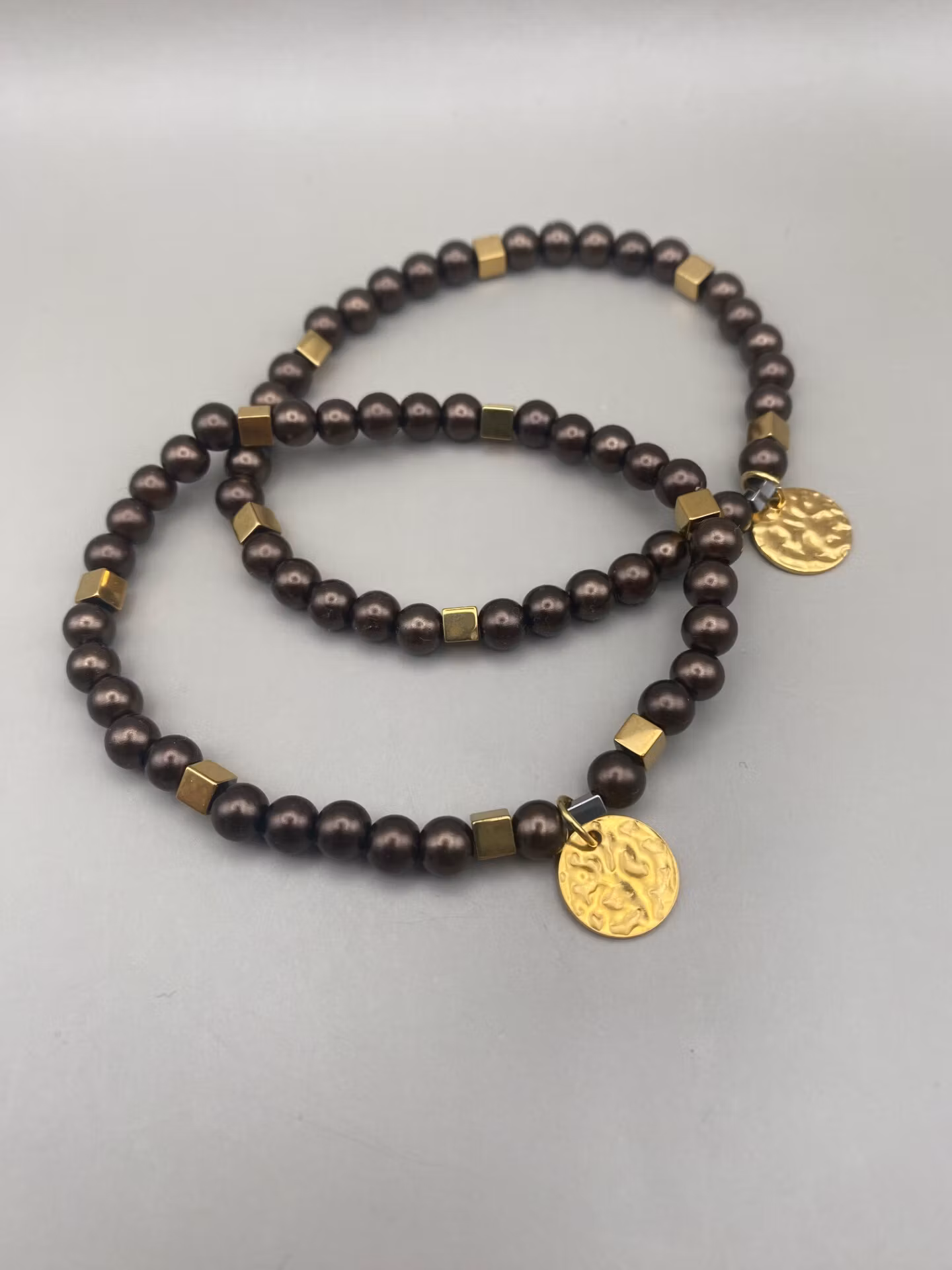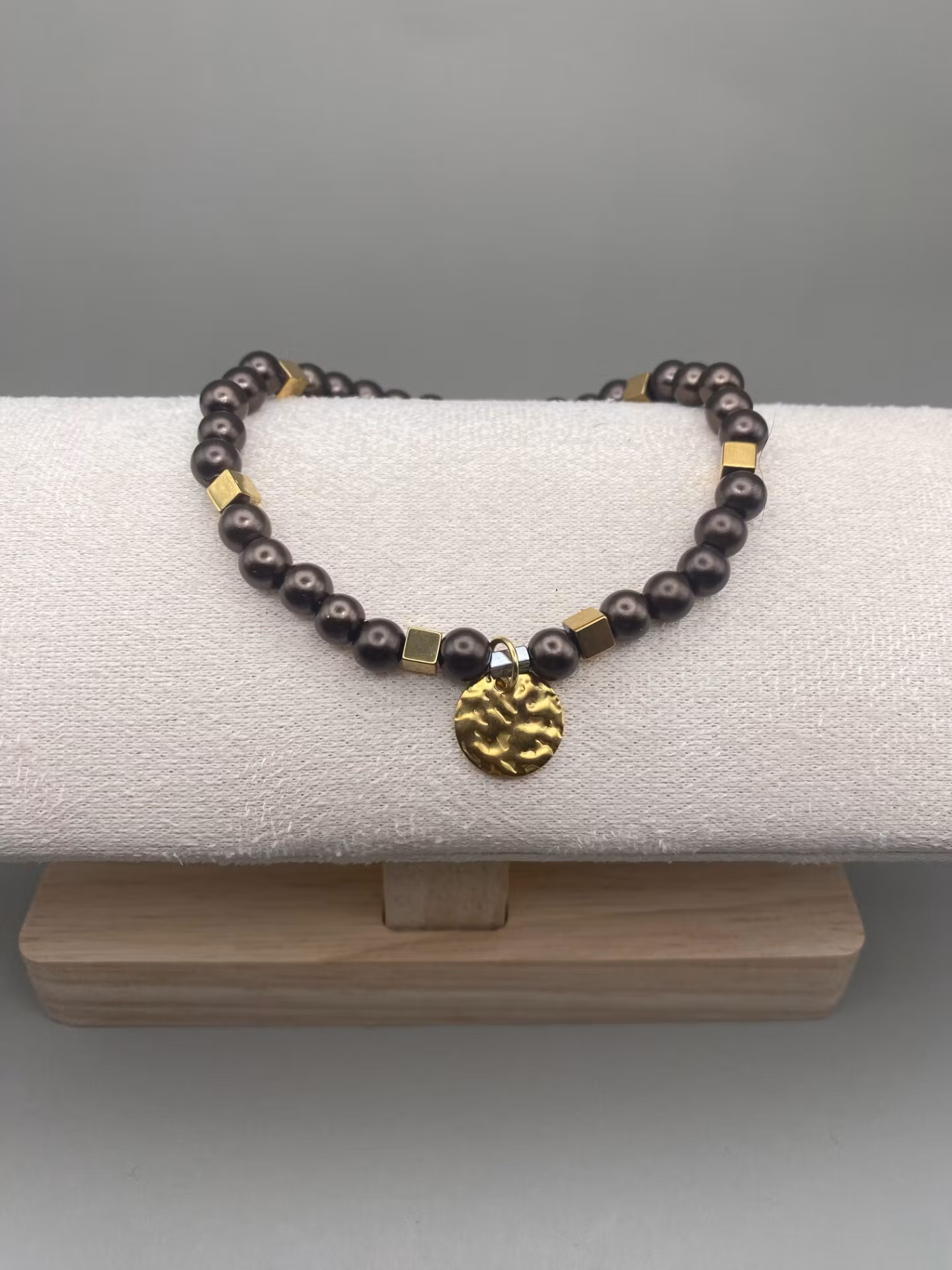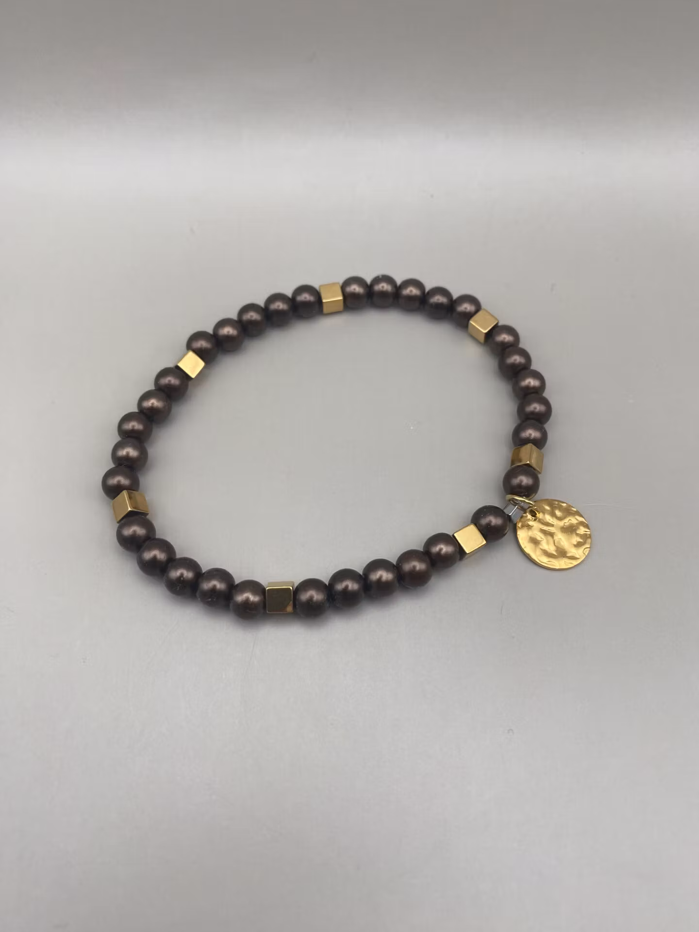 Stilrent armband i mörkbruna mellanstora pärlor, fyrkantiga guldfärgade hematitpärlor och berlock i form av dekorativ knackad rostfri guldfärgad bricka i blickfånget.