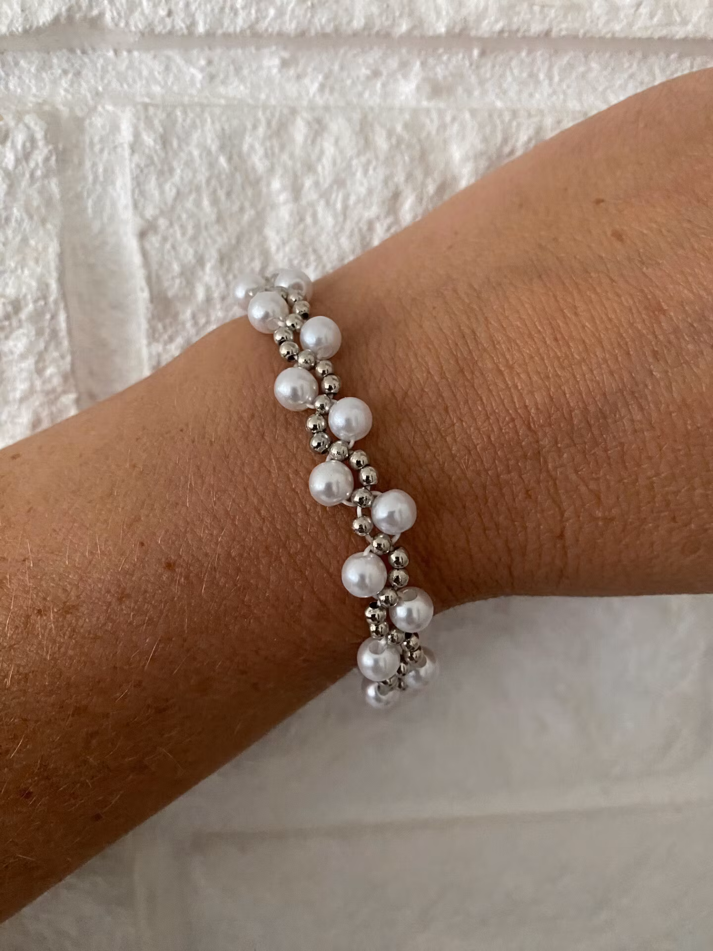 Superfint och elegant flerradigt armband med varvat kritvita högblanka mindre pärlor och små silverfärgade pärlor.
